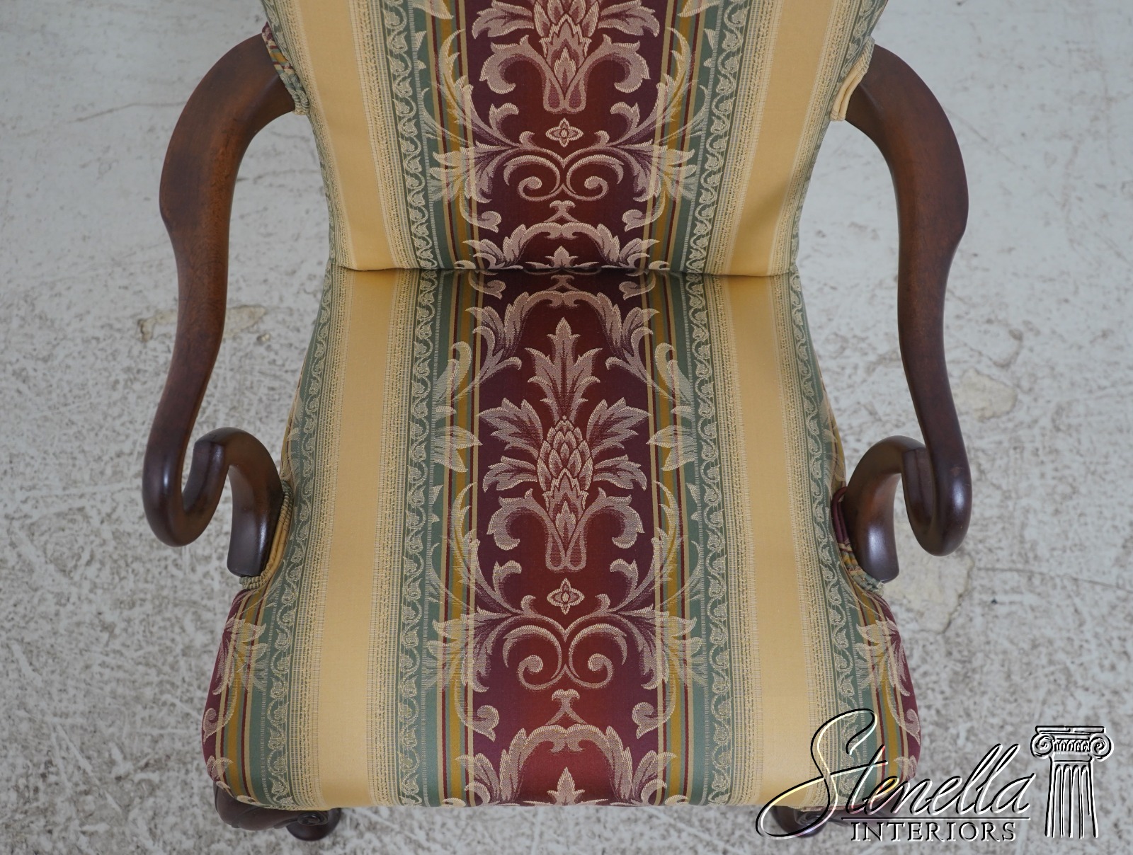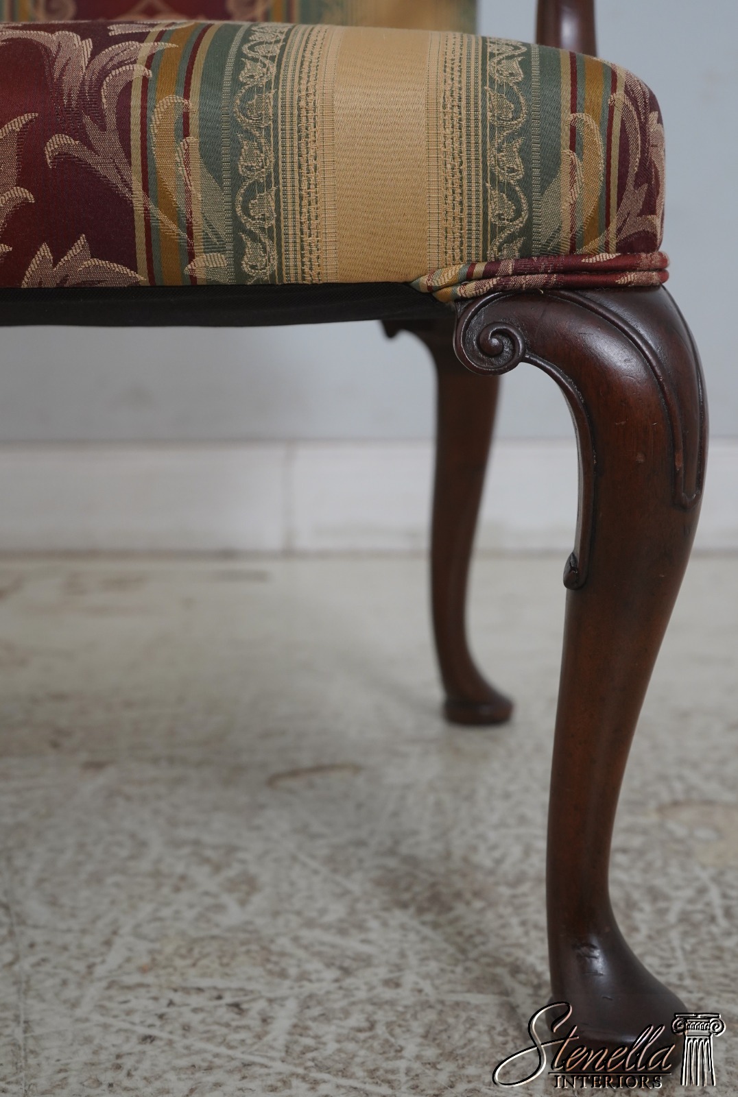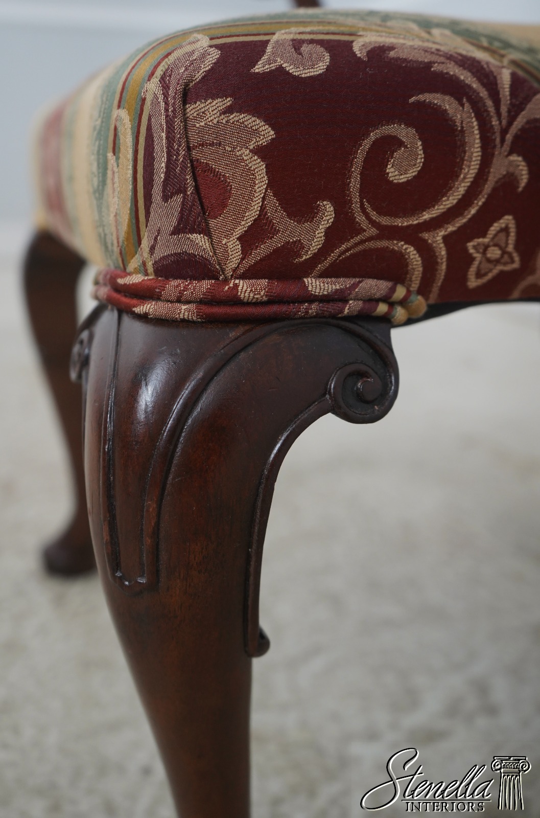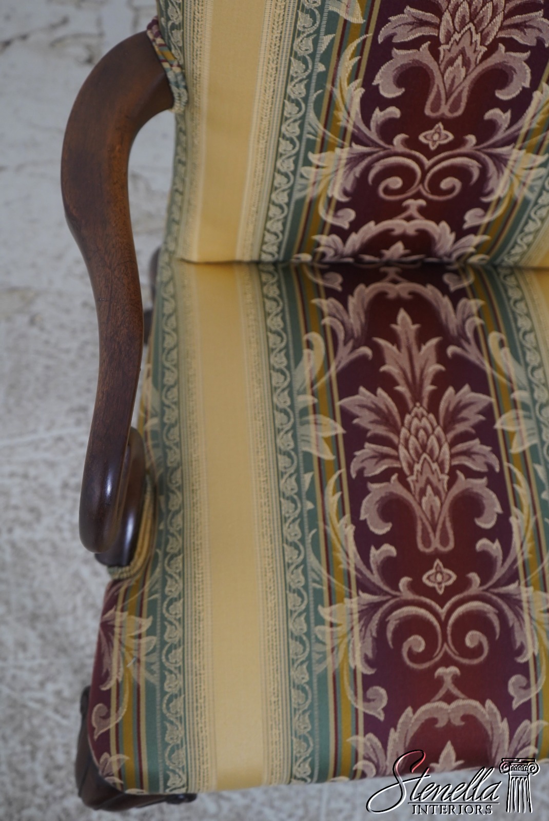 Details: Mahogany Fine Carved Details High Quality Construction 18 C. Design Chippendale Style Newly Upholstered w. New Damask Offered @ Fraction Original Retail Cost