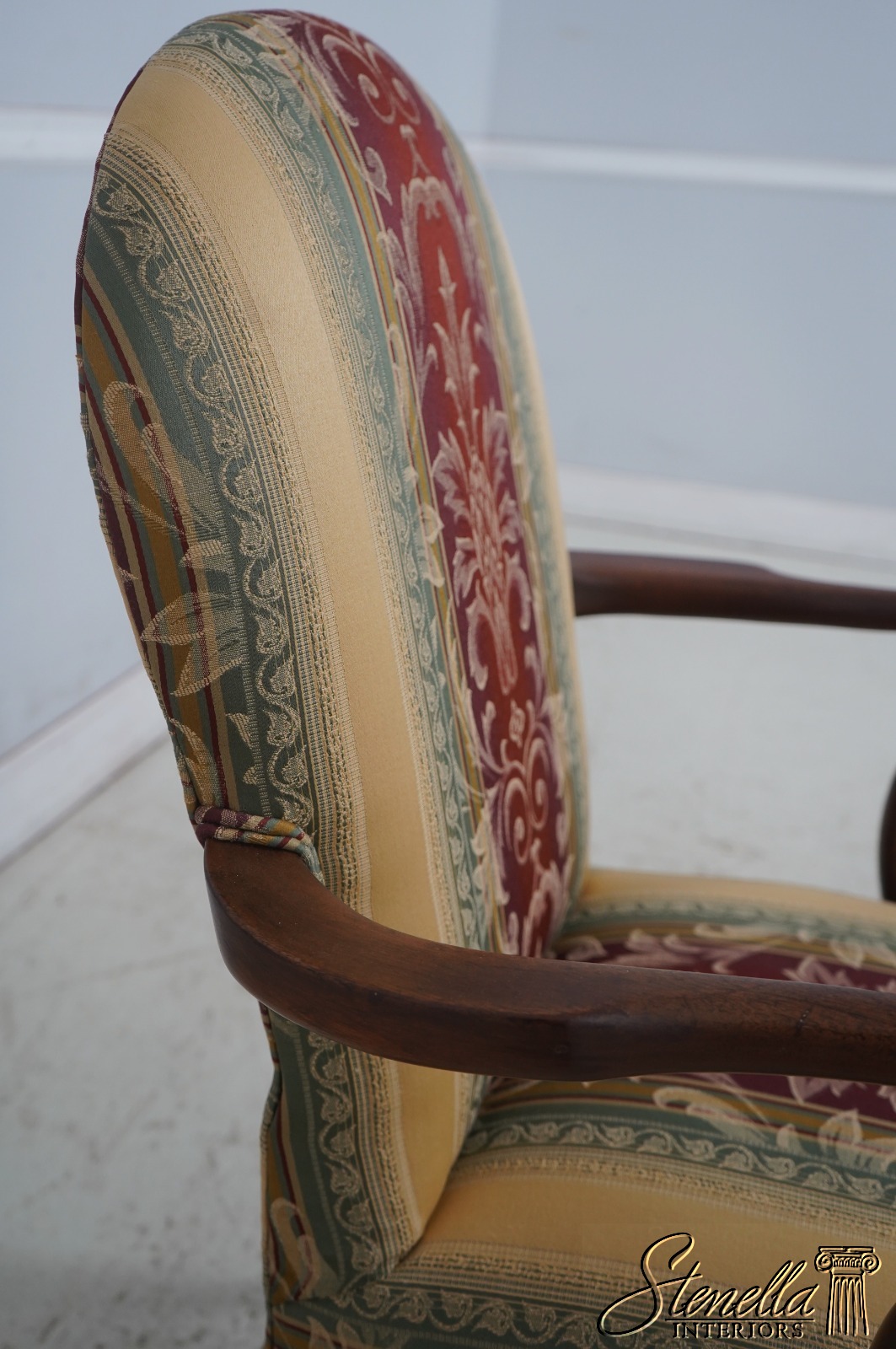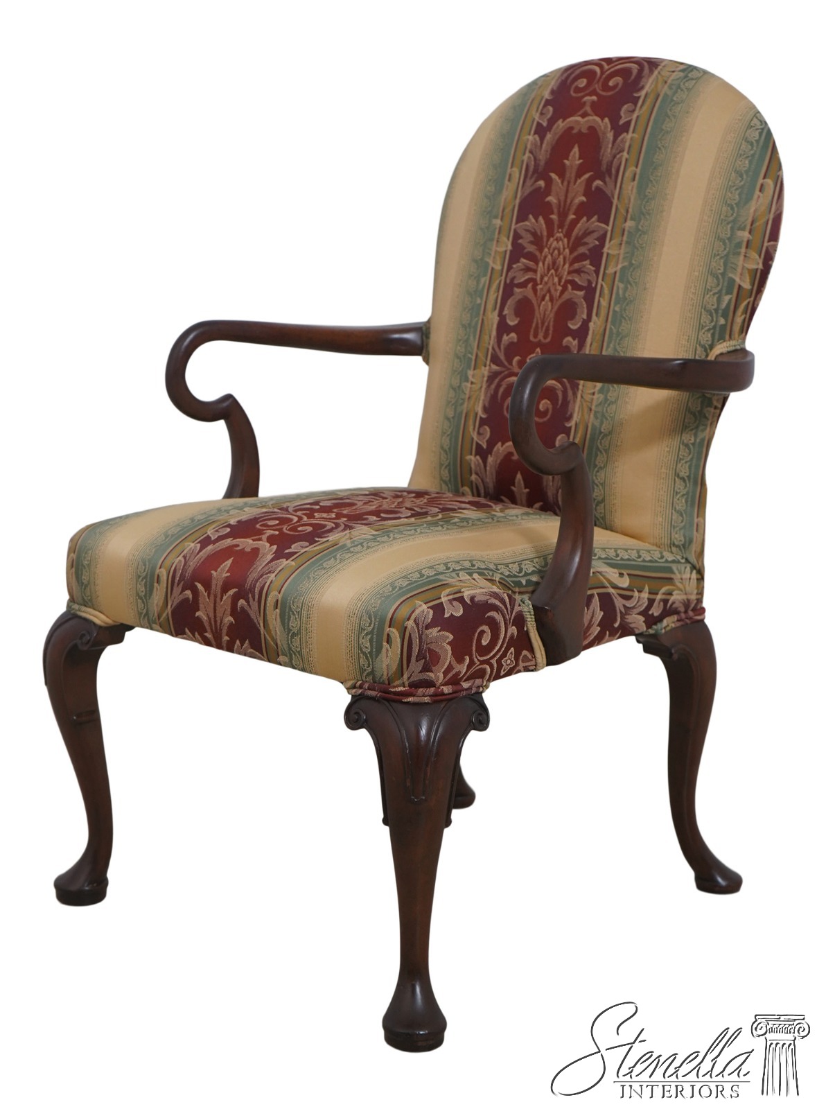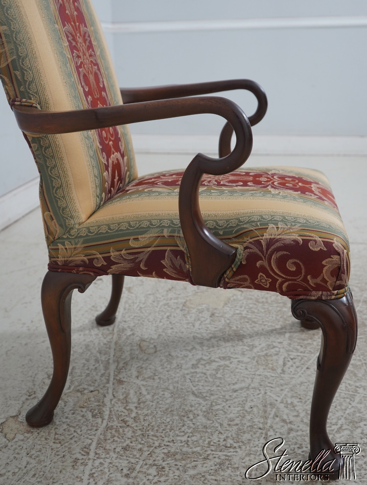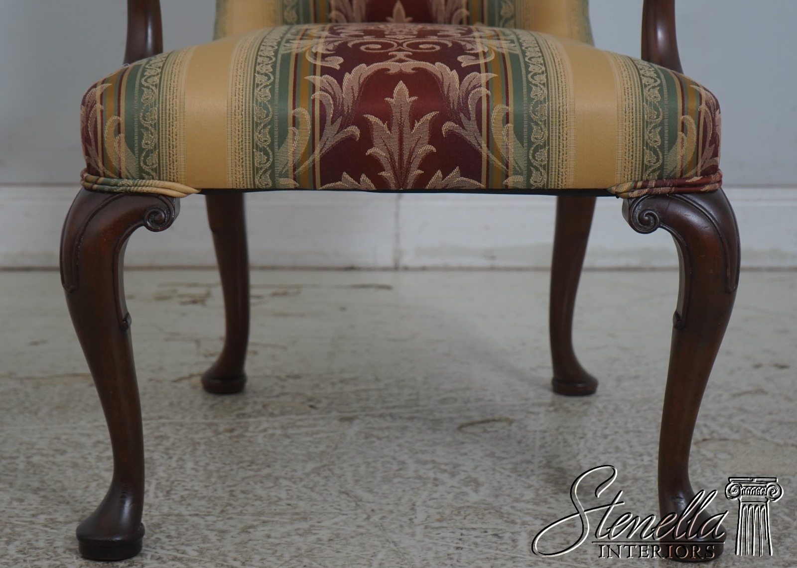 Details: Mahogany Fine Carved Details High Quality Construction 18 C. Design Chippendale Style Newly Upholstered w. New Damask Offered @ Fraction Original Retail Cost