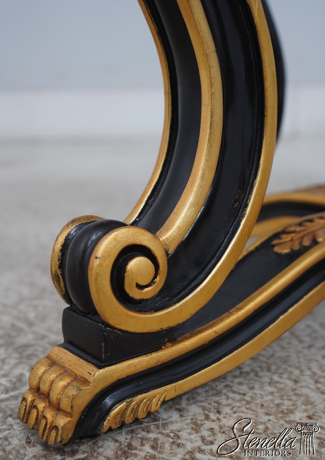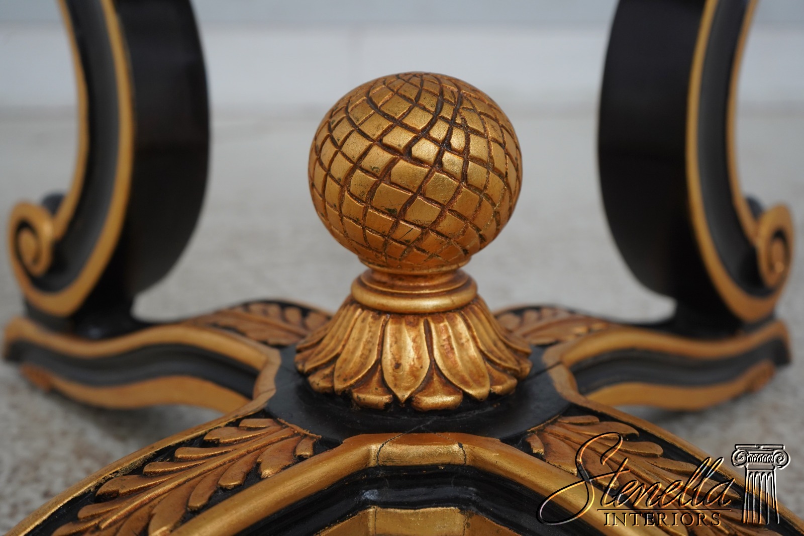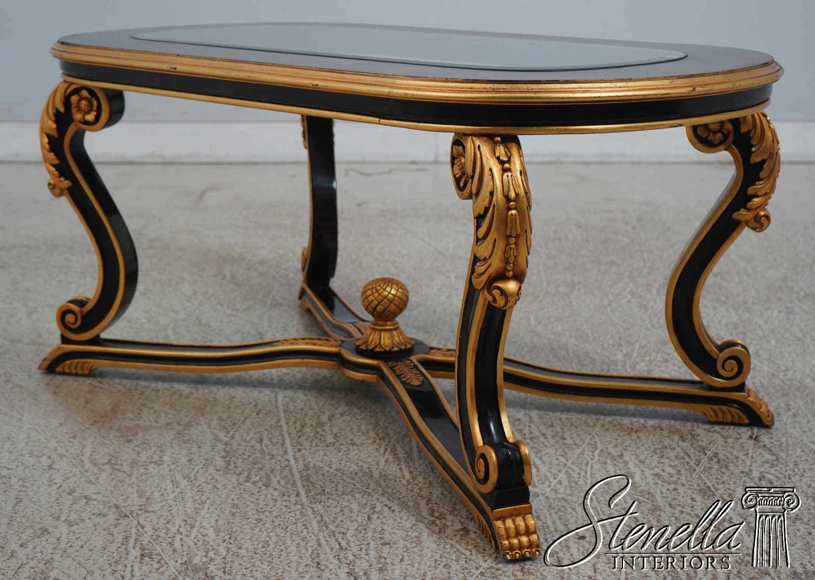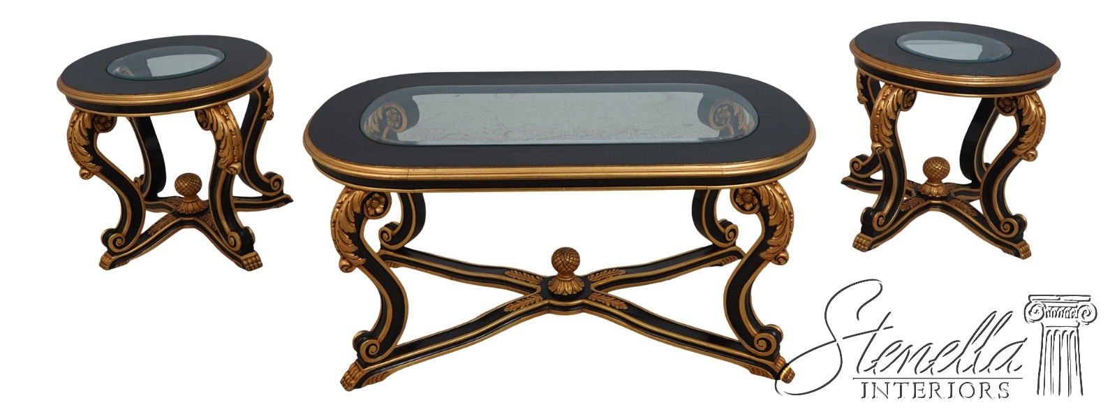Details: Ball & Claw Feet Fine Carved Details High Quality Construction Ebony Finish Glass Insert Tops Baroque Style Neoclassical Stretcher Base Frame Carved Artichoke In Center Scrolled Legs Un-Marked As To Manufacture Offered @ Fraction Original Retail Cost