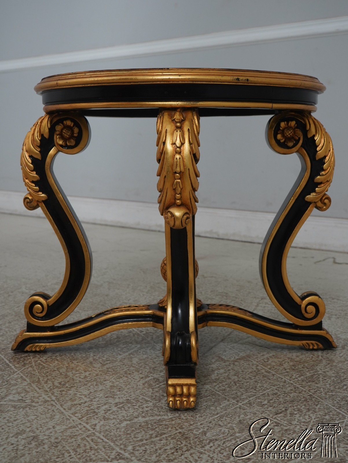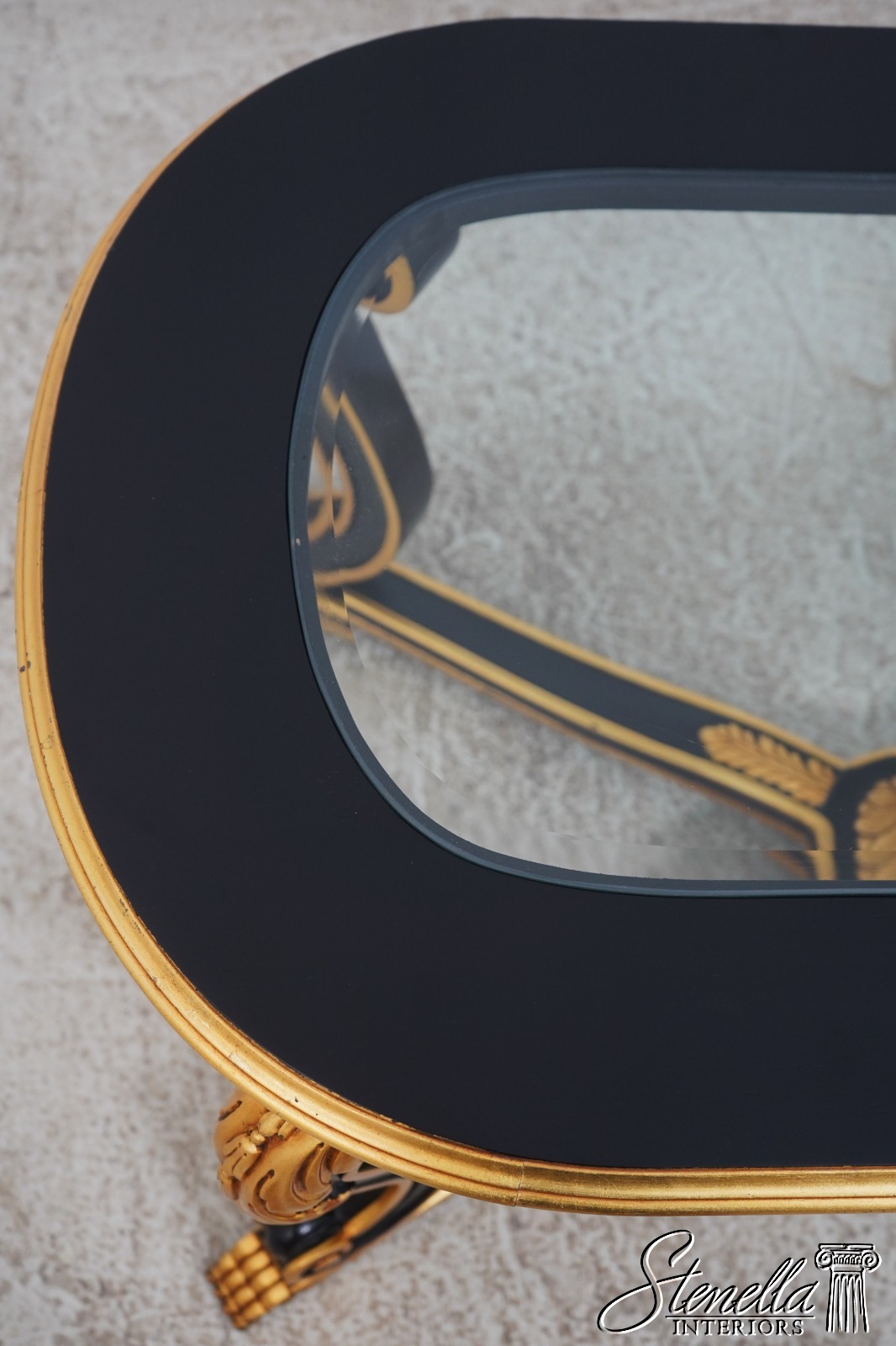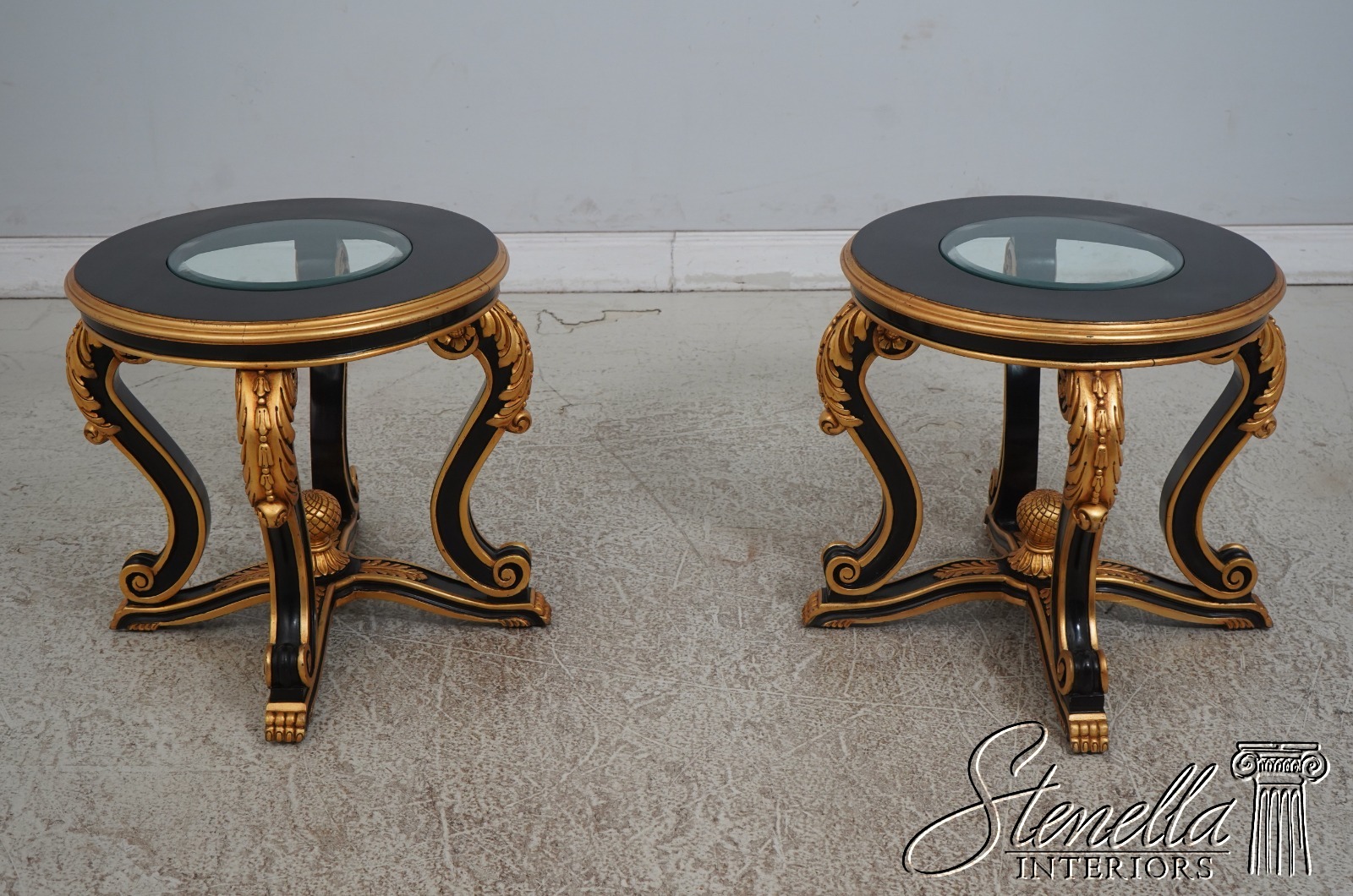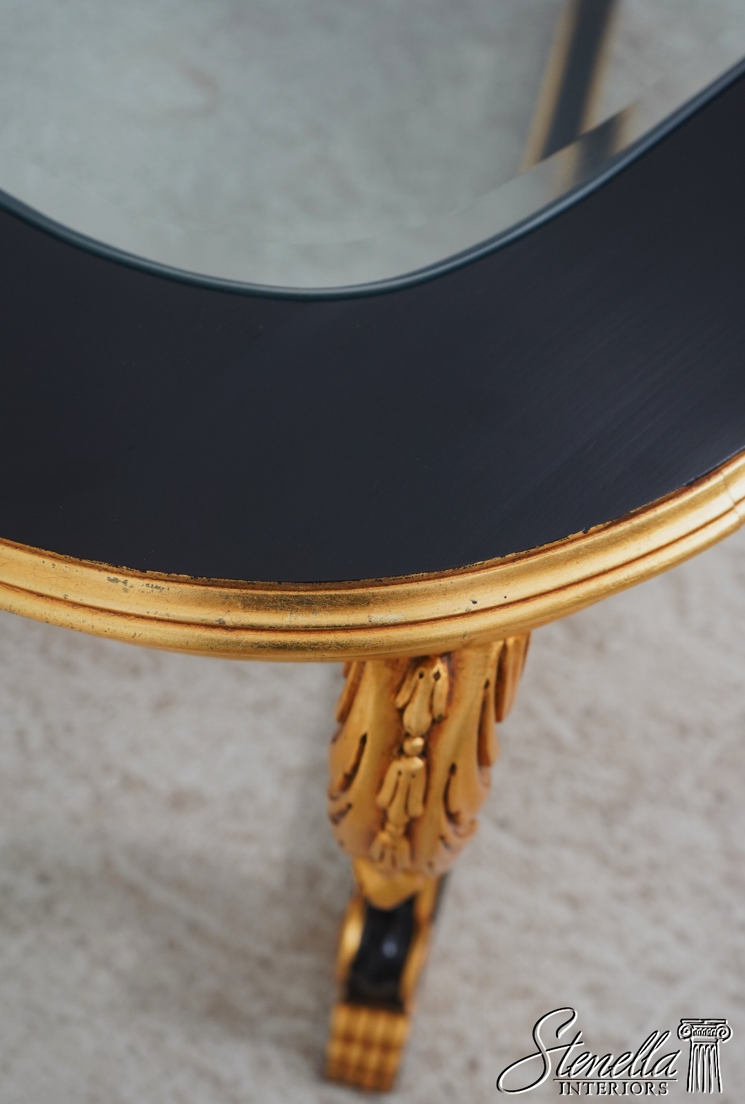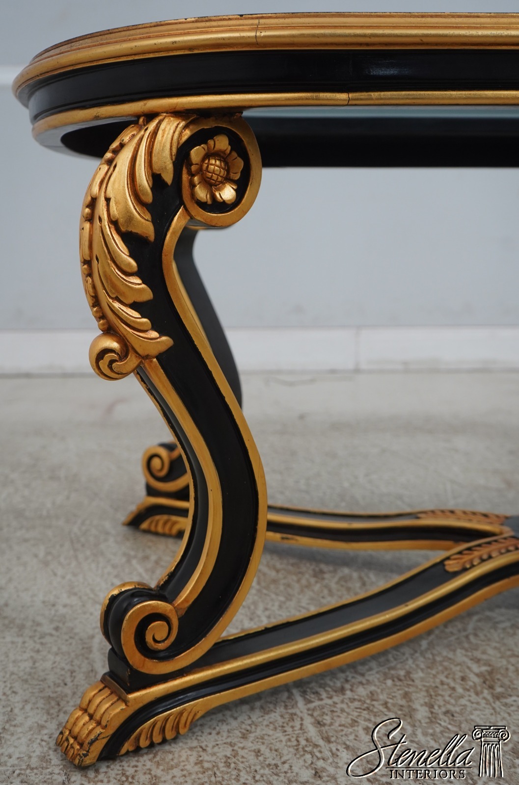 Details: Ball & Claw Feet Fine Carved Details High Quality Construction Ebony Finish Glass Insert Tops Baroque Style Neoclassical Stretcher Base Frame Carved Artichoke In Center Scrolled Legs Un-Marked As To Manufacture Offered @ Fraction Original Retail Cost
