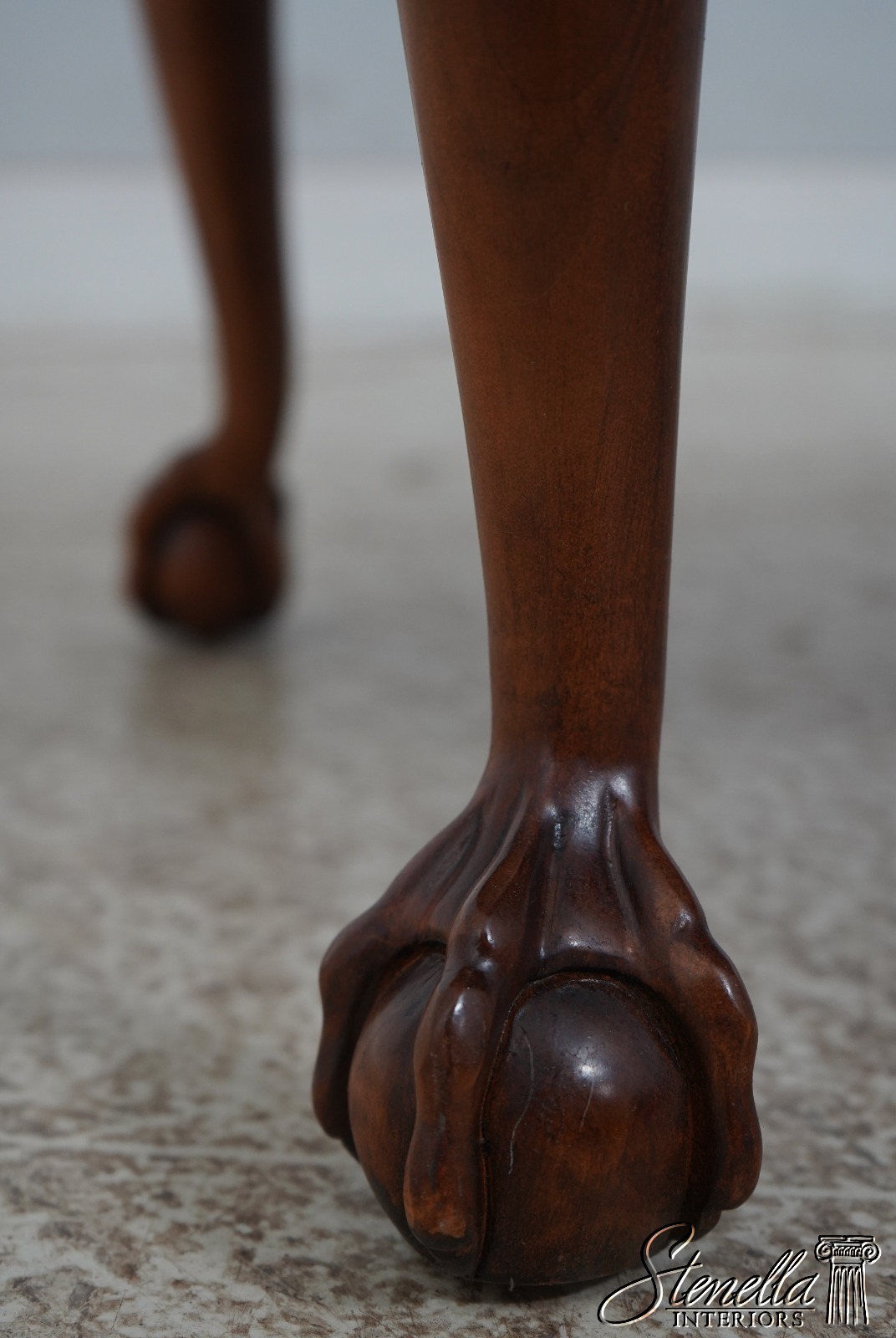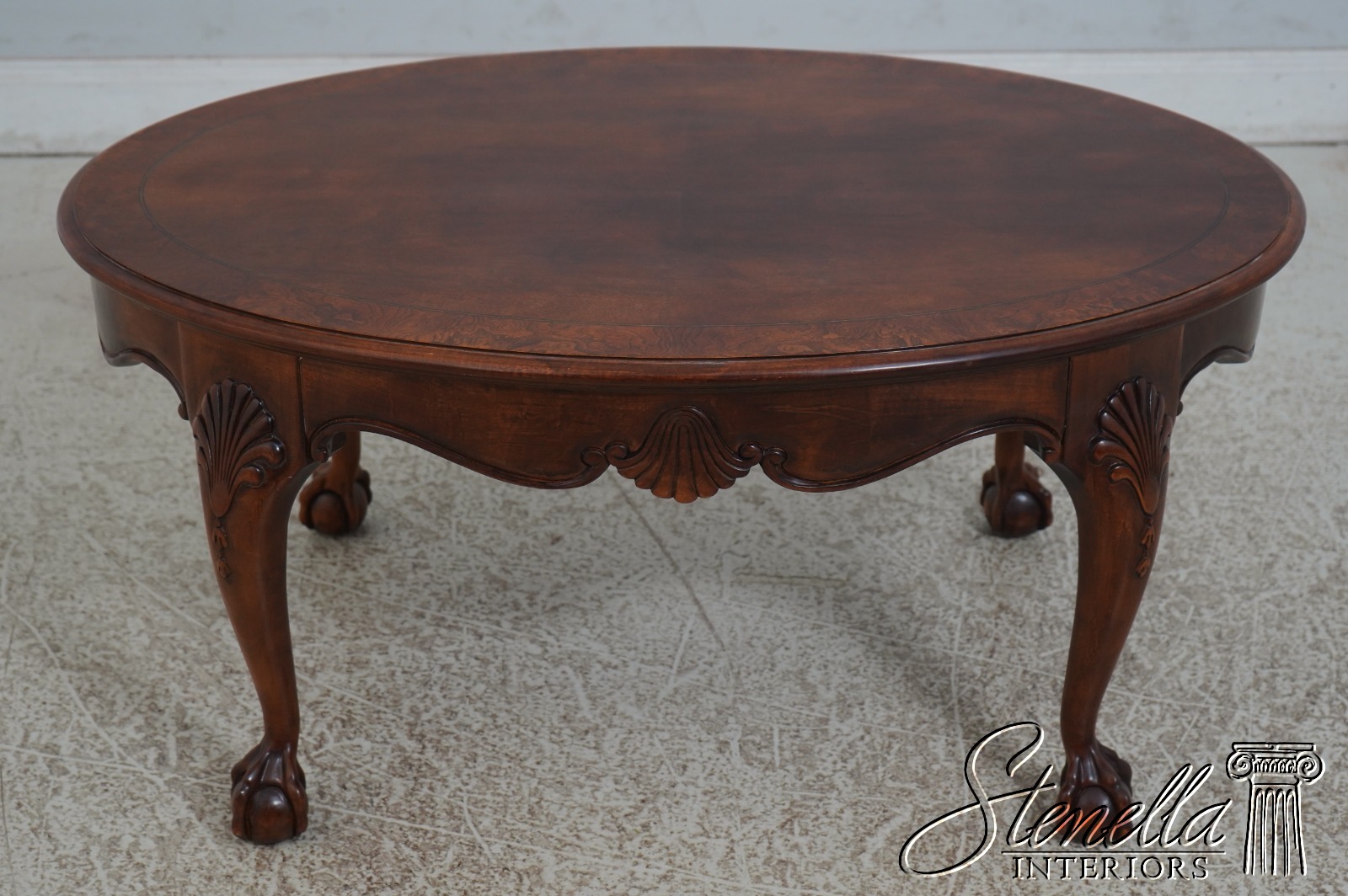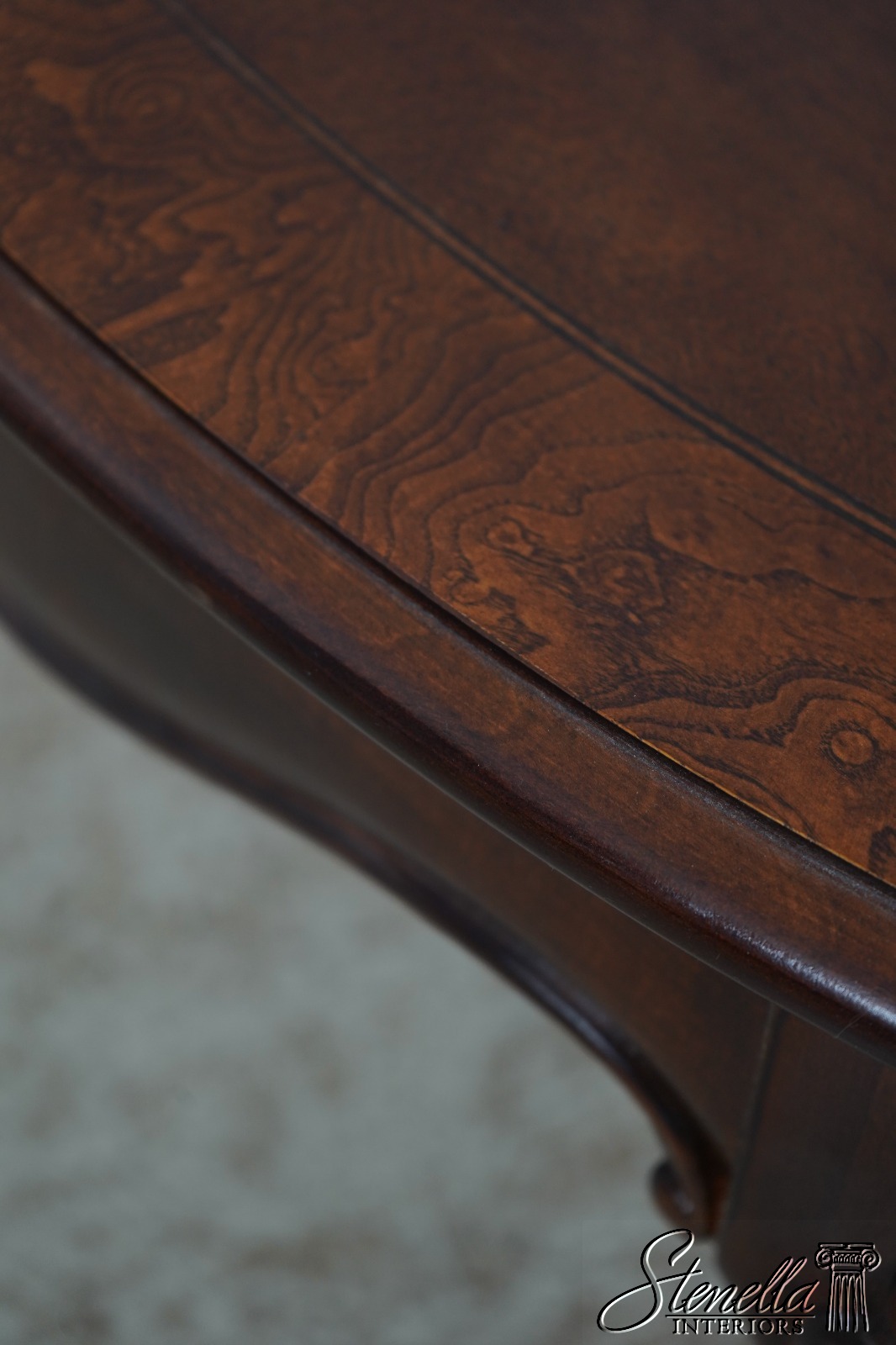 Details: Ball & Claw Feet Fine Carved Details High Quality Construction Nice Inlay Work Throughout Queen Anne Legs & Pad Feet English Style Mahogany Finish w. Burl Elm Banded Border Scalloped Apron Un-Marked As To Manufacture Offered @ Fraction Original Retail Cost