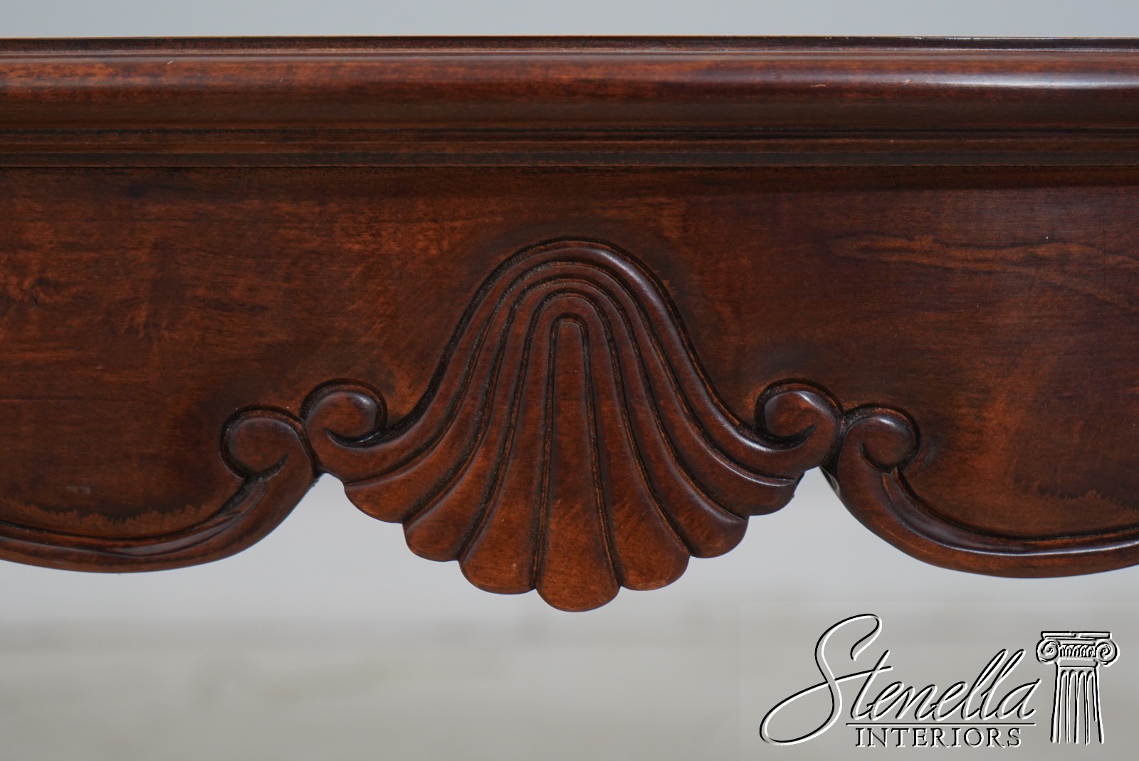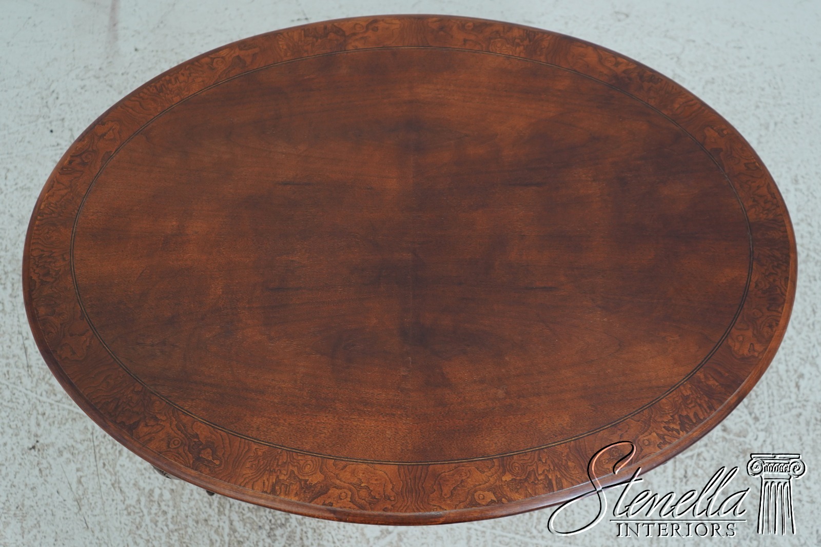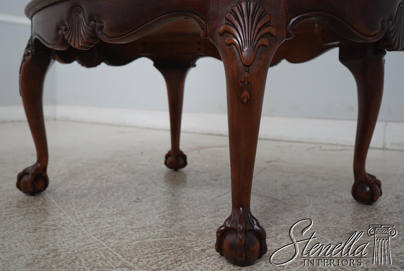 Details: Ball & Claw Feet Fine Carved Details High Quality Construction Nice Inlay Work Throughout Queen Anne Legs & Pad Feet English Style Mahogany Finish w. Burl Elm Banded Border Scalloped Apron Un-Marked As To Manufacture Offered @ Fraction Original Retail Cost