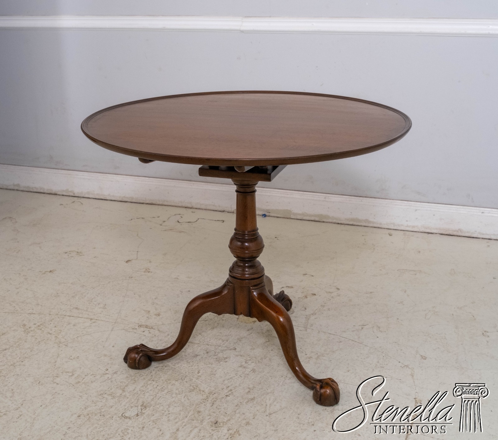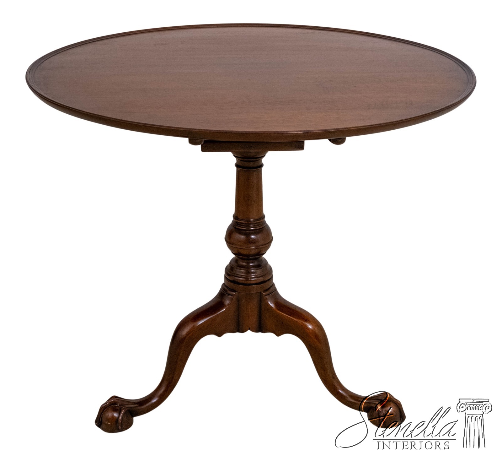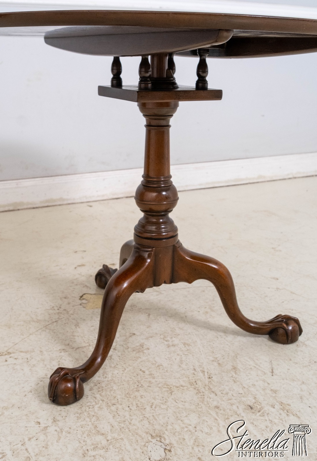 Details: The claw and ball feet terminating the gracefully curved legs and the well proportioned turned pedestal identify it as of the Chippendale period about 1760. Hand turned top of solid mahogany and posts of a heavy single piece of mahogany. Legs are hand dovetailed into post and braced on the bottom with handmade iron support. Claw and ball. feet are hand carved. Tilt-top with birdcage, collar and wedge key allowing top to swivel. Specially made top catch of brass duplicates the original antique.