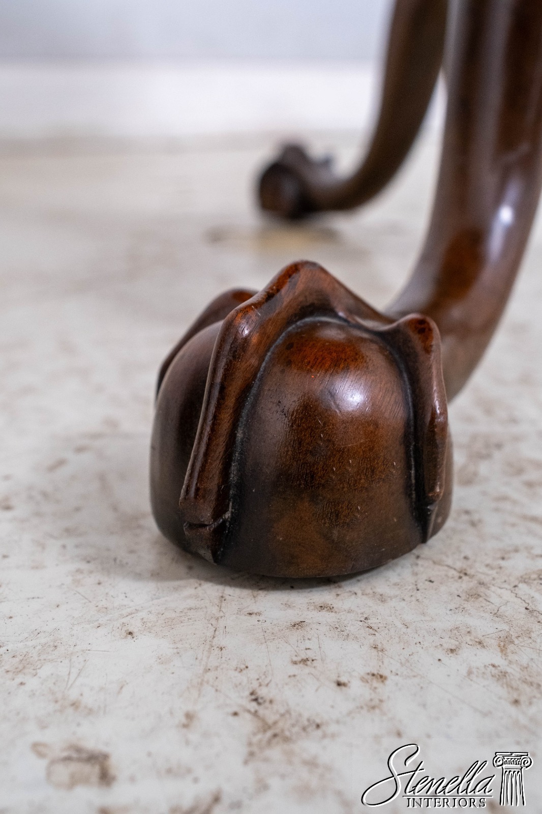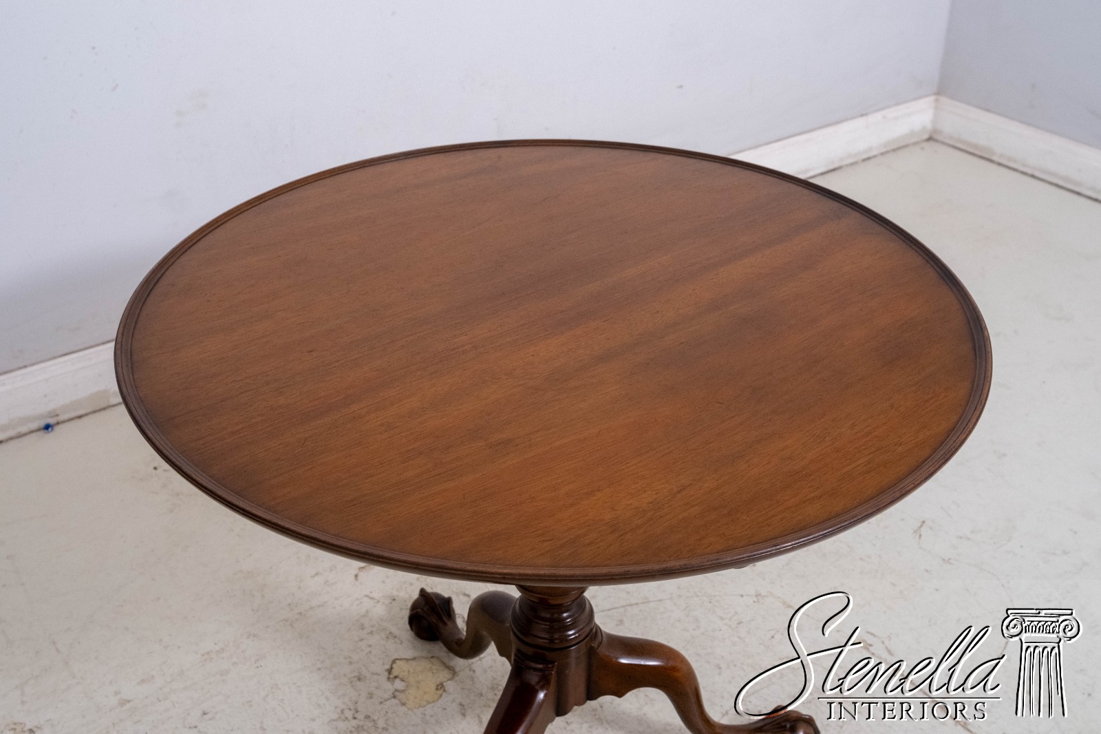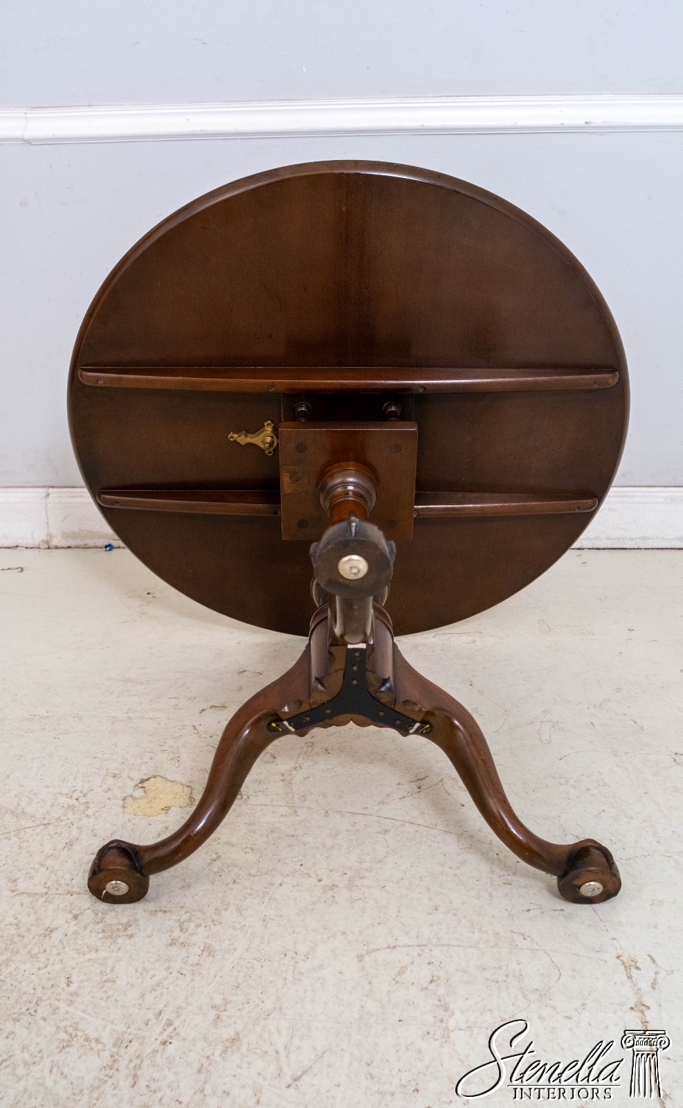 Details: The claw and ball feet terminating the gracefully curved legs and the well proportioned turned pedestal identify it as of the Chippendale period about 1760. Hand turned top of solid mahogany and posts of a heavy single piece of mahogany. Legs are hand dovetailed into post and braced on the bottom with handmade iron support. Claw and ball. feet are hand carved. Tilt-top with birdcage, collar and wedge key allowing top to swivel. Specially made top catch of brass duplicates the original antique.