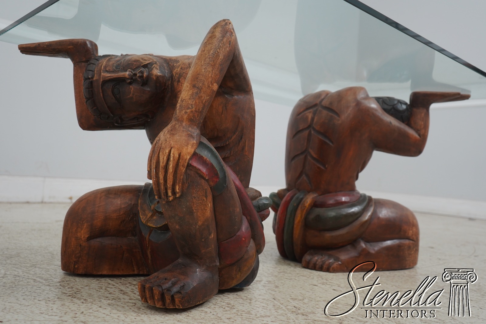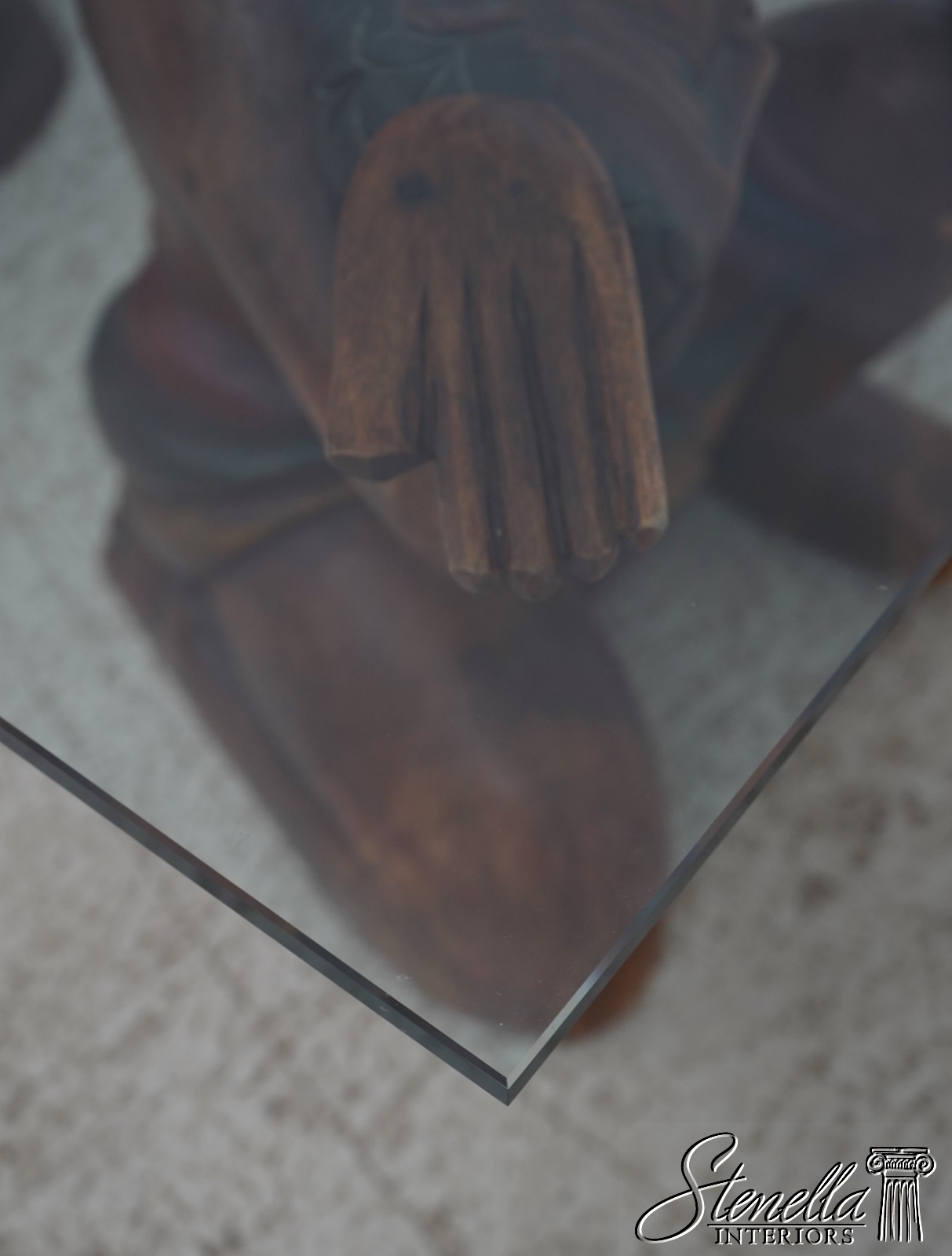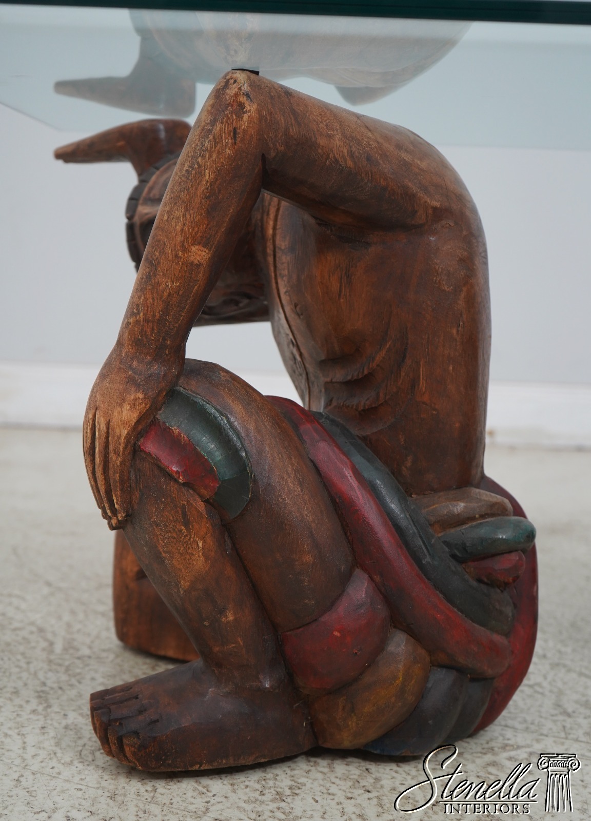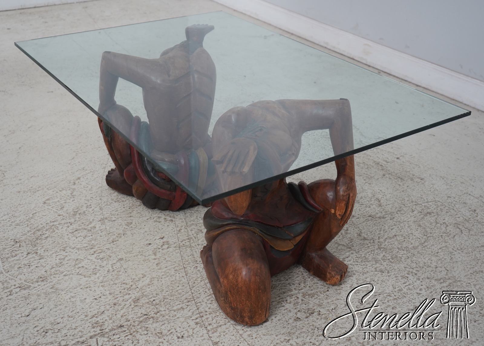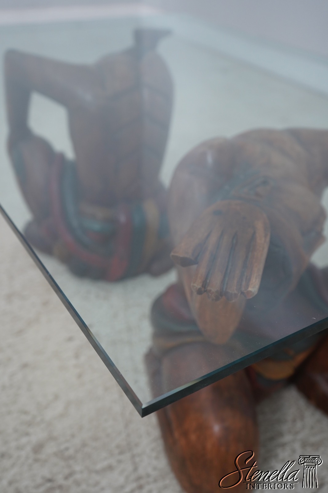 F63878EC: Asian Figural Carved Base Glass Top Coffee Table