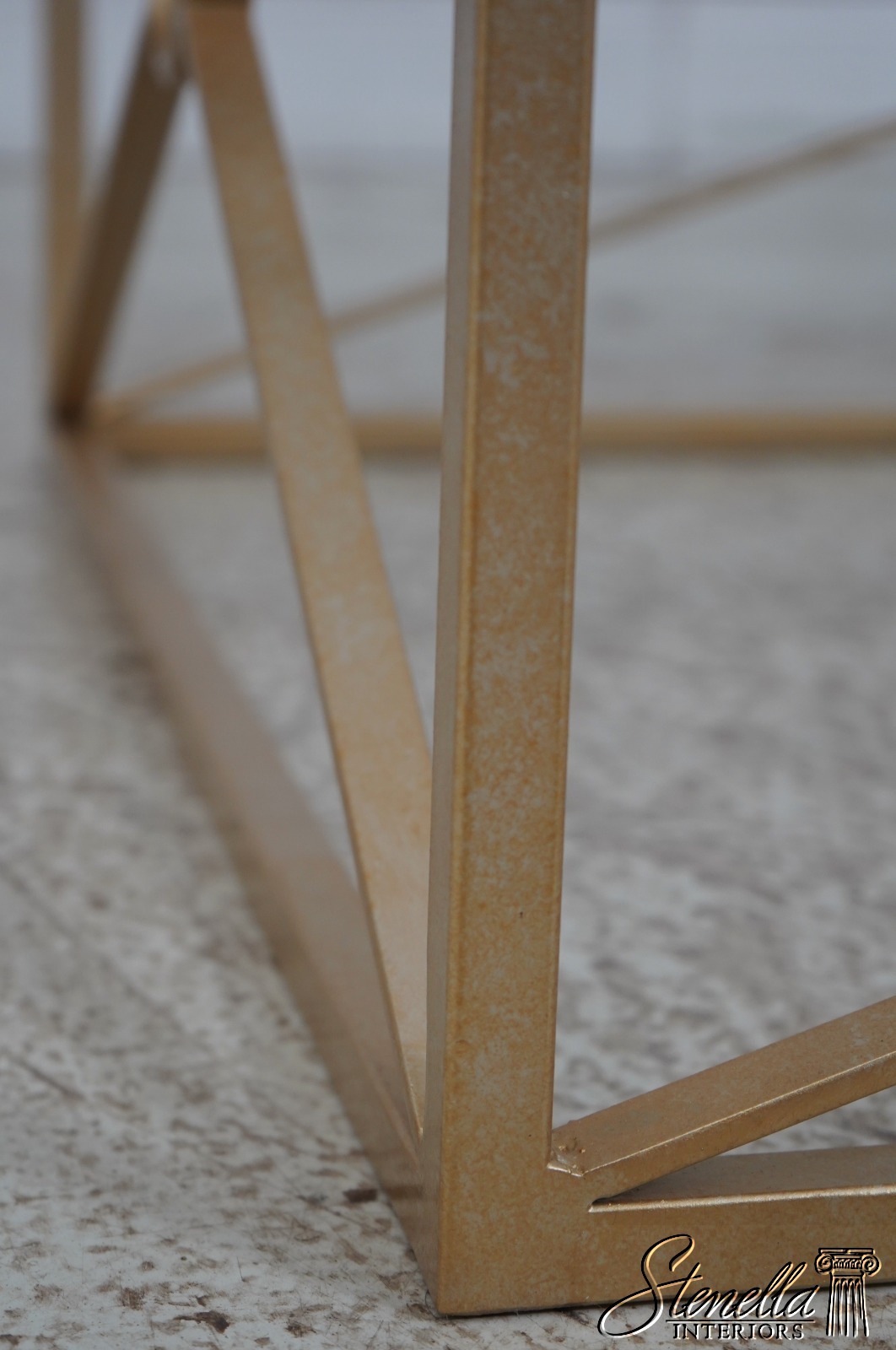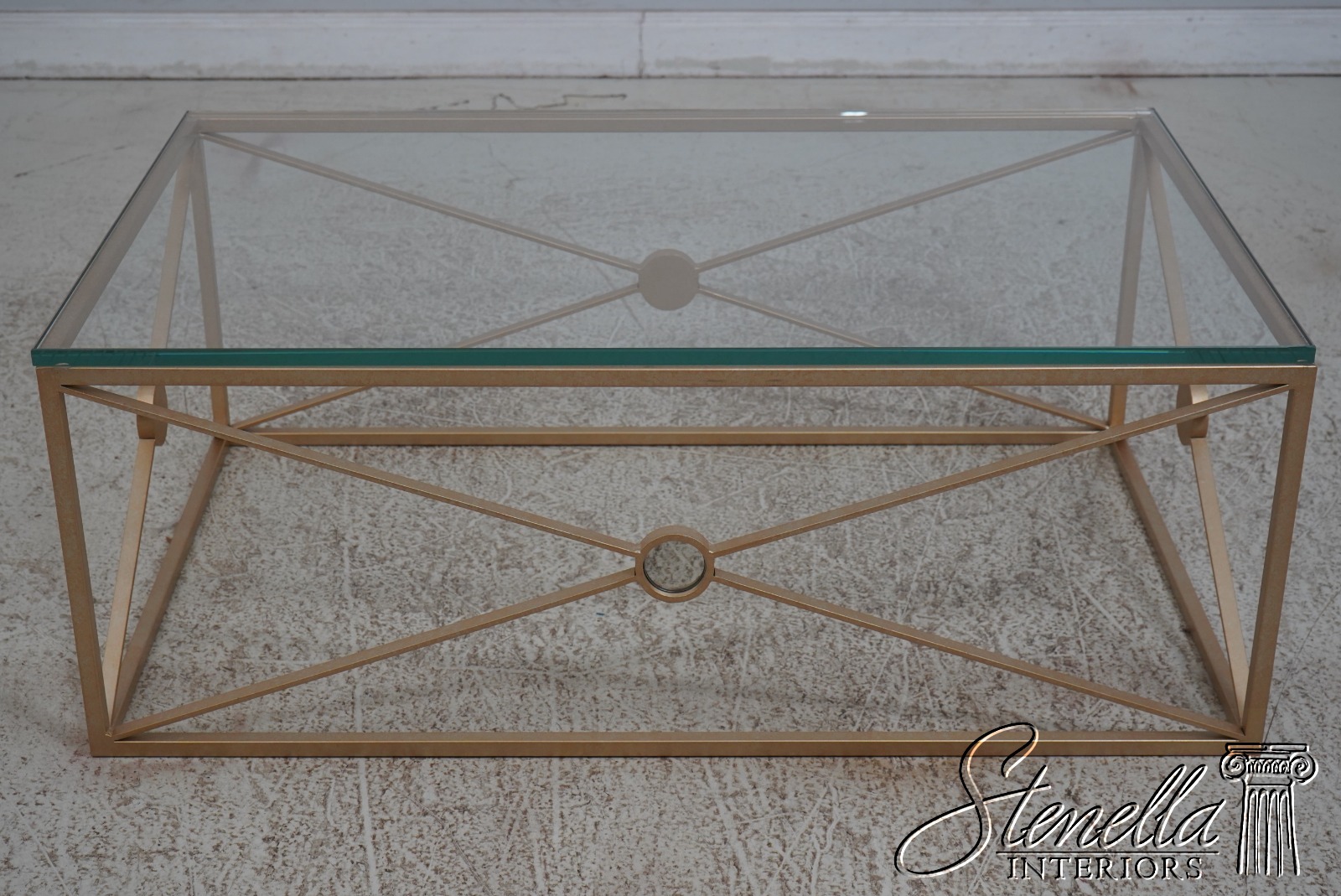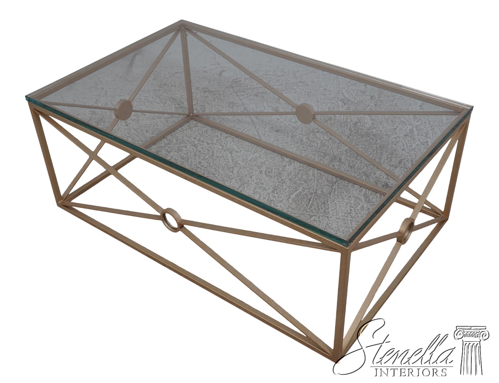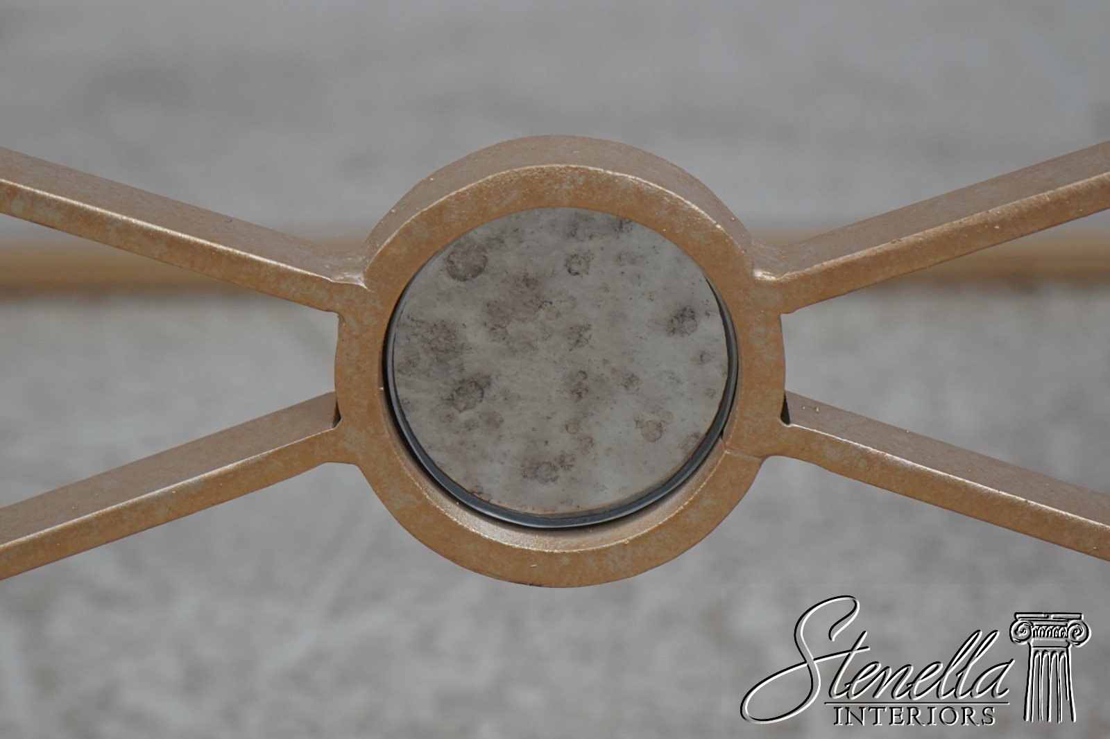 Details: Stunning Gold Finish Metal Base High Quality Construction Thick Glass Top Distressed Mirror Medallions Round Distressed Mirror Accent Panels Modern Design Un-Marked As To Manufacture Offered @ Fraction Original Retail Cost
