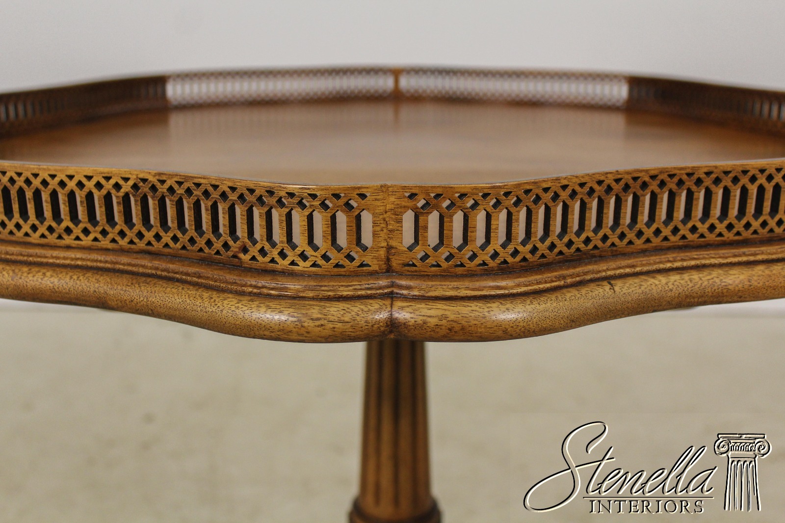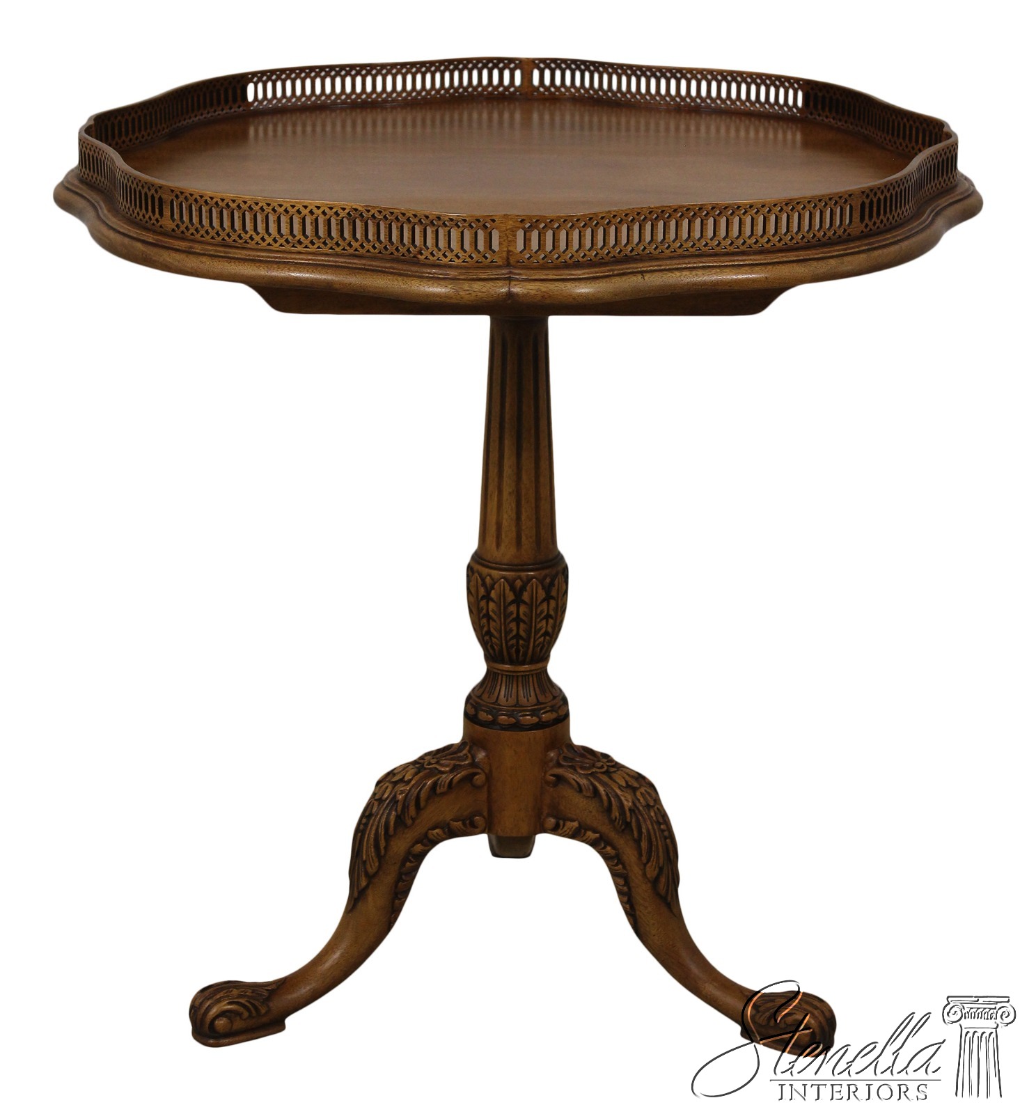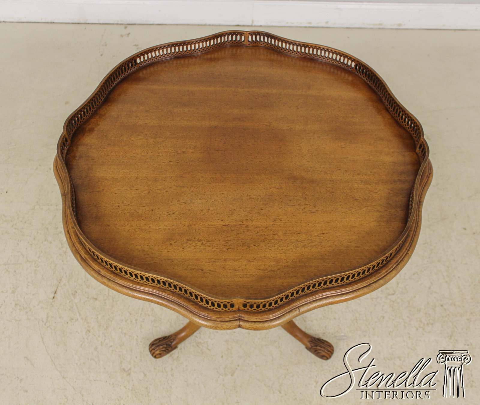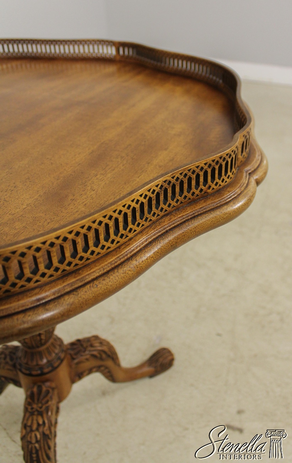 Details: High Quality Construction Medium Brown Mahogany Finish 18 C. Design Traditional Style Intricate Pierces Scalloped Gallery Top Nice Carved Pedestal Base Offered @ Fraction Original Retail Cost
