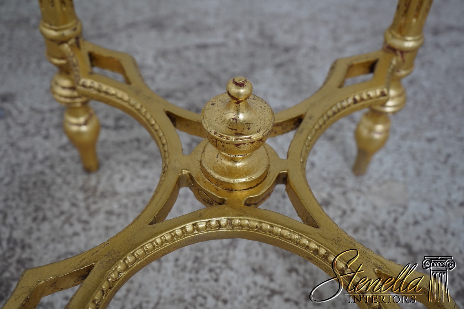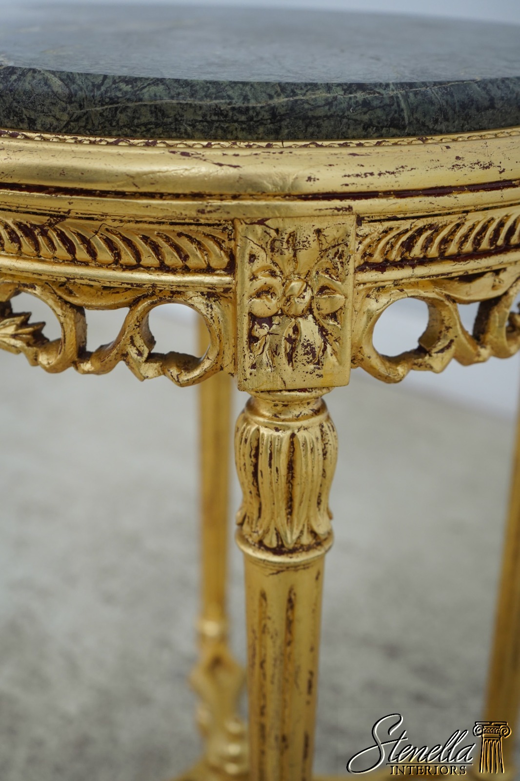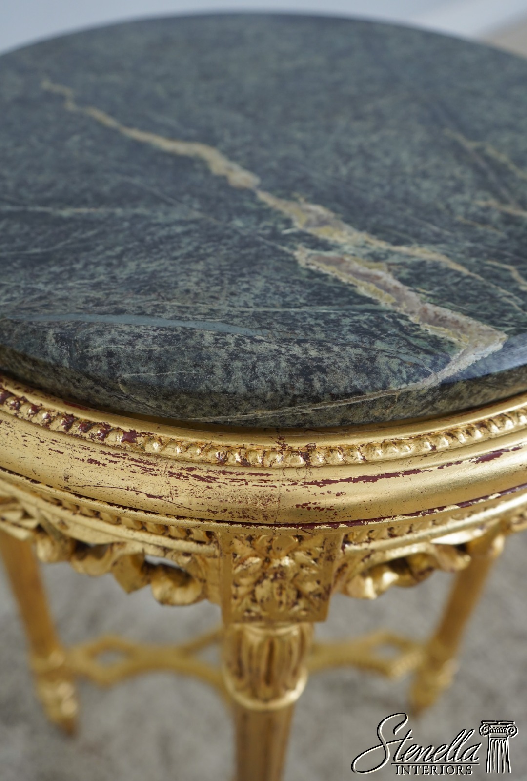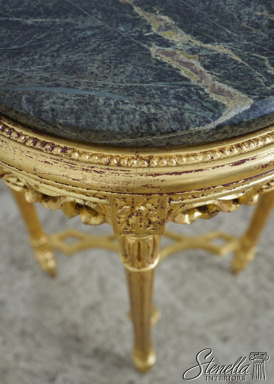 Details: Gold Gilt Finish Quality Construction Green Marble Top Stretcher Base