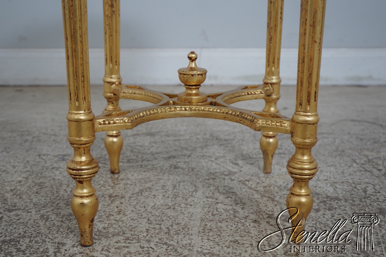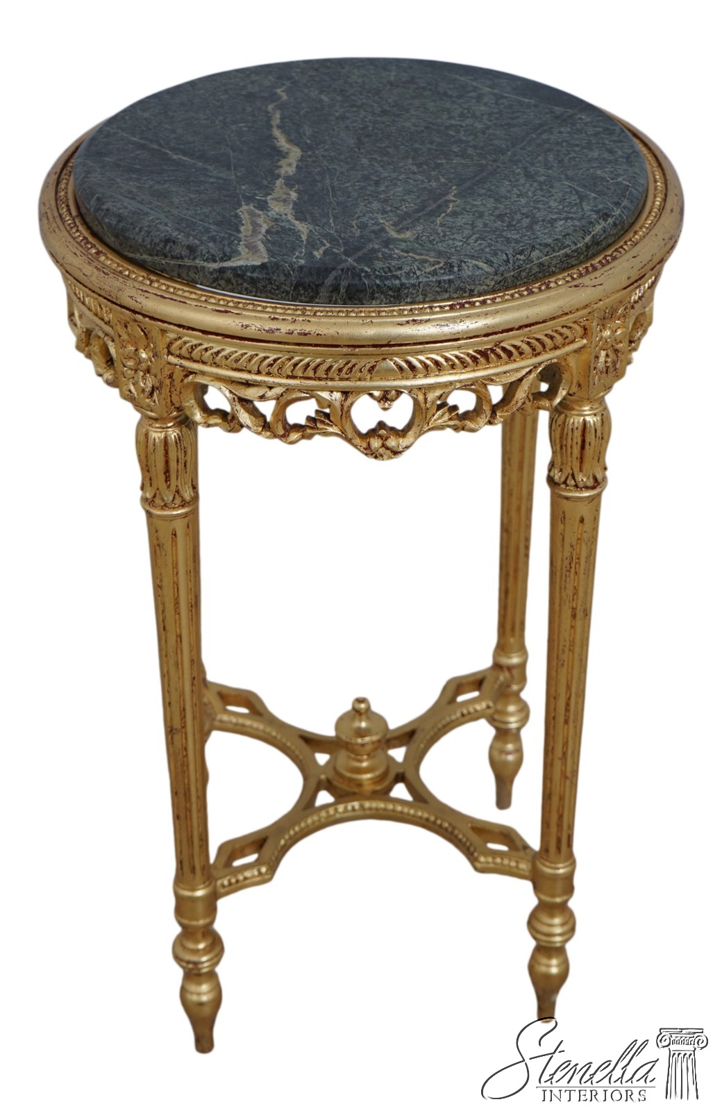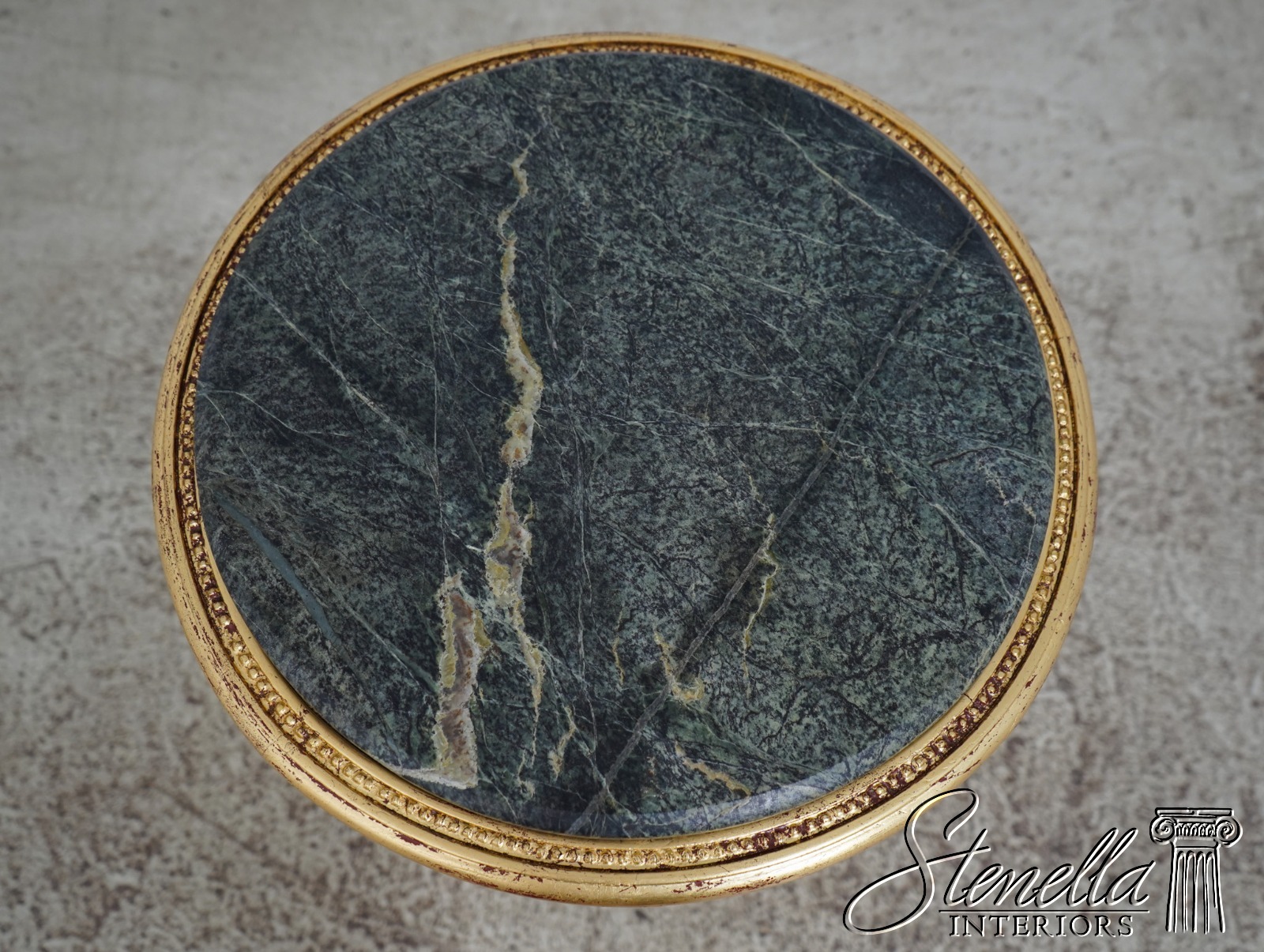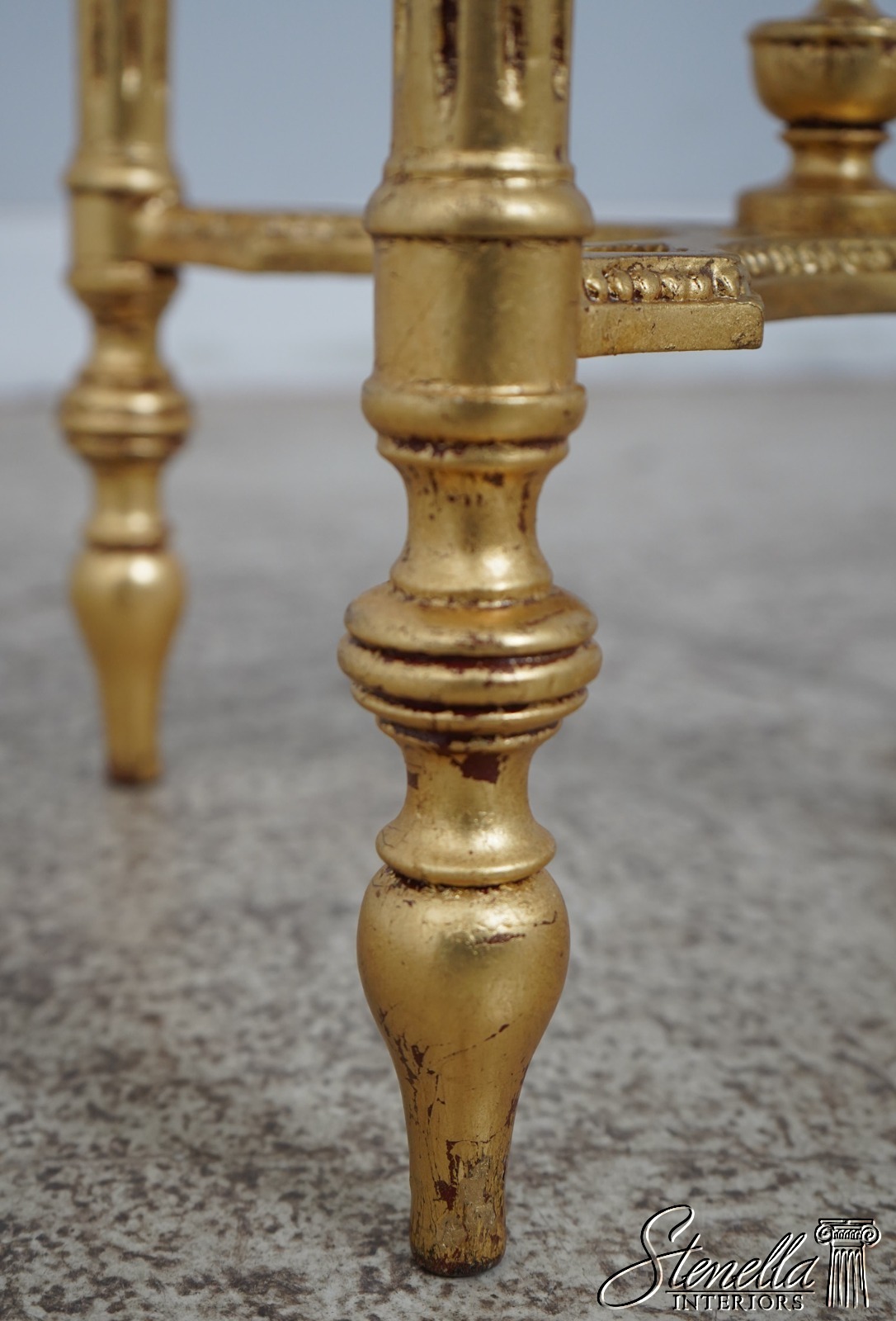 Details: Gold Gilt Finish Quality Construction Green Marble Top Stretcher Base