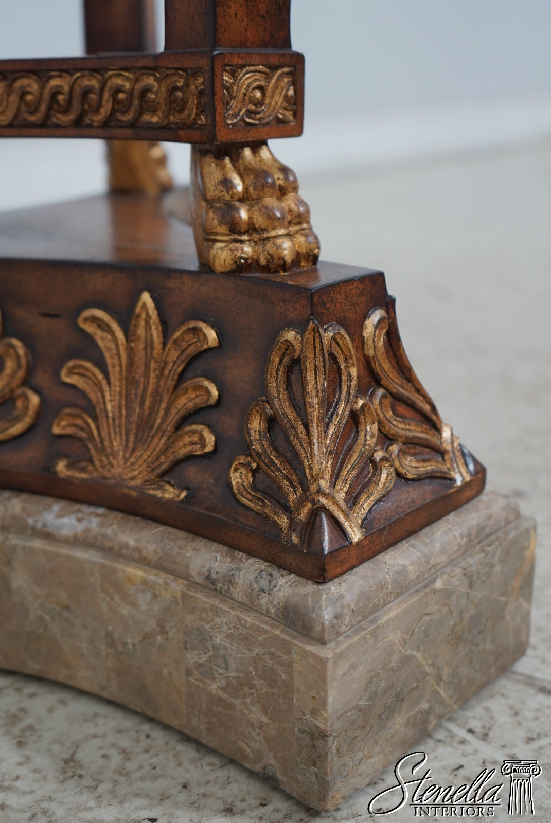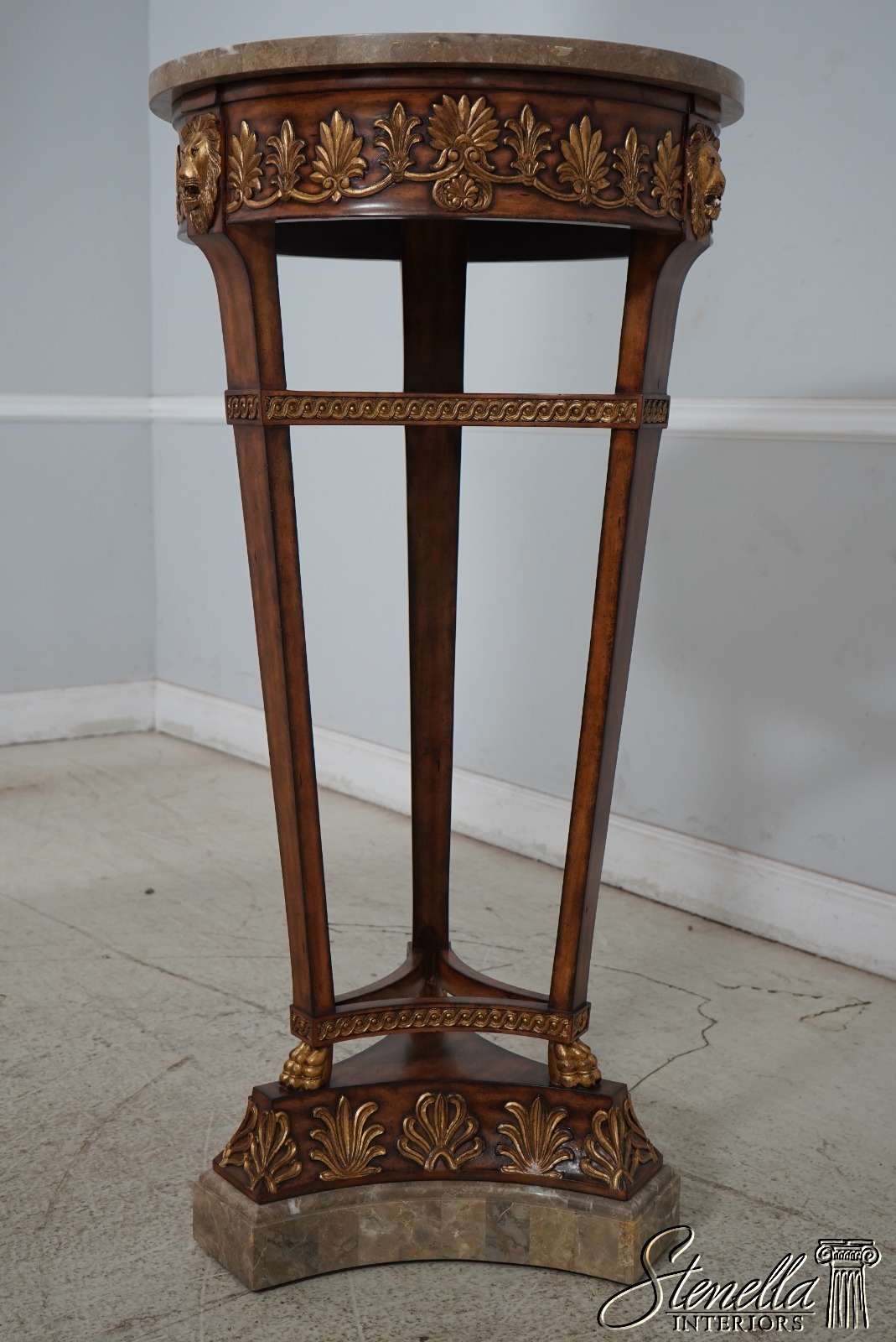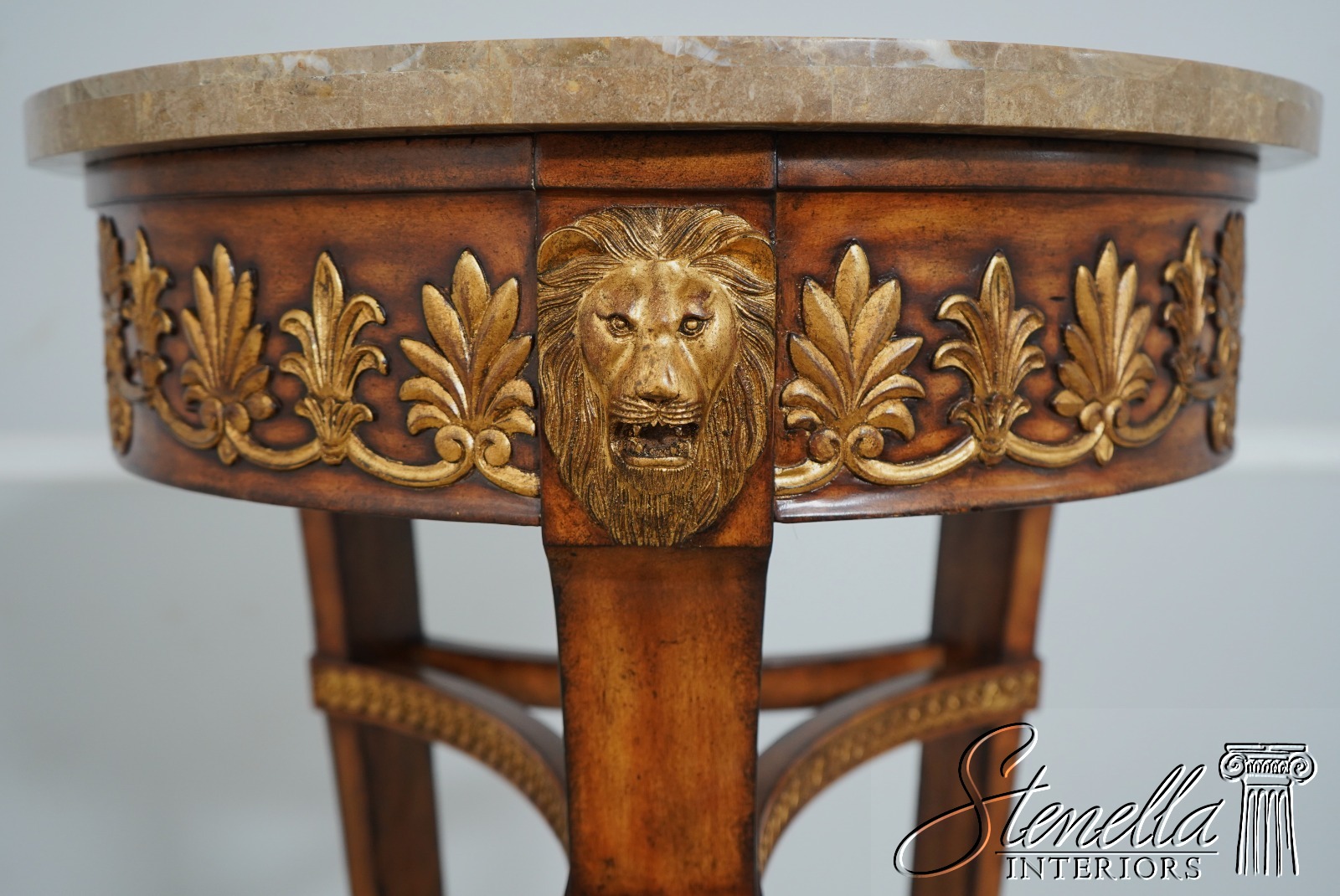 Details: Quality Construction Gold Highlights Lion Mask Face Details Neoclassical Design Matte Finish Marble Top