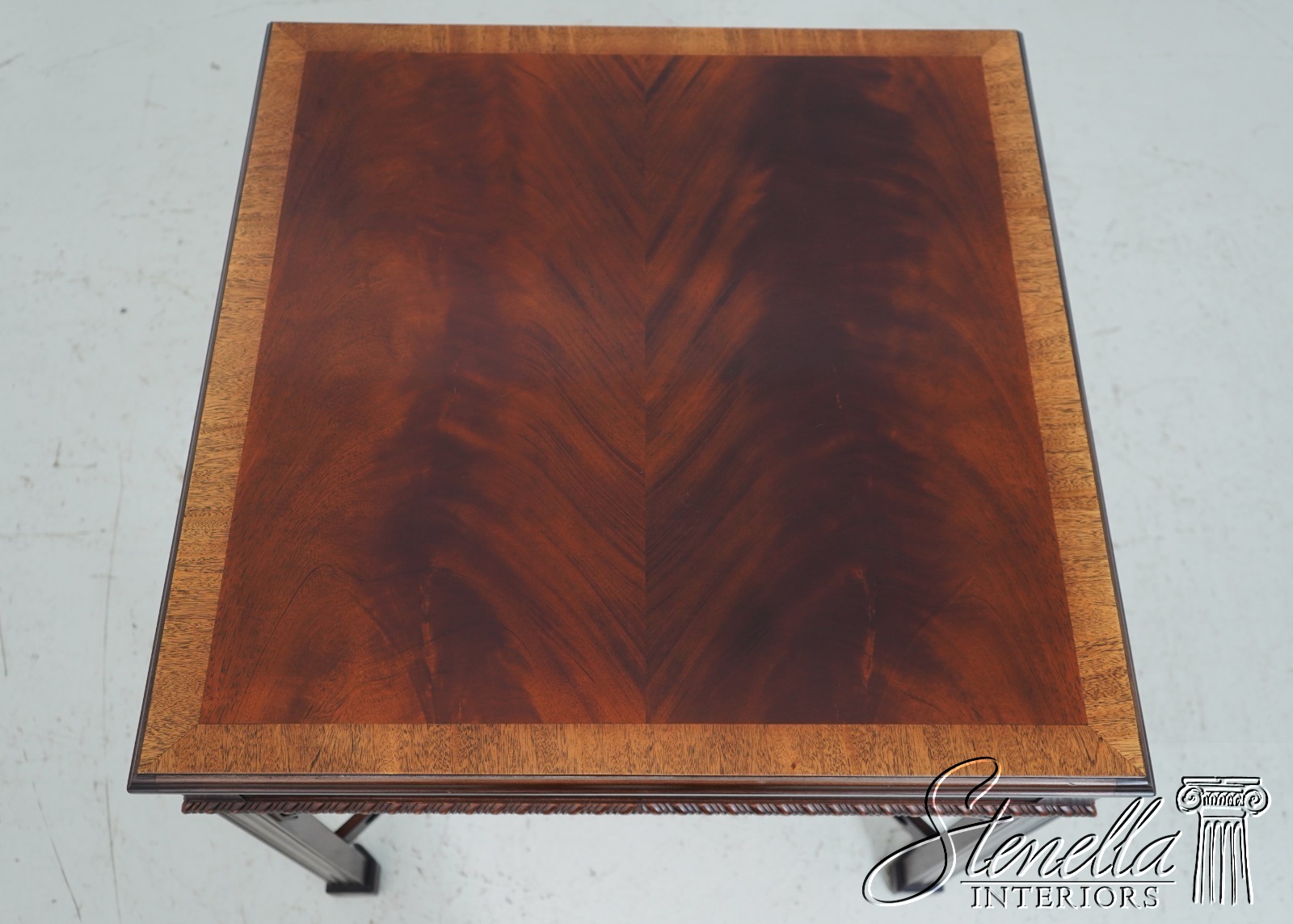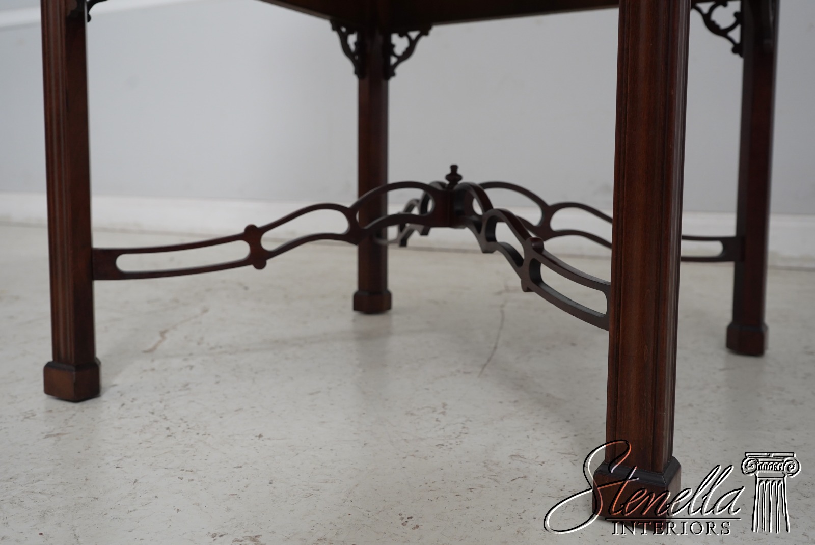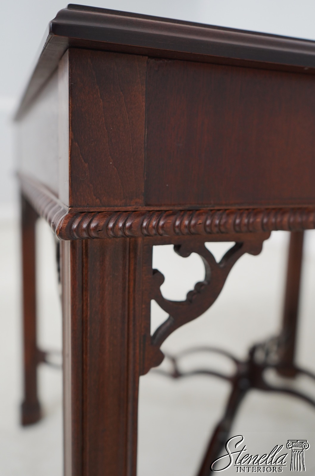 Age: Details: Gorgeous Figural Mahogany Top High Quality Construction 18 C Design Chippendale Style Traditional Style Stretcher Base Frame Un-Marked As To Manufacture - Possibly Hickory Chair Or Similar Manufacture