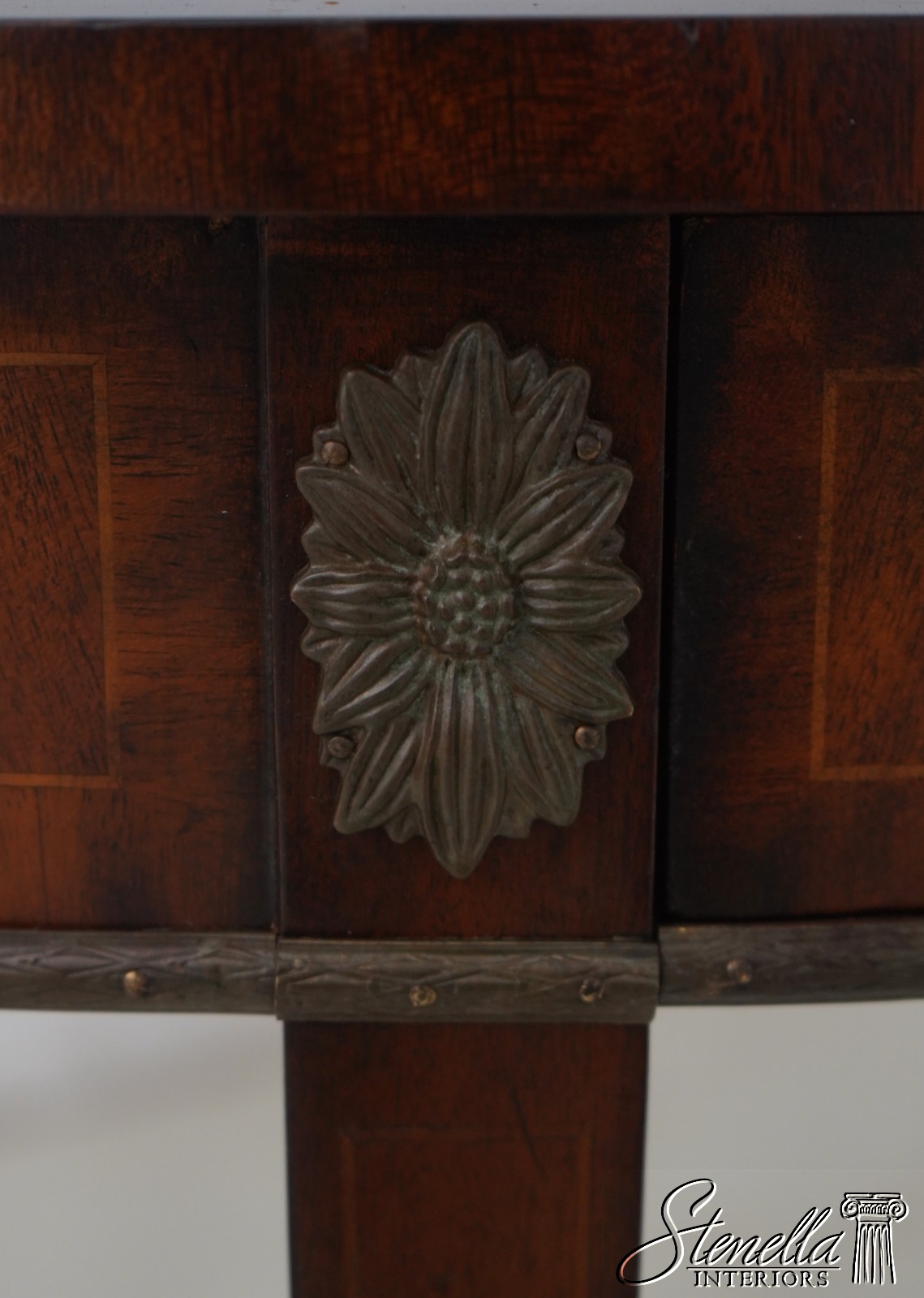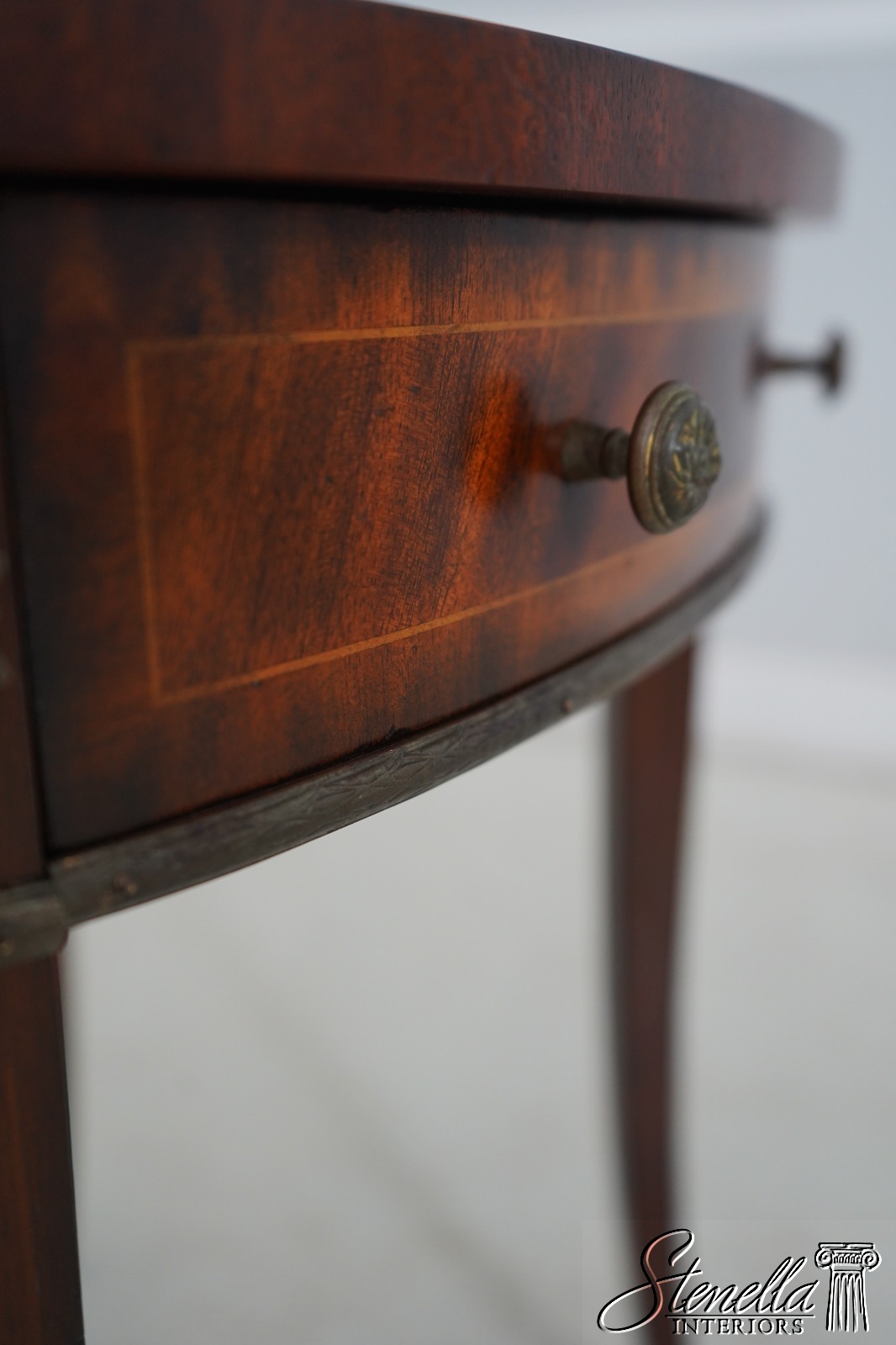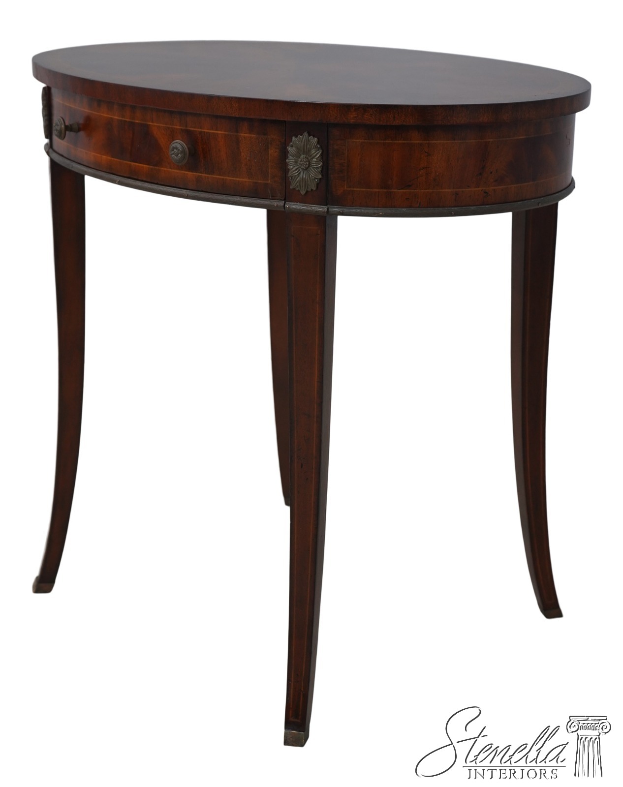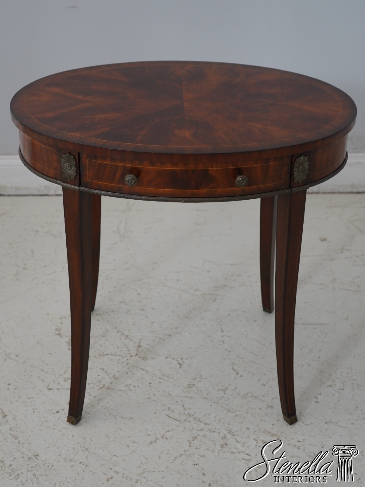 Details: Flame Mahogany Brass Capped Feet Quality Construction Line Inlay Throughout Figural Mahogany Throughout Brass Ormolu Mounts & Trim Solid Brass Hardware Sunburst Top Single Drawer Tapered Legs Offered @ Fraction Original Retail Cost