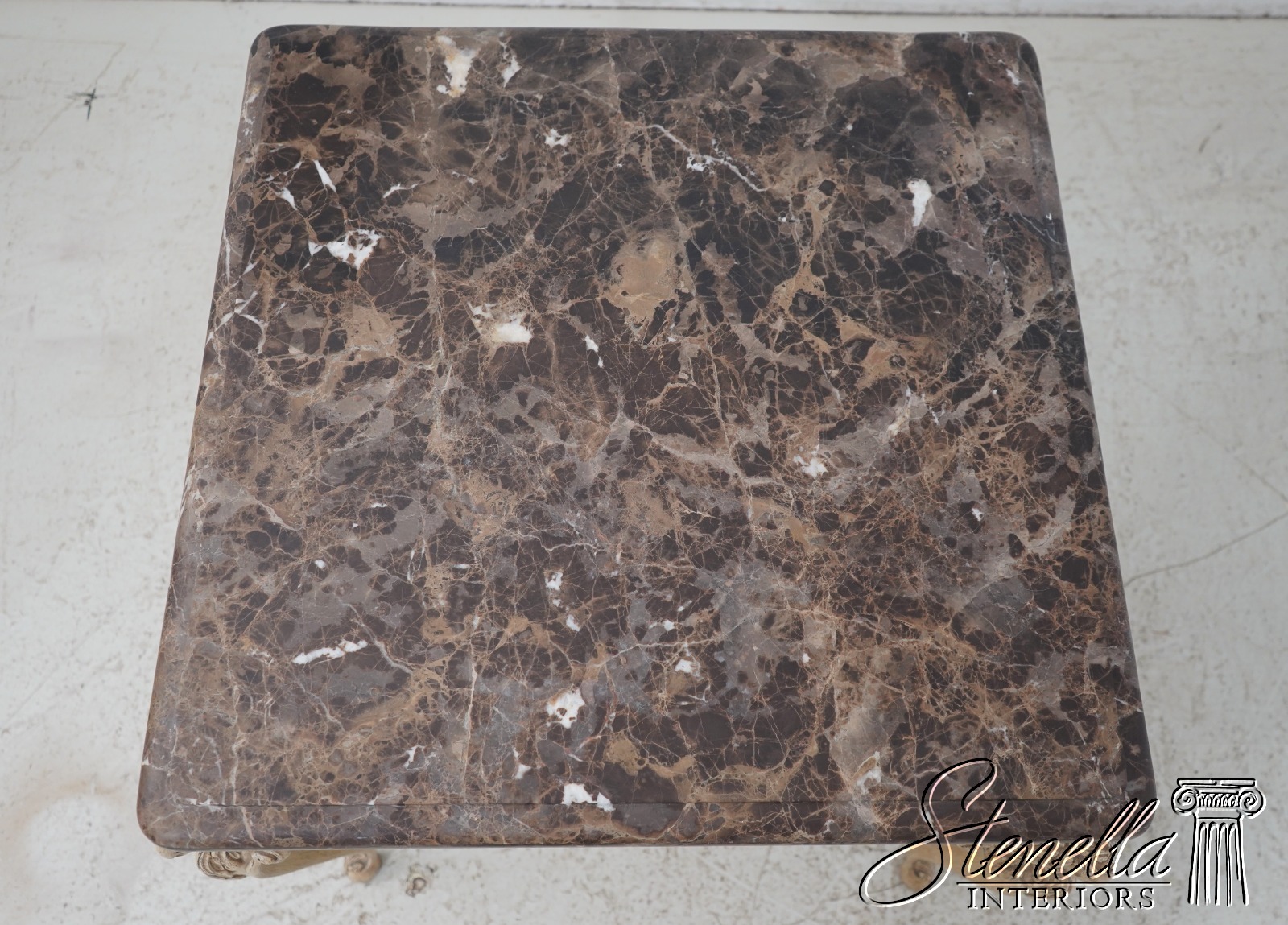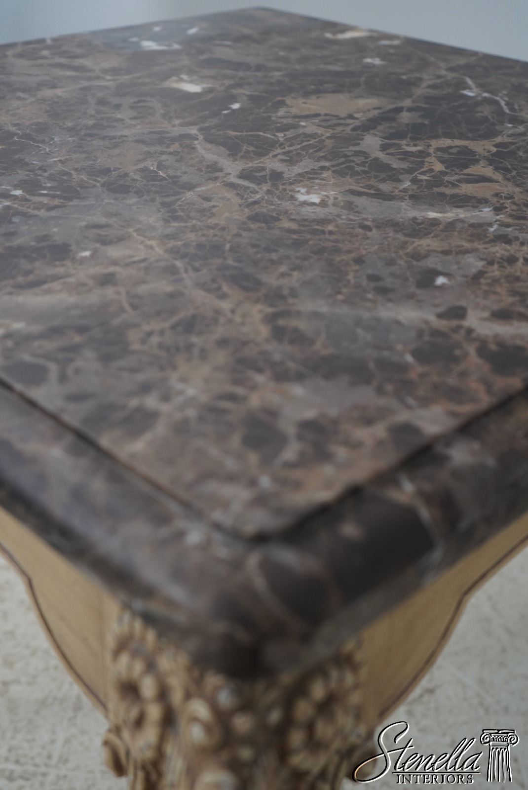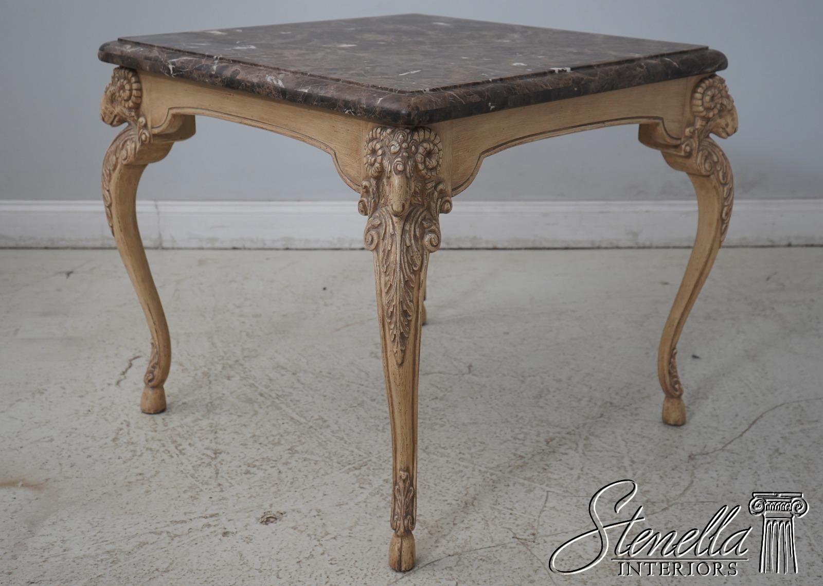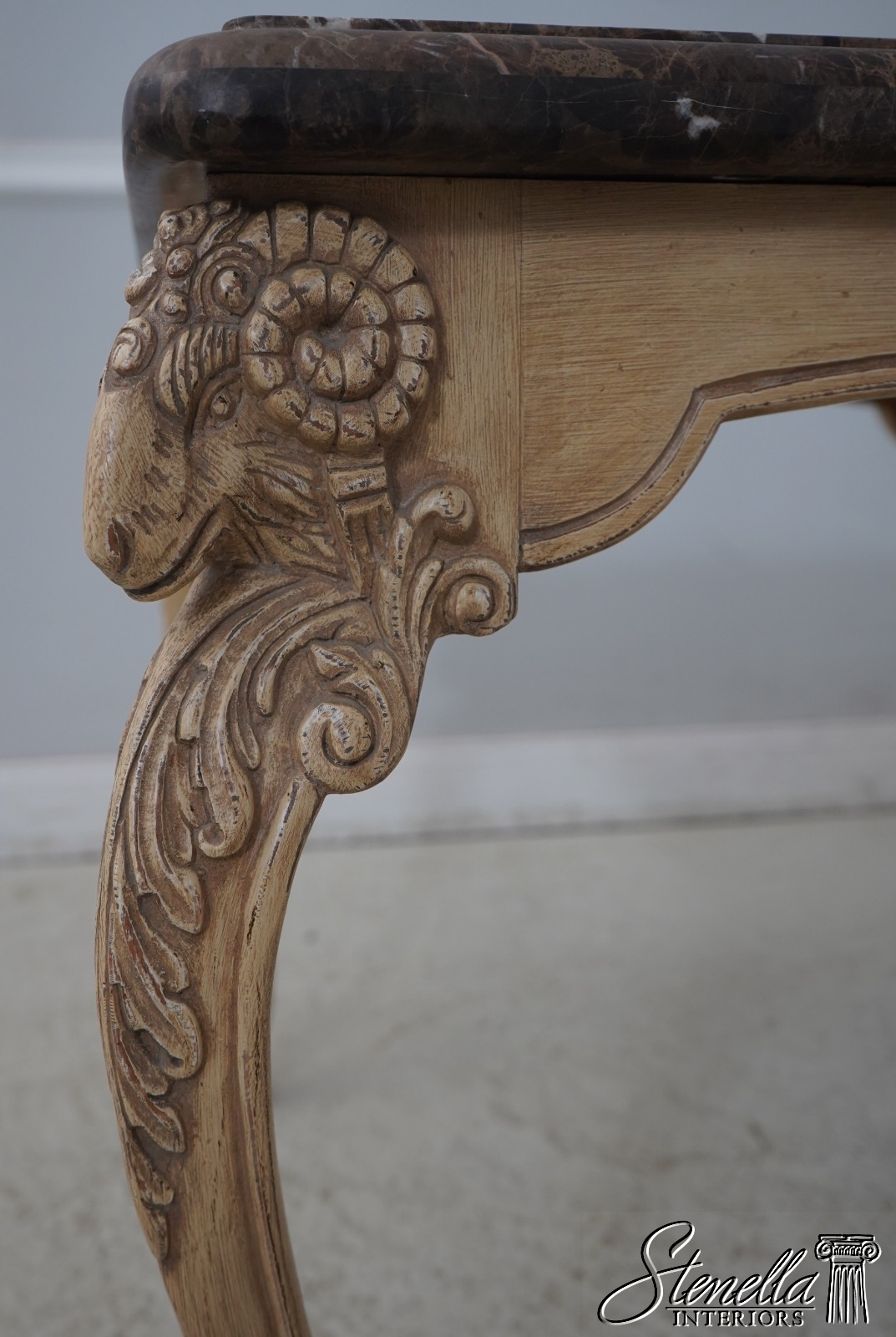 Details: ‘Antique’ Off White Painted Finish Fine Carved Details High Quality Construction Heavy Marble Top Rams Head Carved Legs w. Hoof Feet