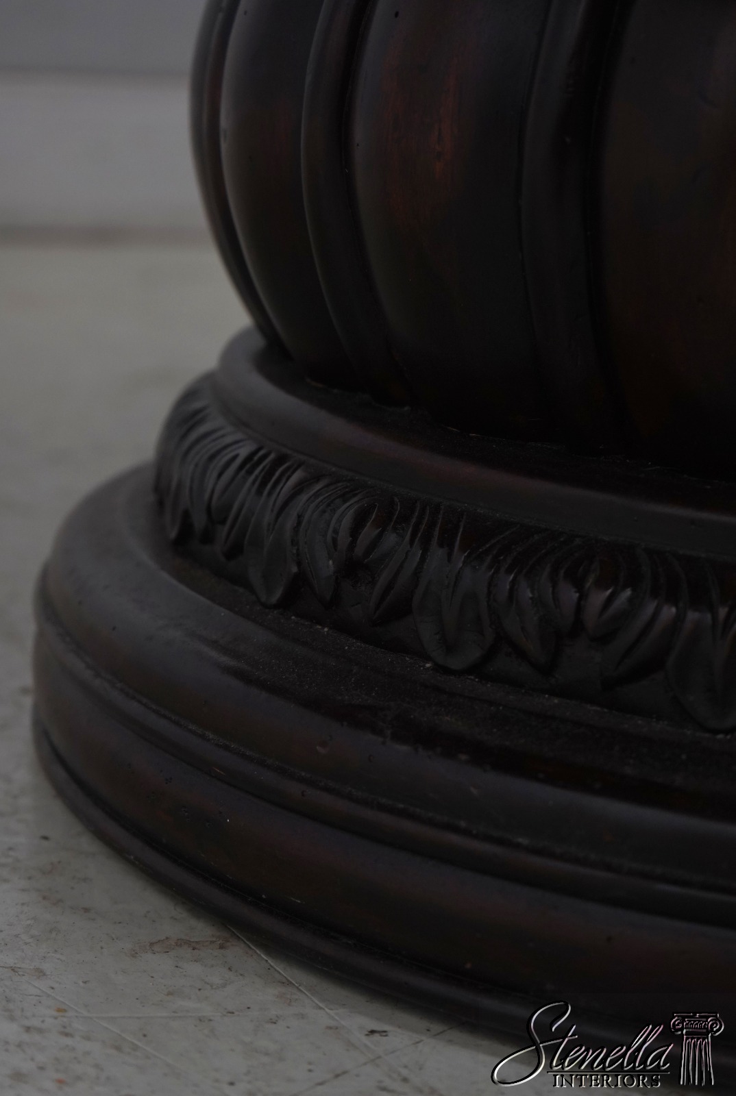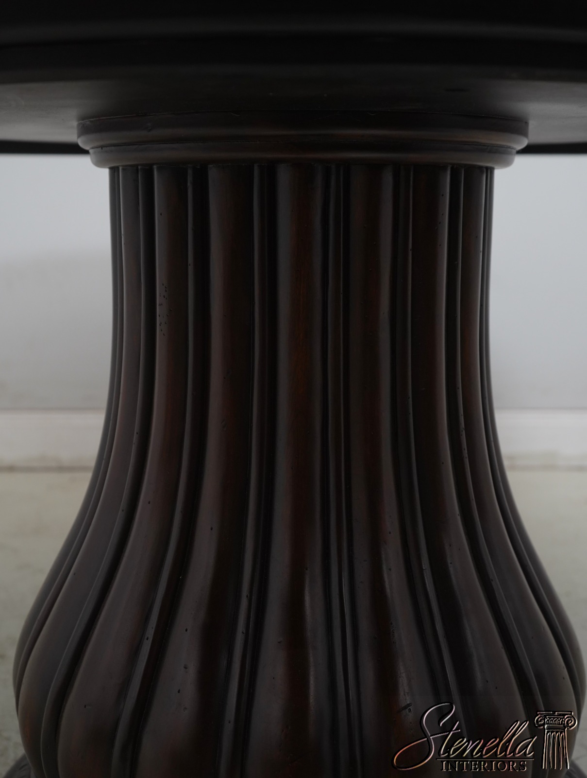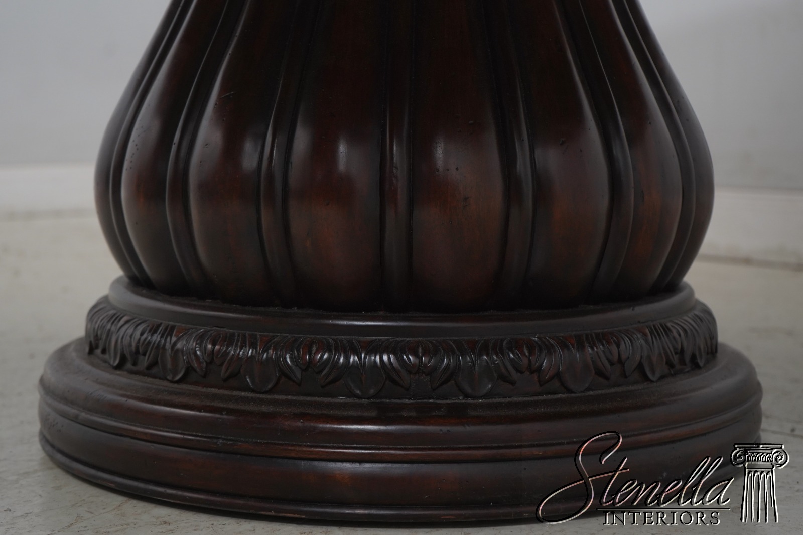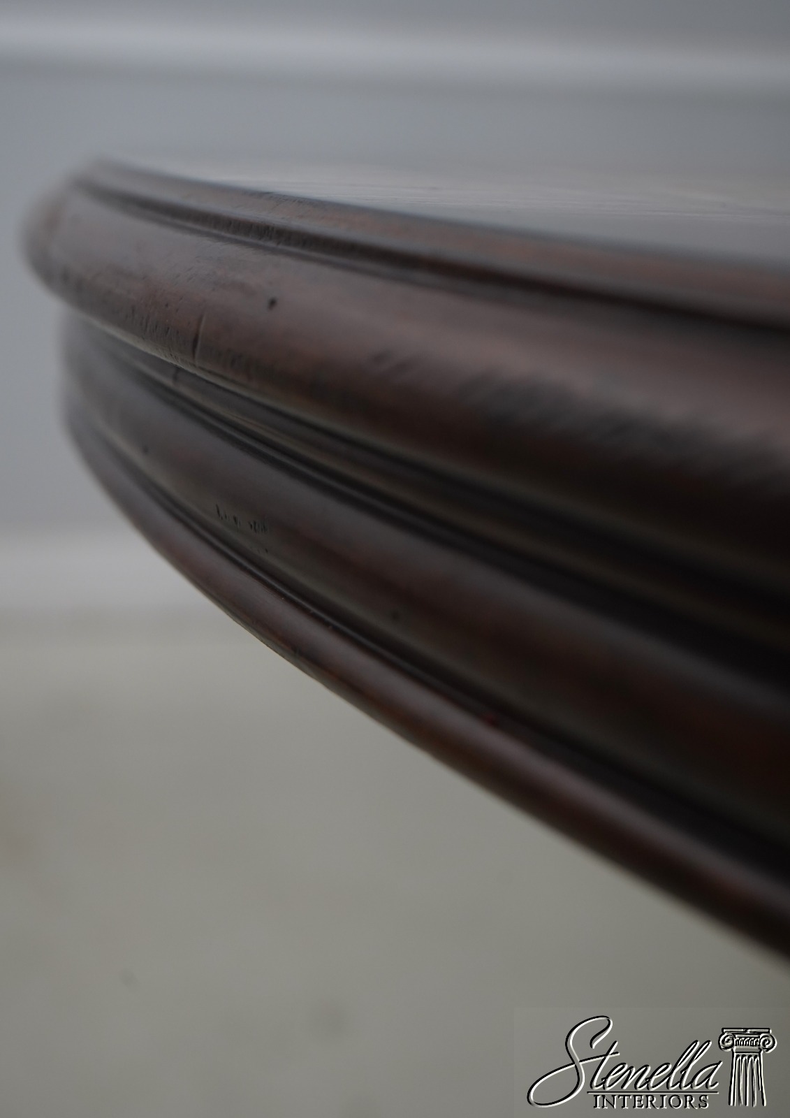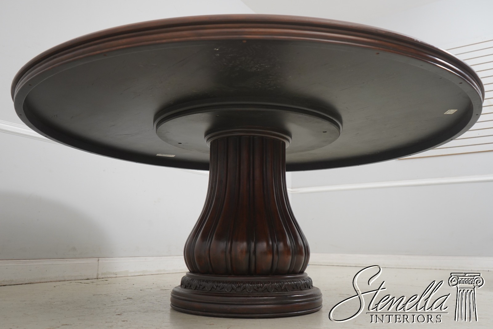 Details: Light Factory Distressed Ambella Collection Mahogany Fine Carved Details Quality Construction Large Impressive Table Nice Inlay Work Throughout RIch High Sheen Finish Single Pedestal - Heavy BAse Un-Marked As To Manufacture Beveled Wood Edge Banded Line Inlay Offered @ Fraction Original Retail Cost
