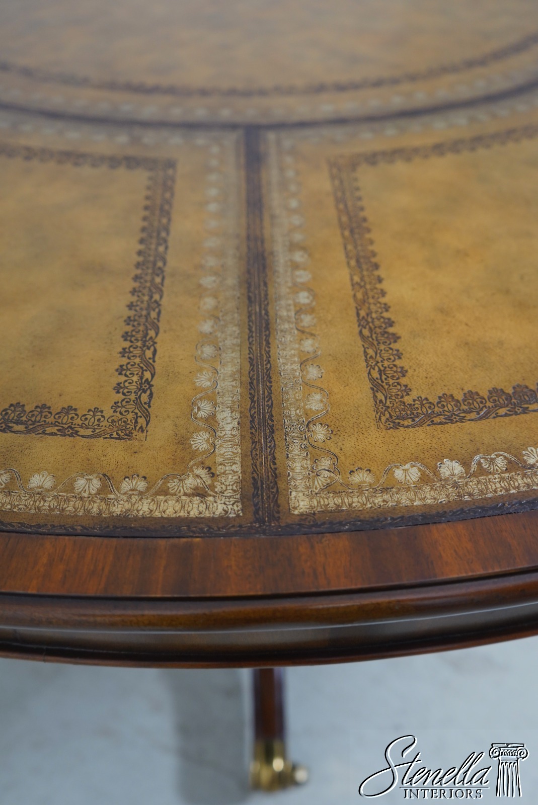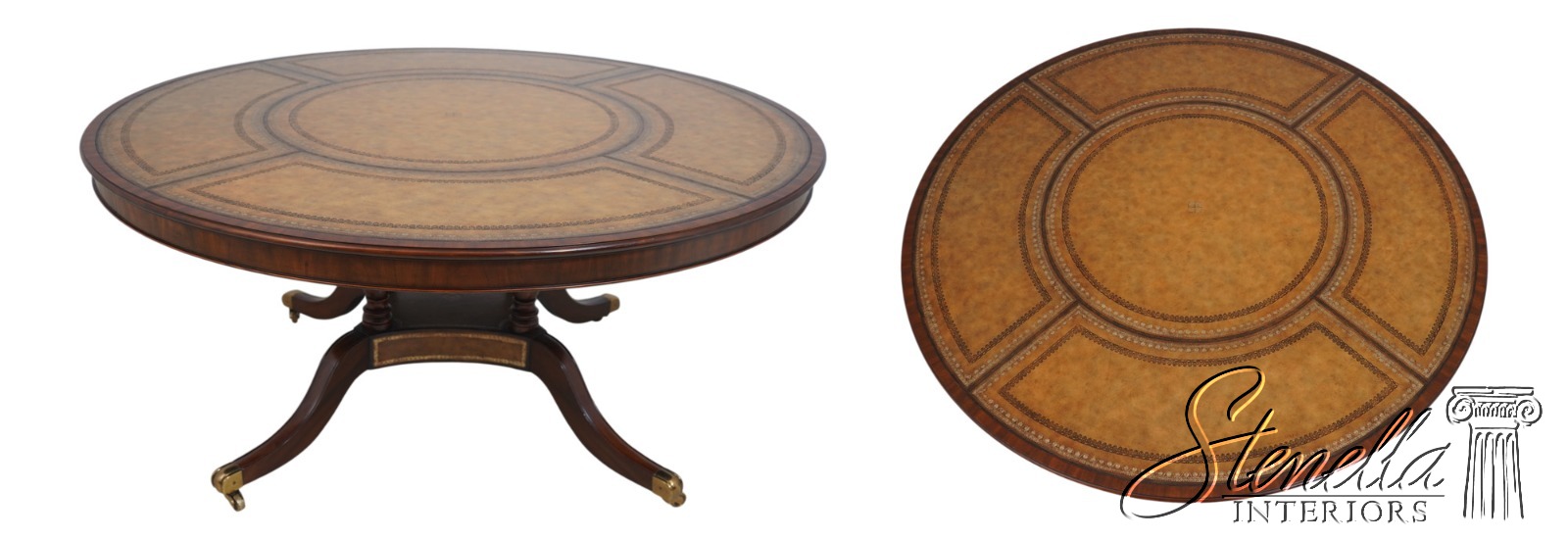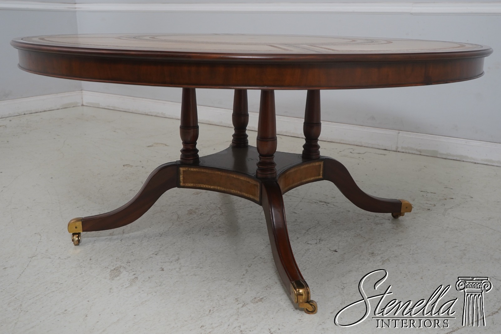 Details: Georgian Style Regency Style Mahogany Brass Capped Feet Fine Carved Details High Quality Construction English Style Traditional Style Solid Brass Hardware Beveled Wood Edge Quality Tooled Leather Top Brass Casters 4 Column Single Pedestal Base