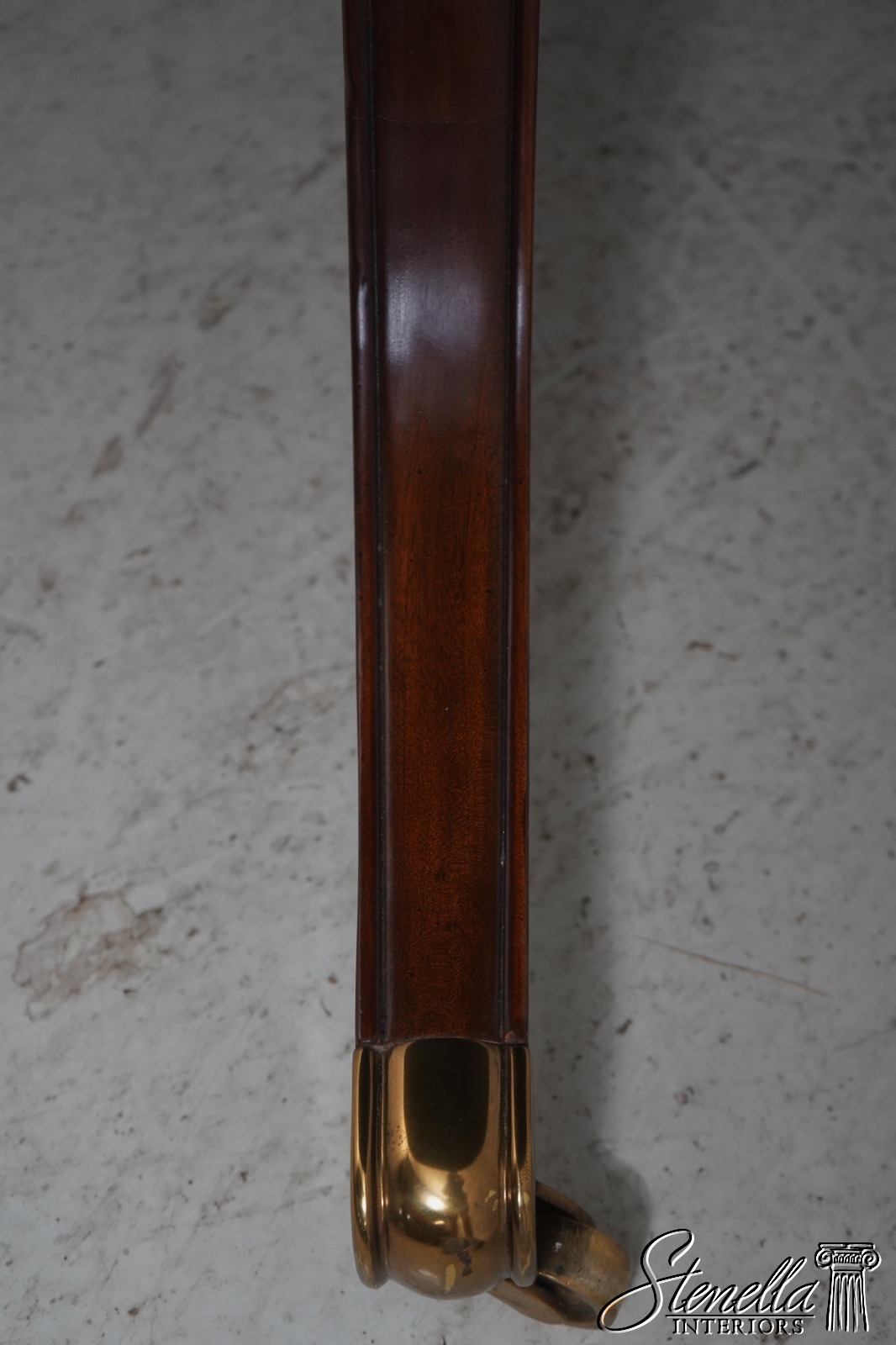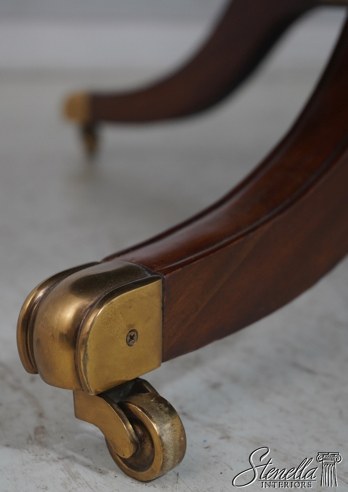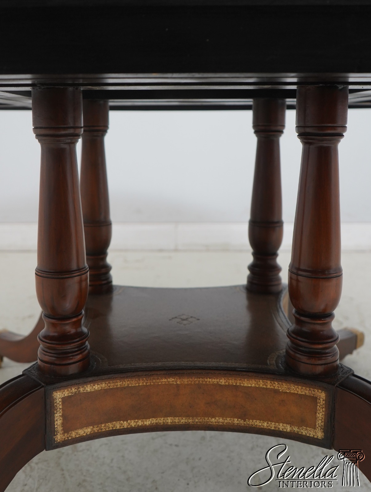 Details: Georgian Style Regency Style Mahogany Brass Capped Feet Fine Carved Details High Quality Construction English Style Traditional Style Solid Brass Hardware Beveled Wood Edge Quality Tooled Leather Top Brass Casters 4 Column Single Pedestal Base