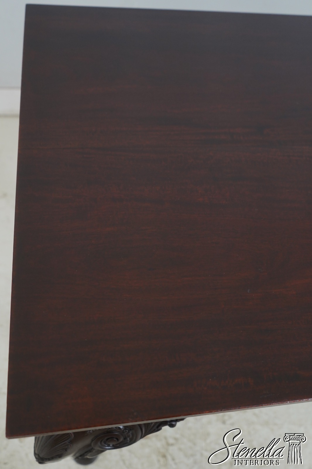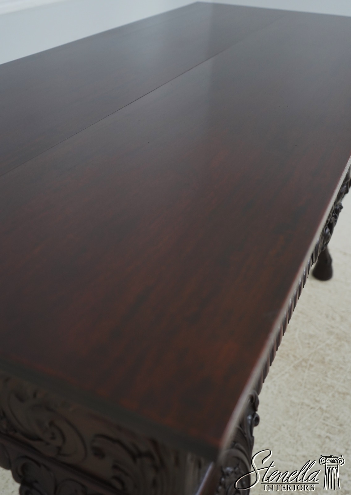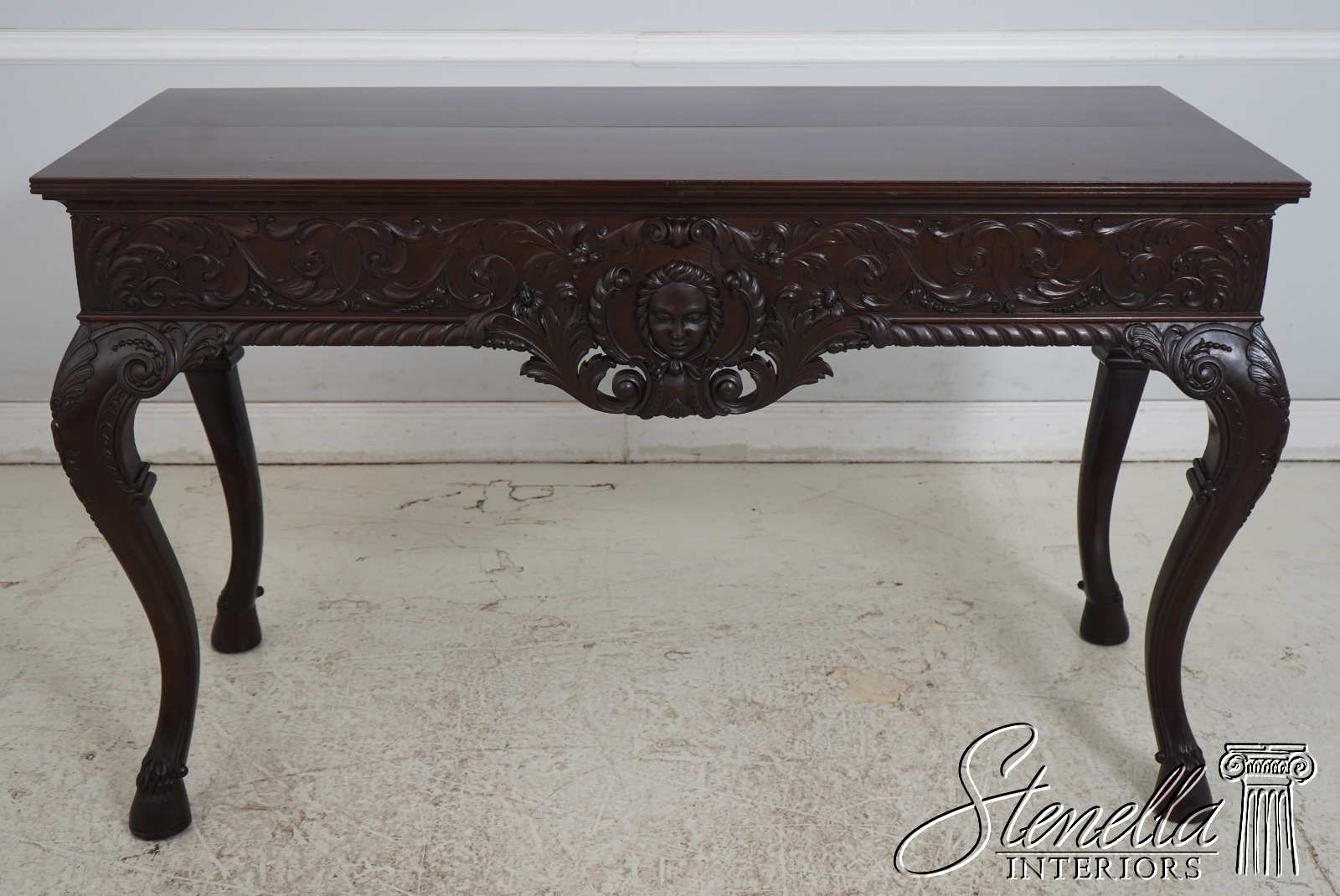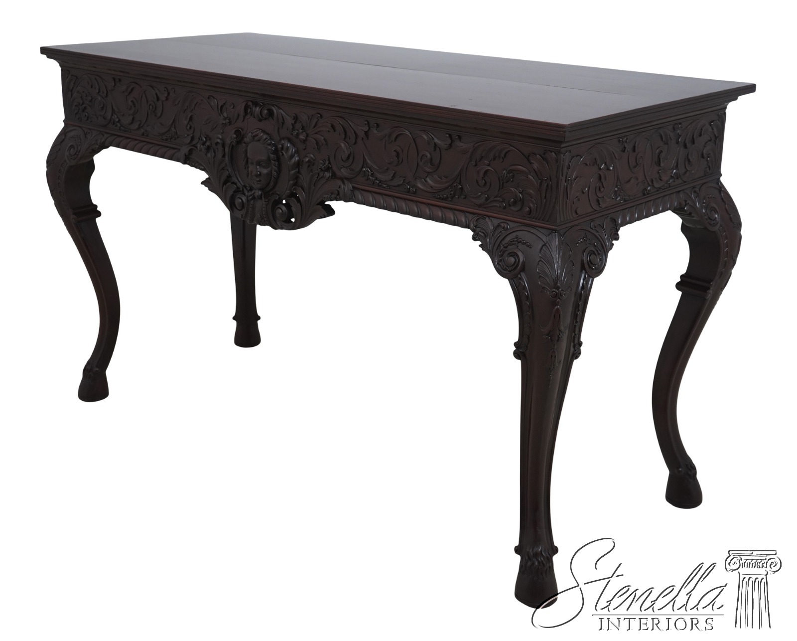 Details: Mahogany Ball & Claw Feet Fine Carved Details High Quality Construction Irish Georgian Style Cherub Carving On Apron Ornate Carved Details Reeded Top Edge Large Impressive Console Dark Mahogany Finish Un-Marked As To Manufacture Offered @ Fraction Original Retail Cost
