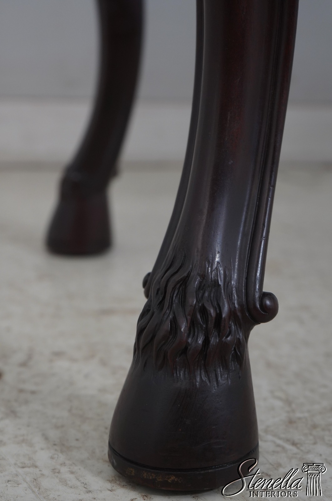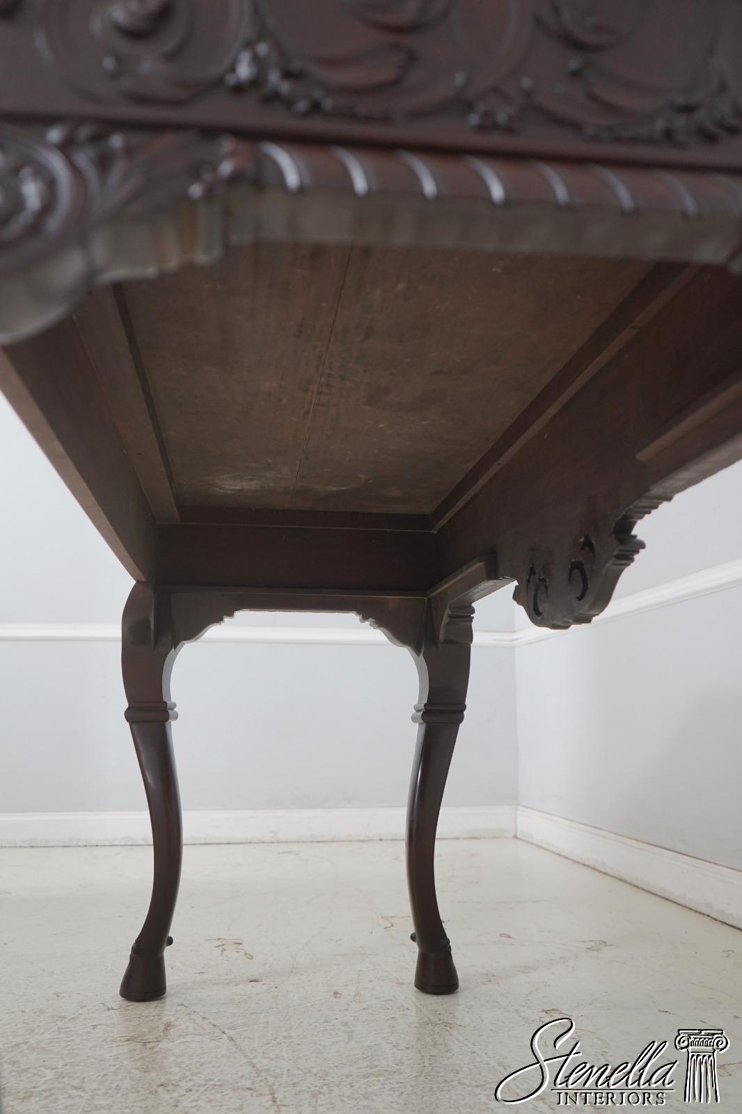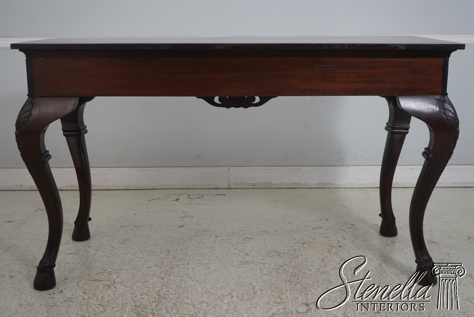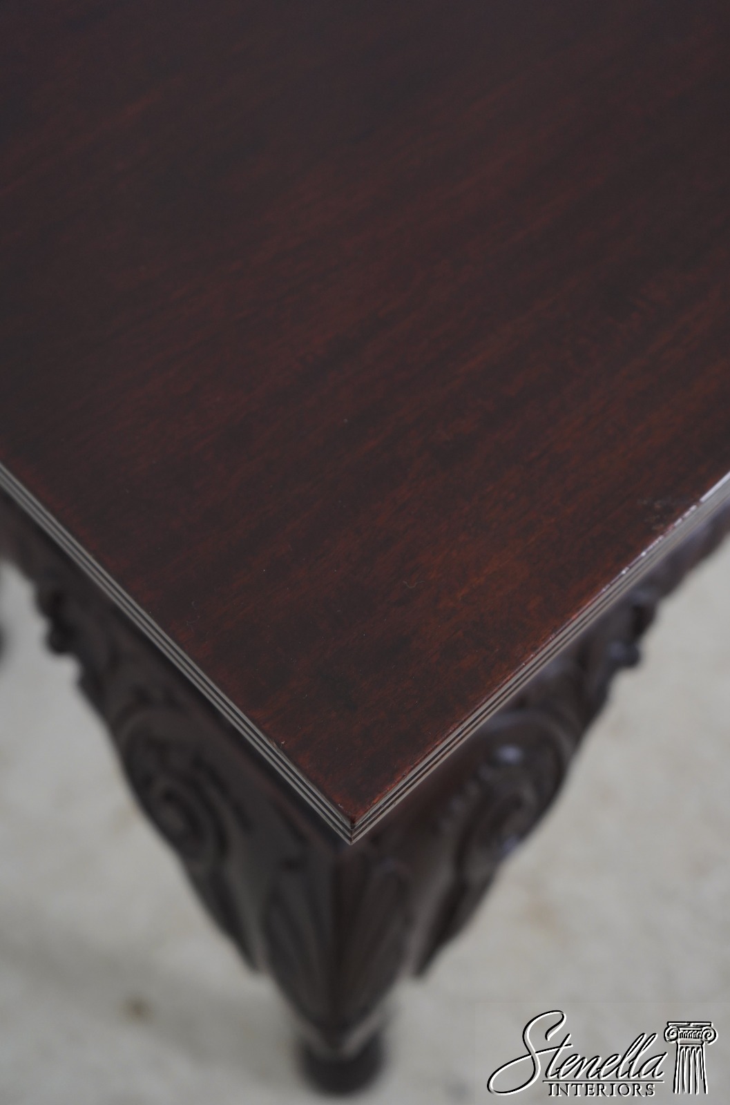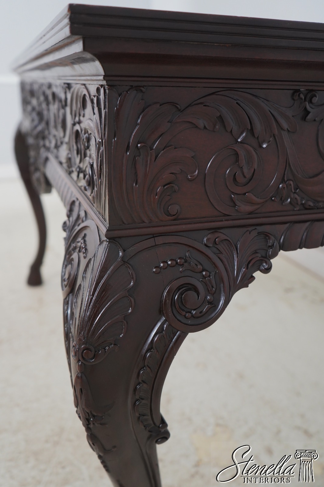 Details: Mahogany Ball & Claw Feet Fine Carved Details High Quality Construction Irish Georgian Style Cherub Carving On Apron Ornate Carved Details Reeded Top Edge Large Impressive Console Dark Mahogany Finish Un-Marked As To Manufacture Offered @ Fraction Original Retail Cost