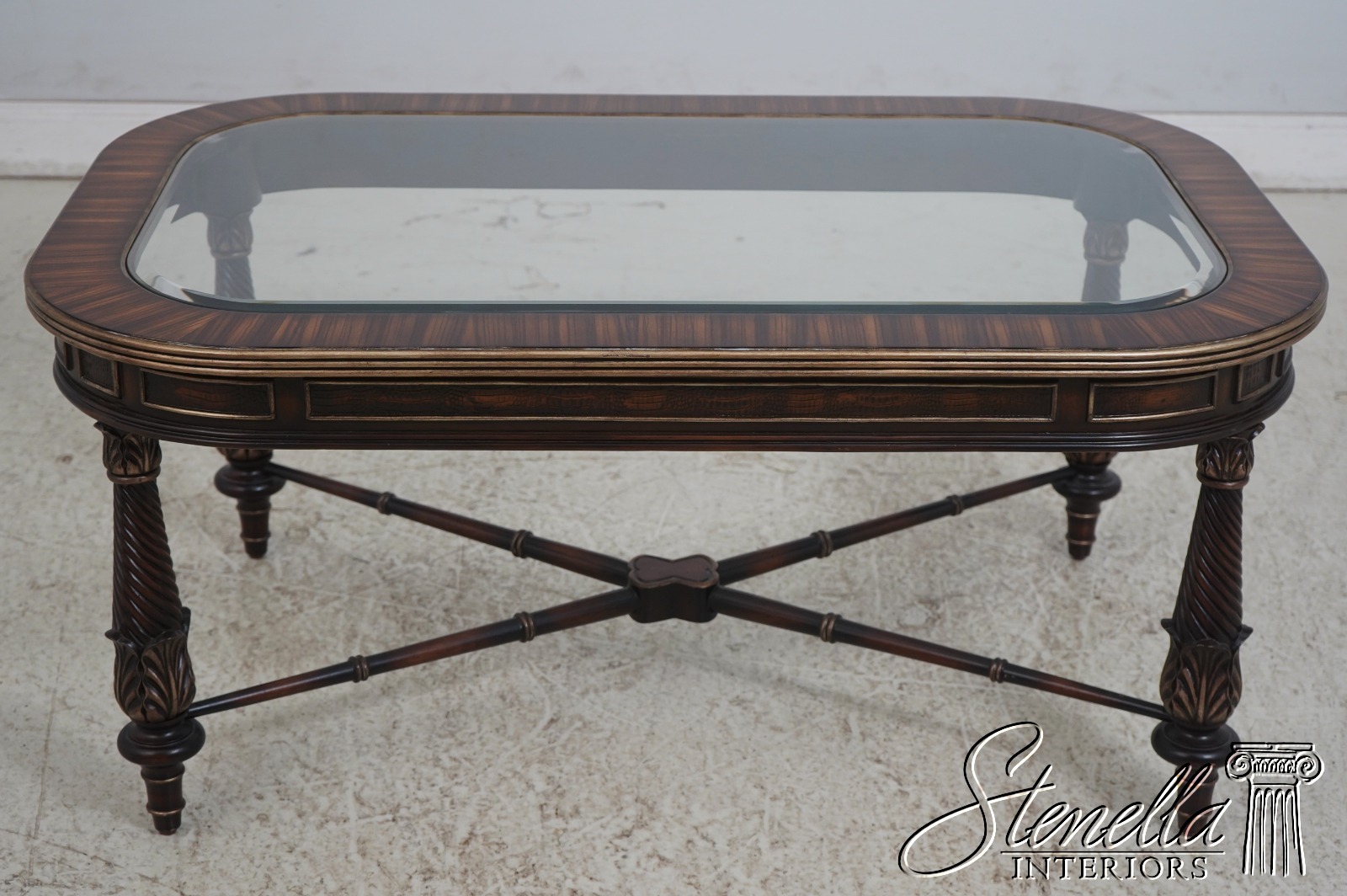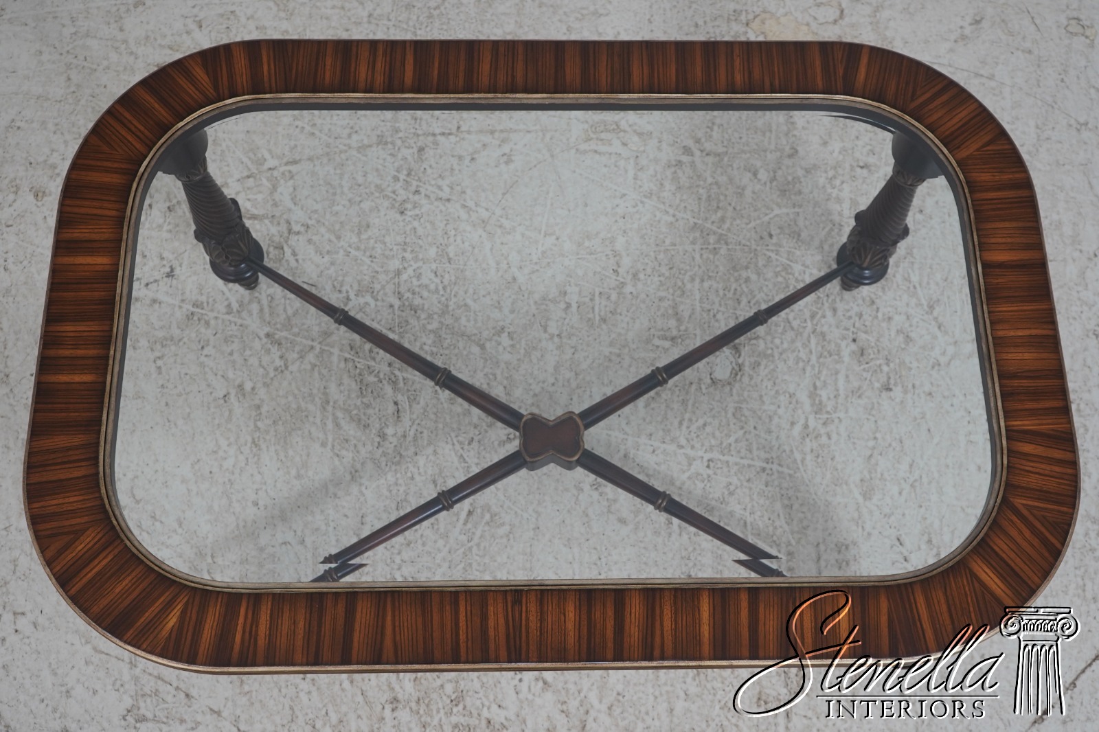 L69870: Mixed Wood Inlaid Glass Top X Base Coffee Table