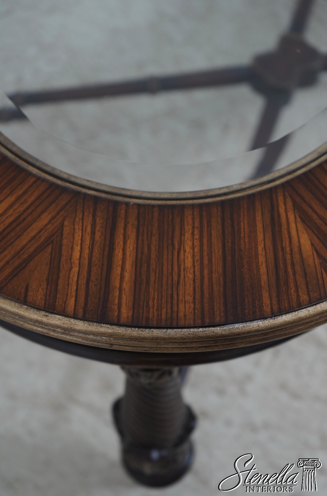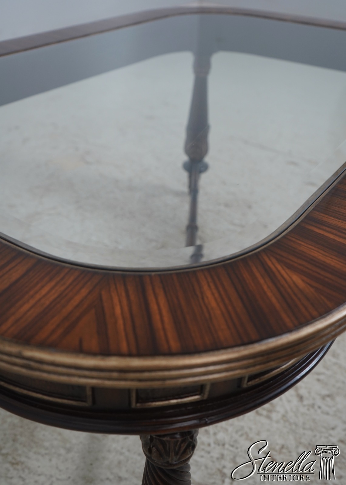 Details: Possibly EJ Victor Beveled Glass Top Fine Carved Details High Quality Construction Regency Style Solid Brass Hardware Stretcher Base Frame Textured Leather Skirt Un-Marked As To Manufacture Offered @ Fraction Original Retail Cost