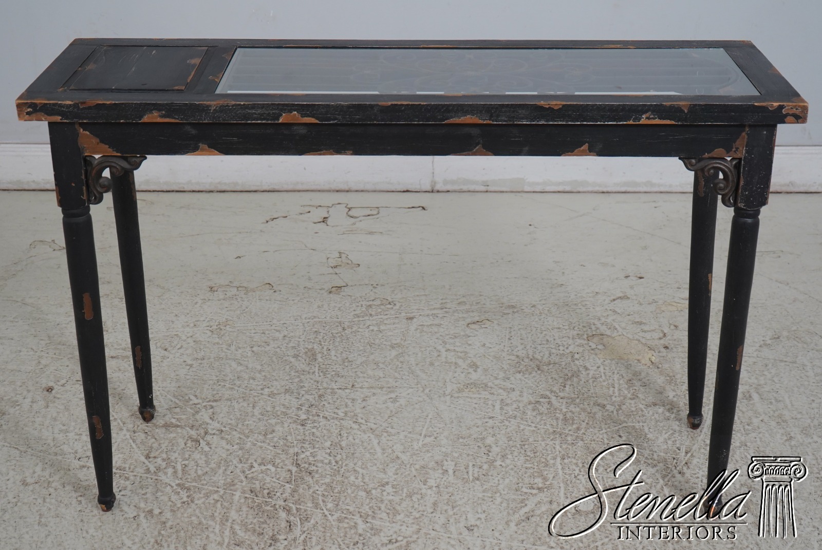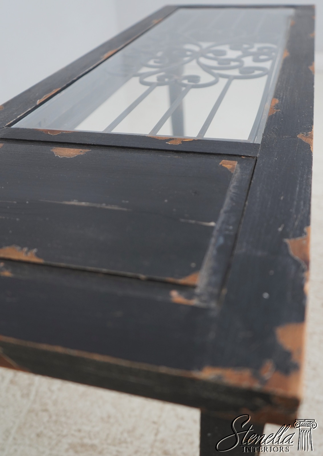 L69981: Continental Glass Top Iron & Wood Distressed Paint Console Table