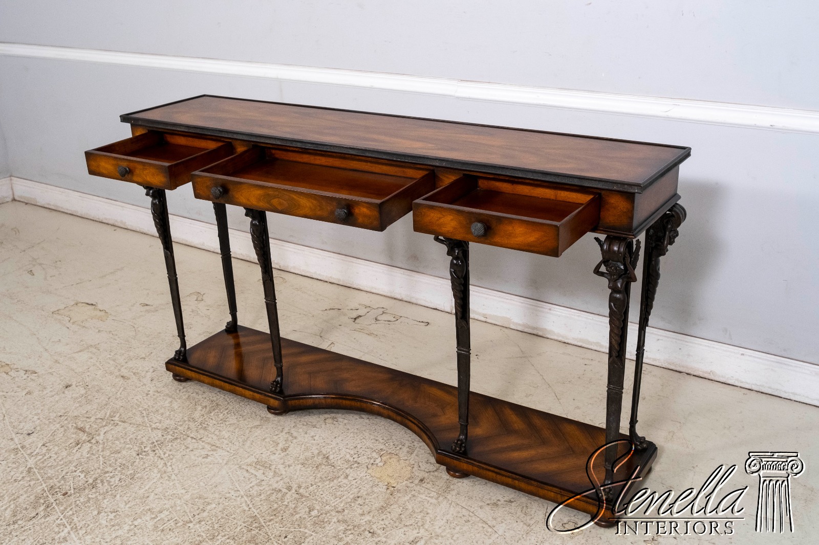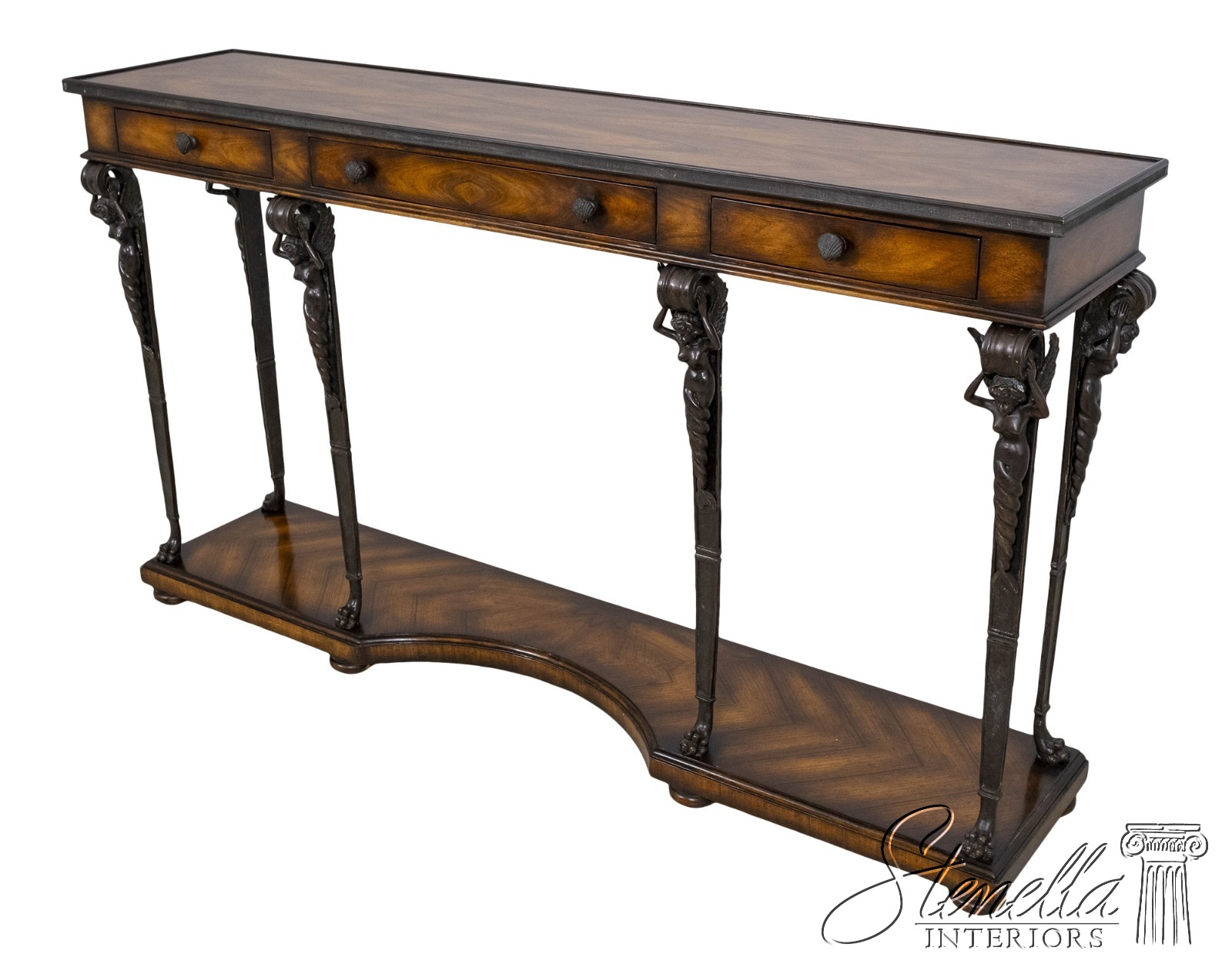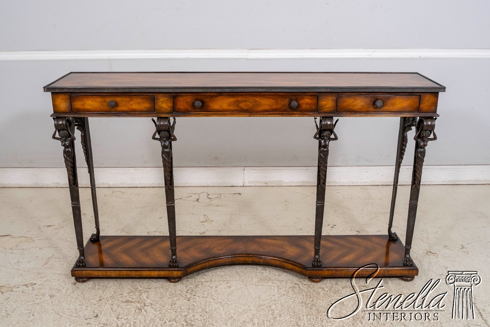 L69993: THEODORE ALEXANDER Mahogany & Figural Bronze 3 Drawer Console Table