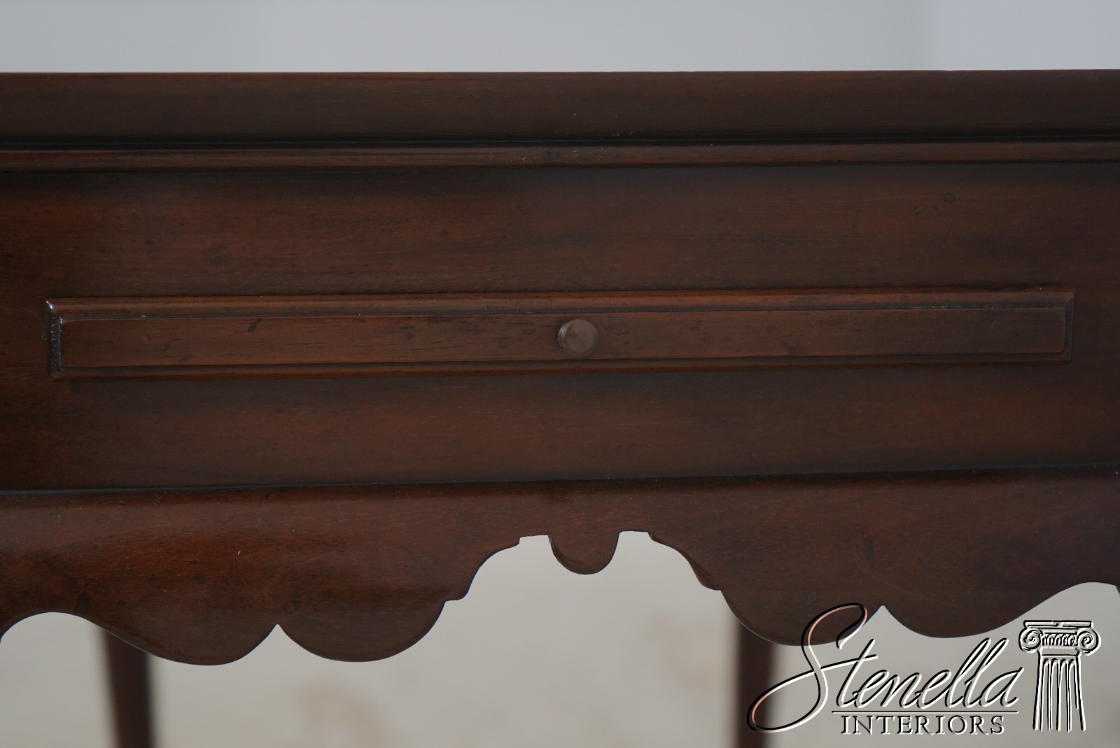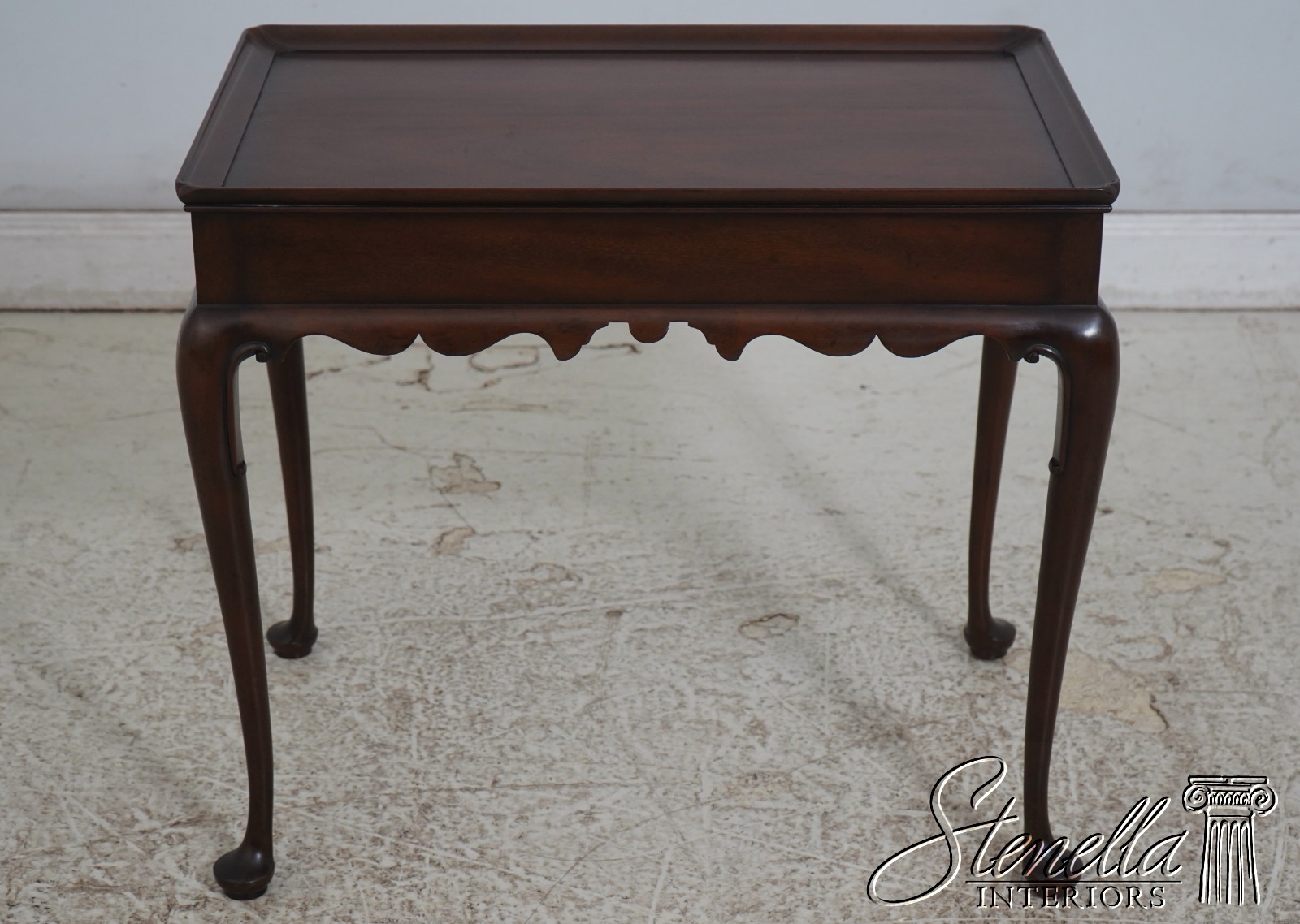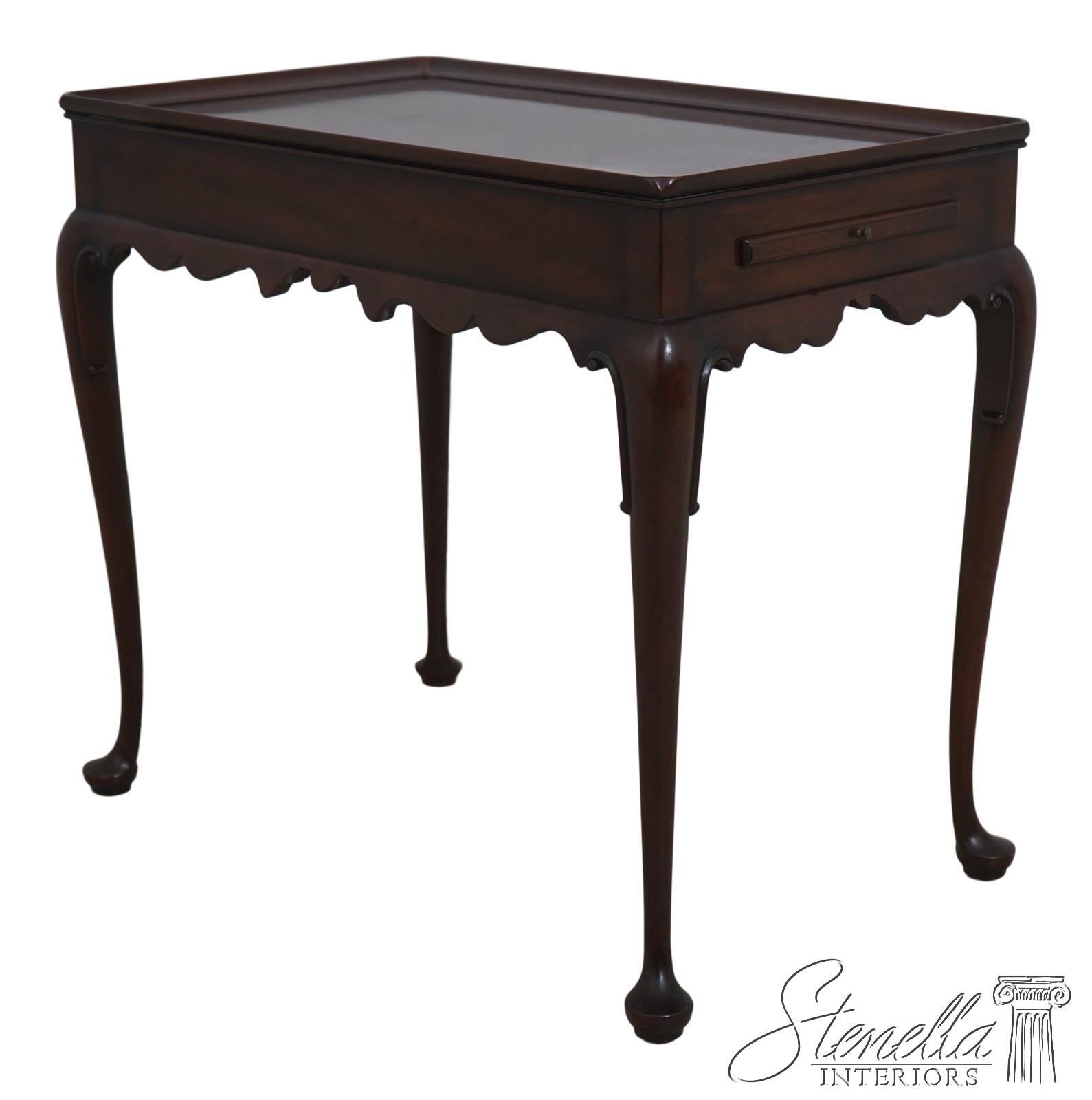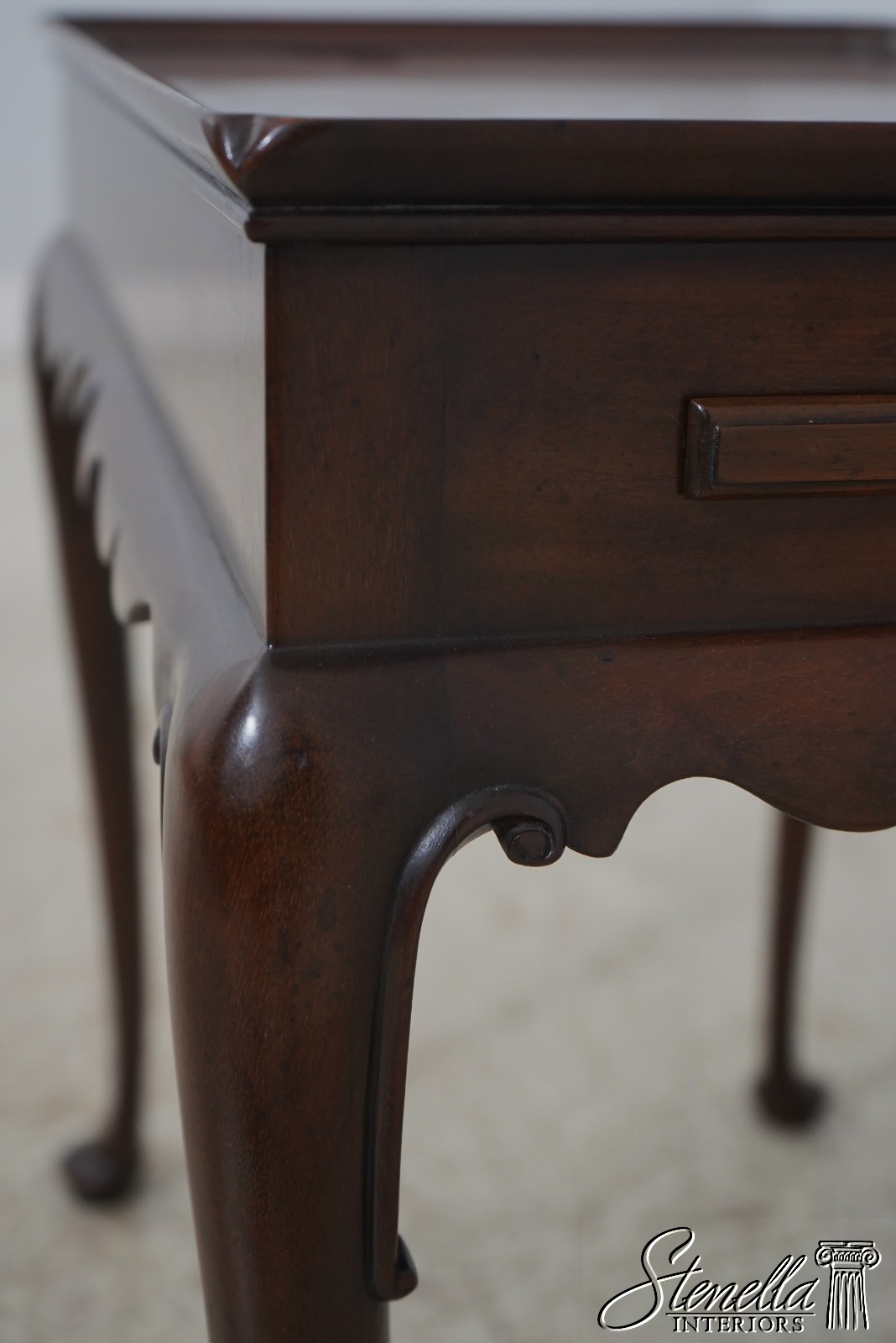 The original of this piece is American circa 1735-50. This elegant mahogany tea table was designed by a Massachusetts cabinetmaker. It is made of mahogany with pine candle slides. Note the graceful scallop of the apron and the delicate hand carving of the cabriole legs.
