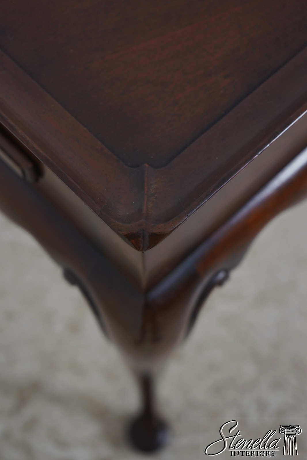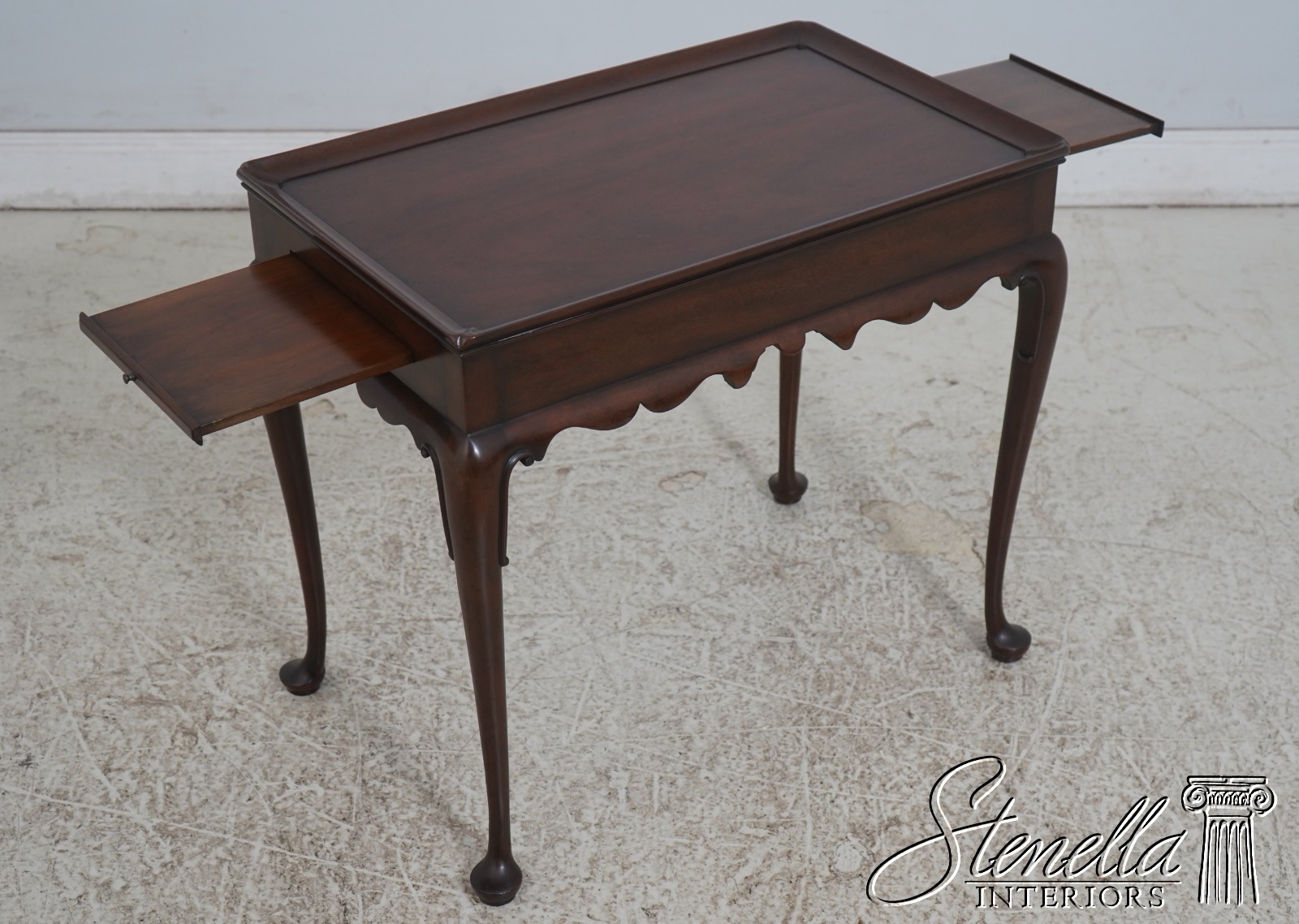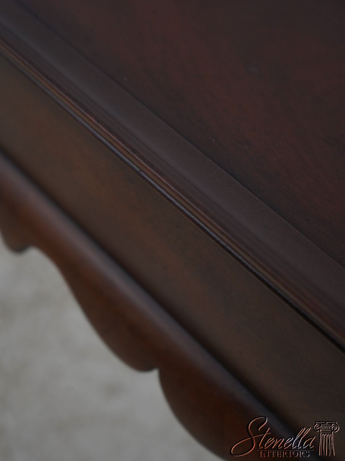 The original of this piece is American circa 1735-50. This elegant mahogany tea table was designed by a Massachusetts cabinetmaker. It is made of mahogany with pine candle slides. Note the graceful scallop of the apron and the delicate hand carving of the cabriole legs.