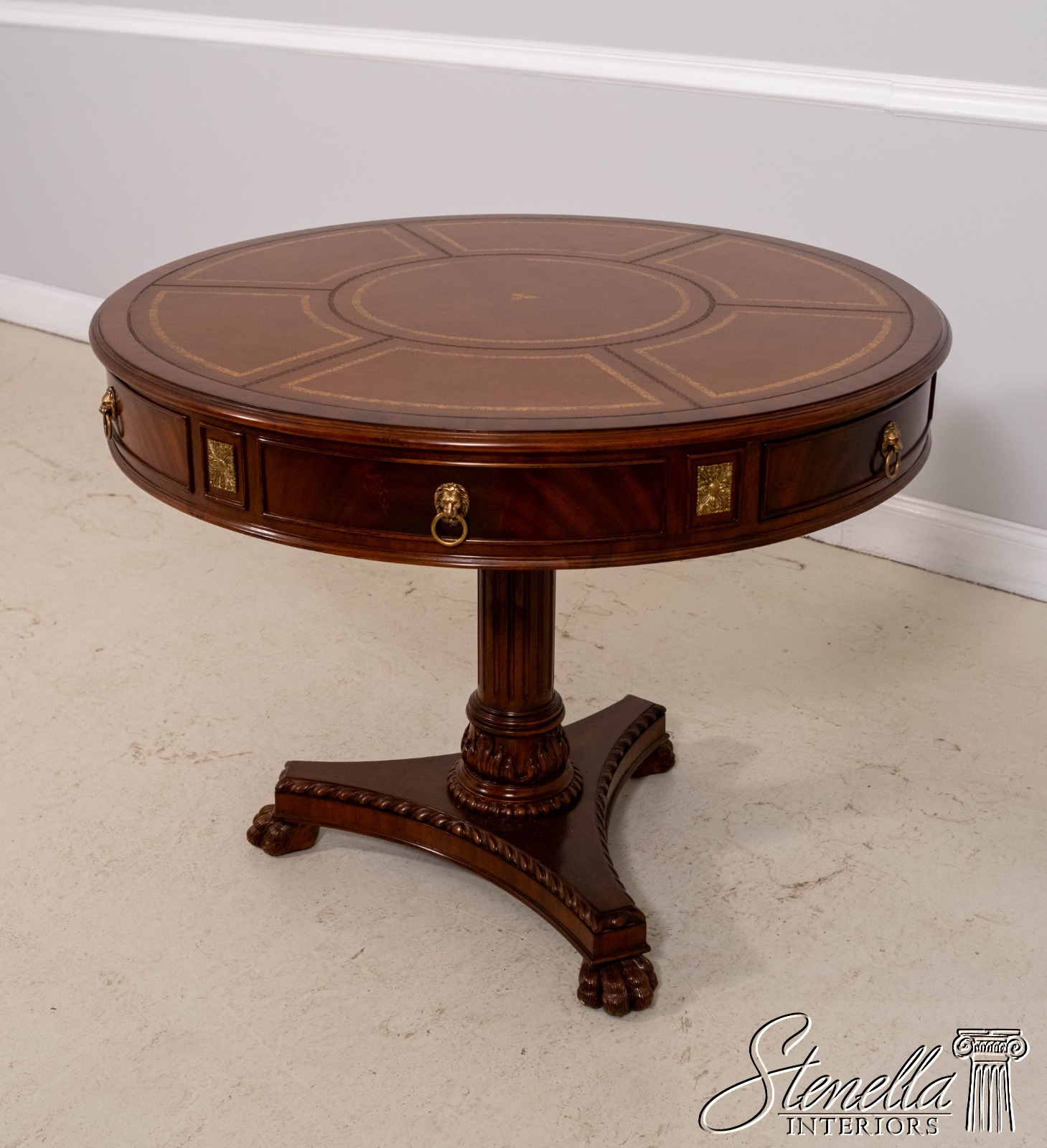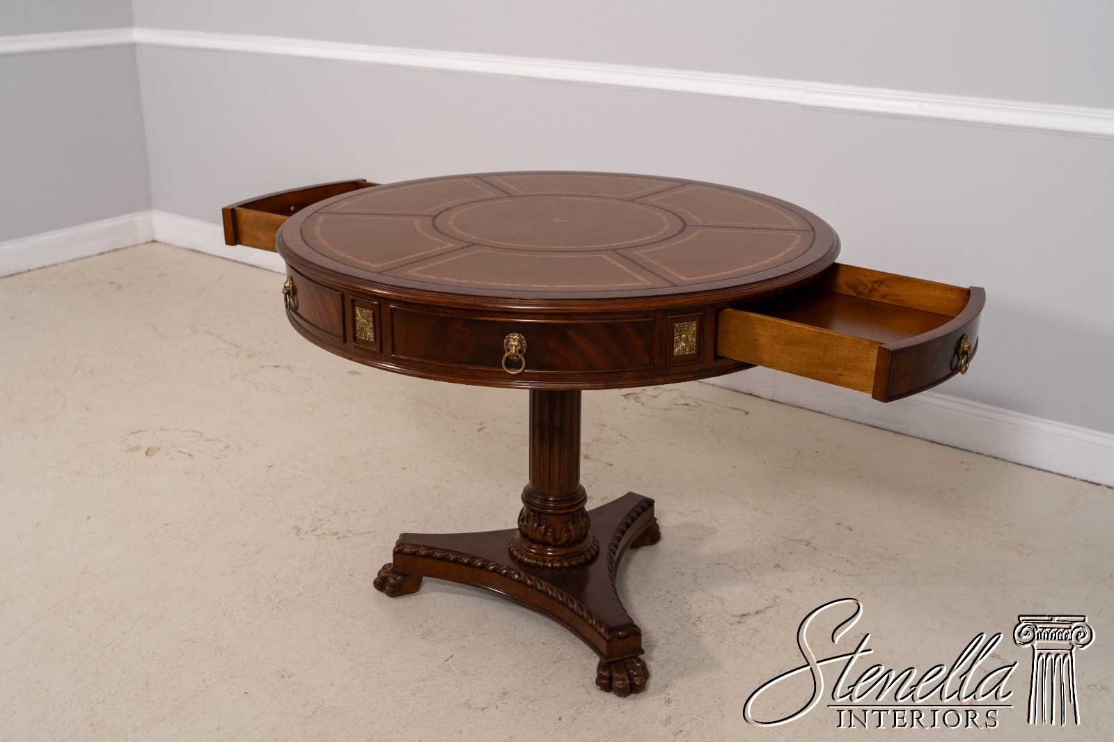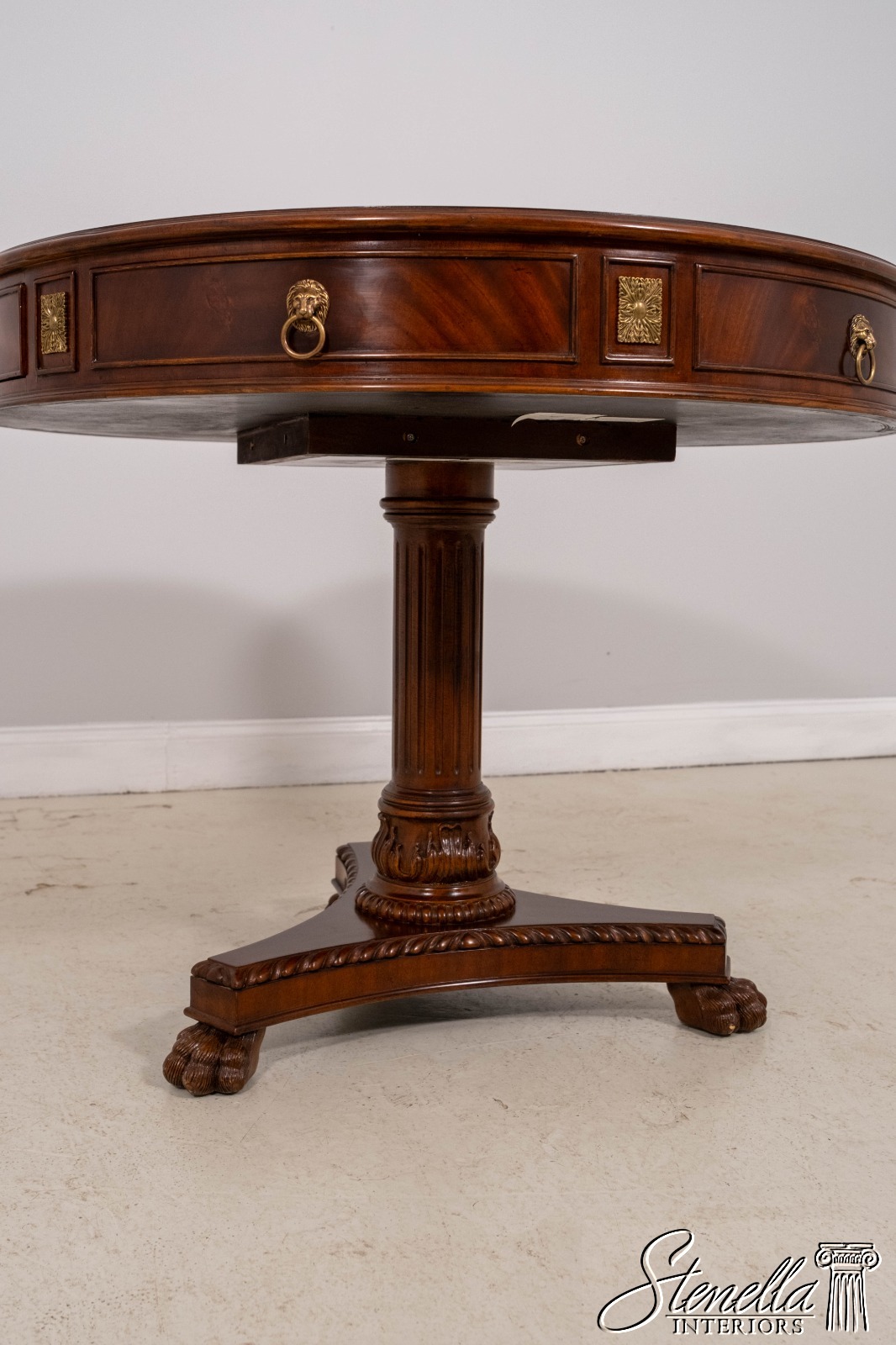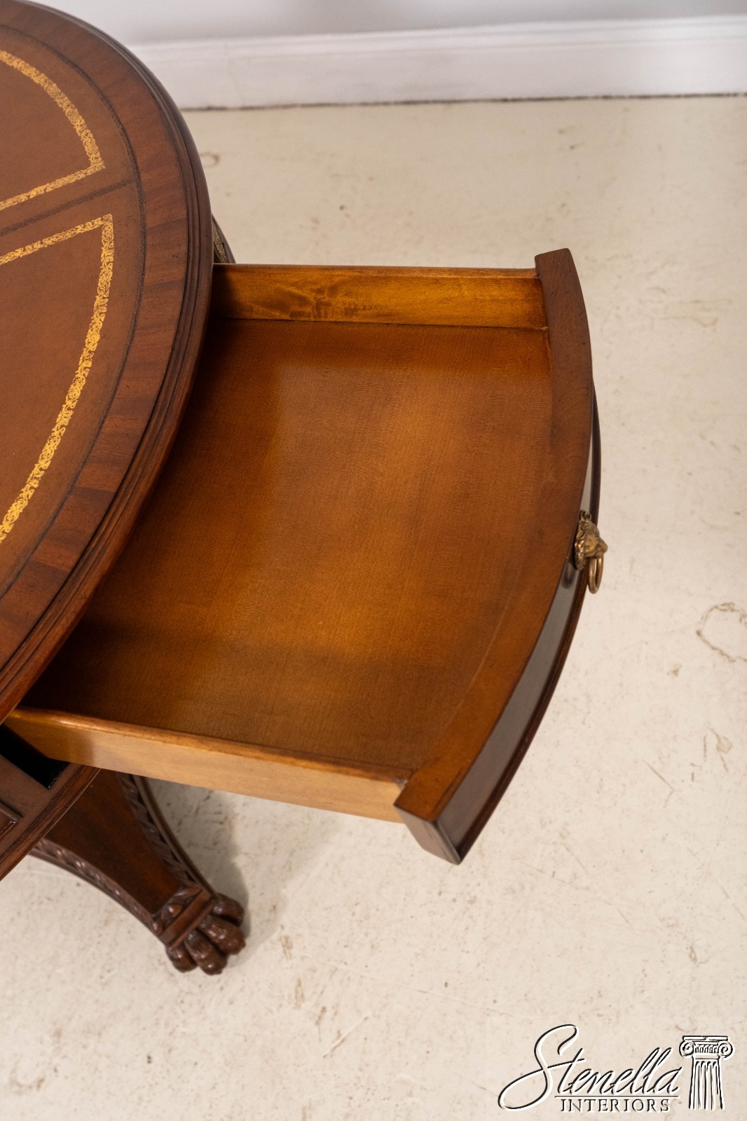 Details: 2 Drawers Platform Pedestal Base High Quality Construction Quality Tooled Leather Top Brass Lion Head Pulls Unboxed For Photography Carved Paw Feet Figural Mahogany Skirt Un-Marked As To Manufacture Offered @ Fraction Original Retail Cost