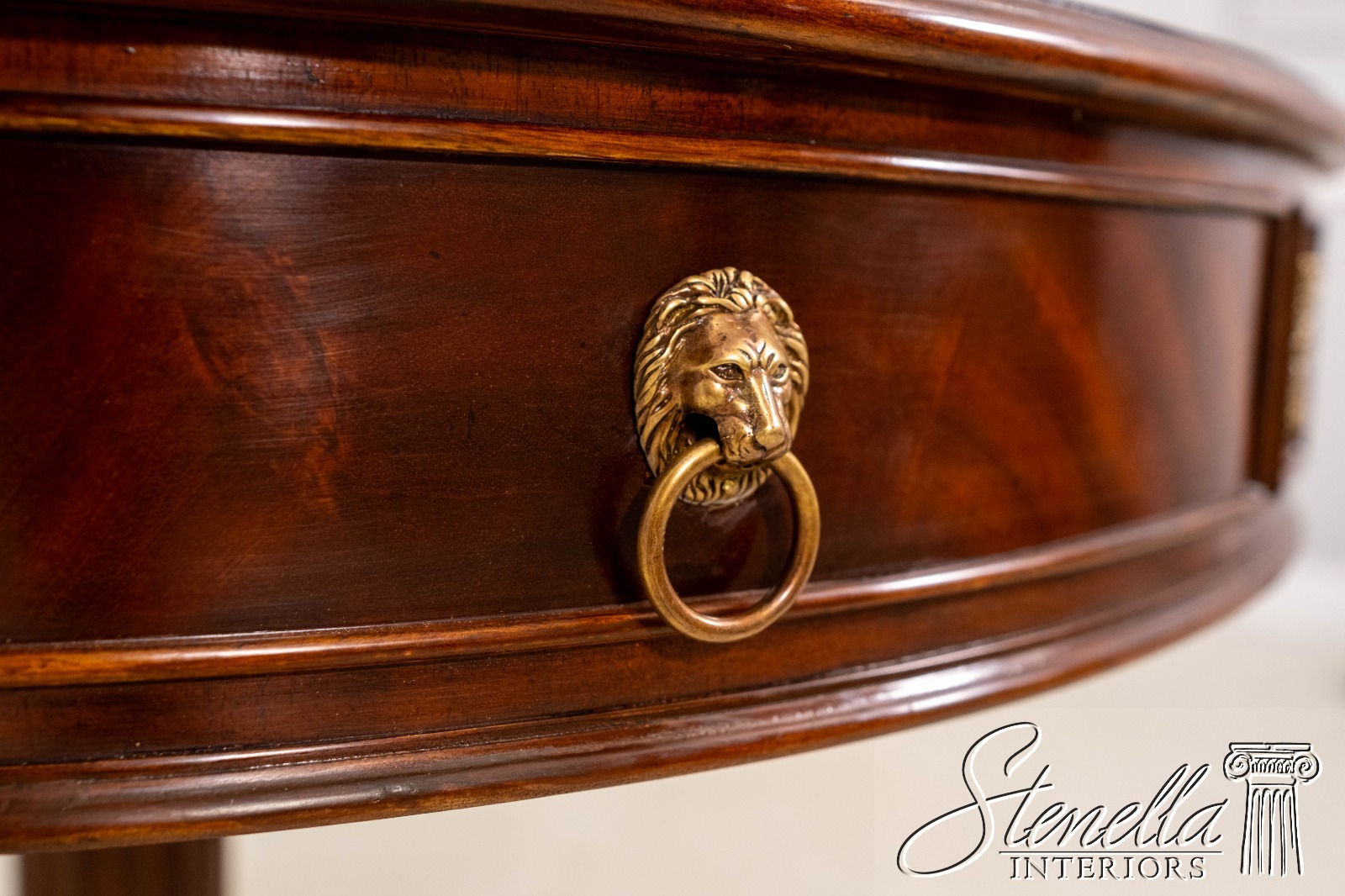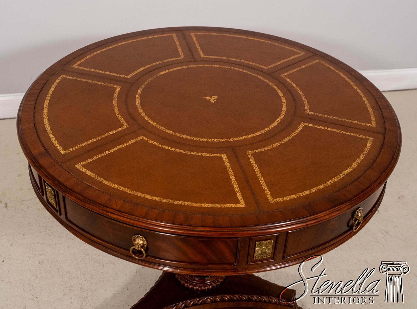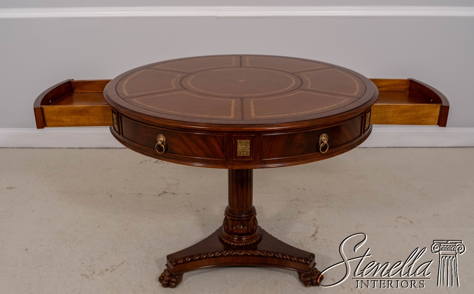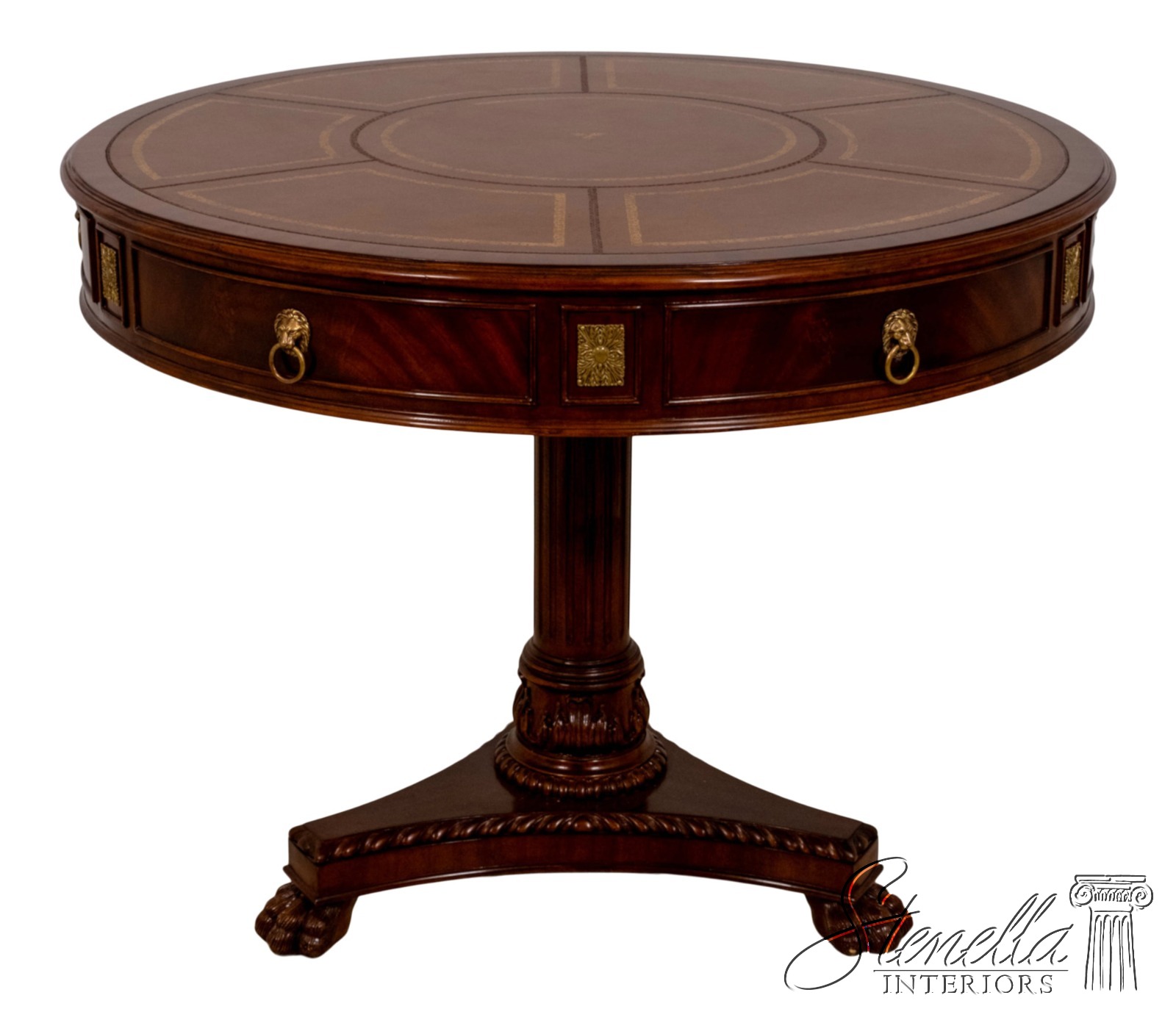 Details: 2 Drawers Platform Pedestal Base High Quality Construction Quality Tooled Leather Top Brass Lion Head Pulls Unboxed For Photography Carved Paw Feet Figural Mahogany Skirt Un-Marked As To Manufacture Offered @ Fraction Original Retail Cost