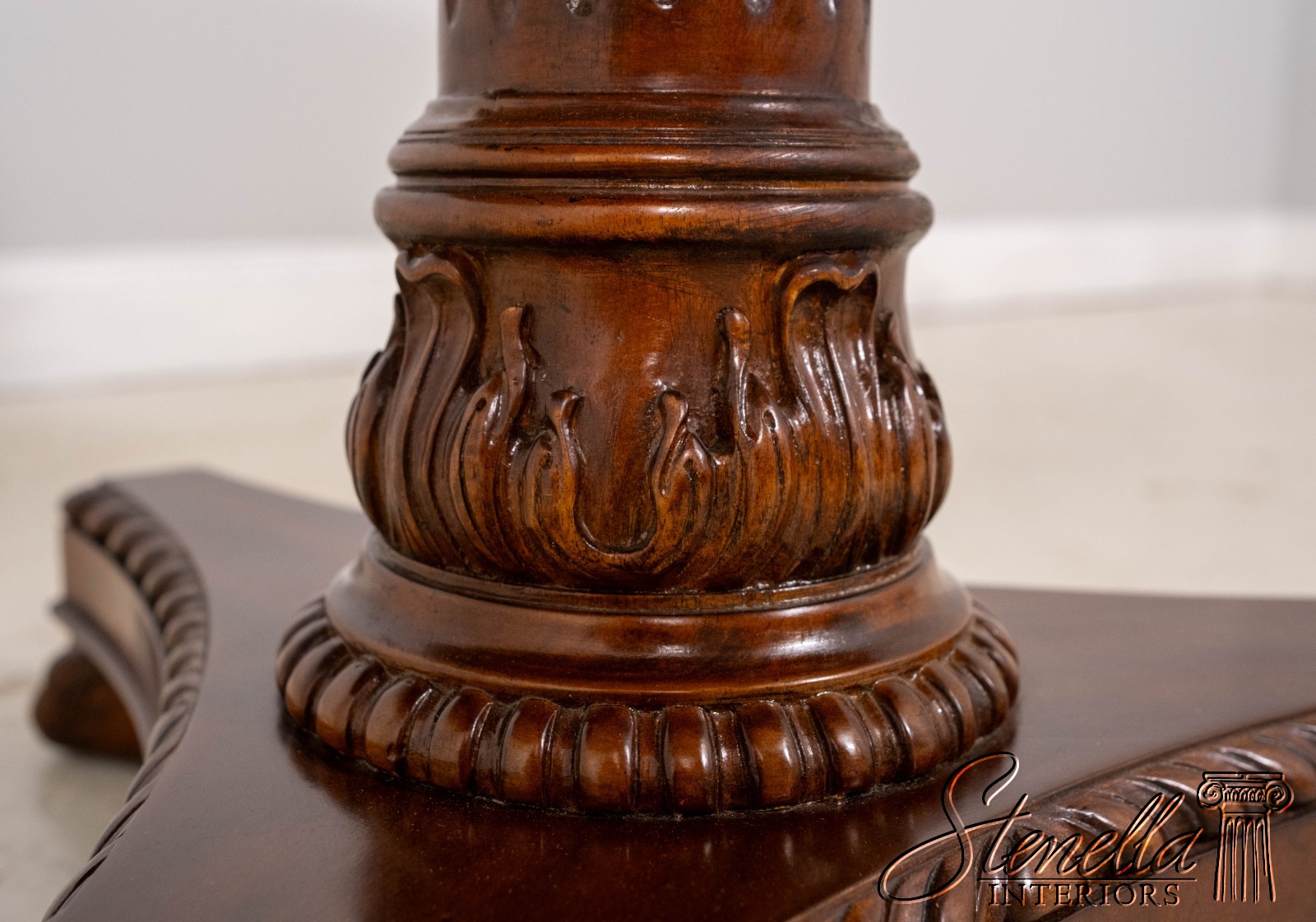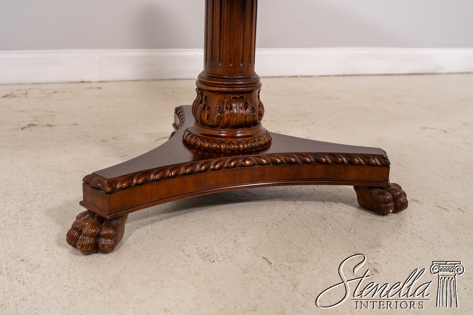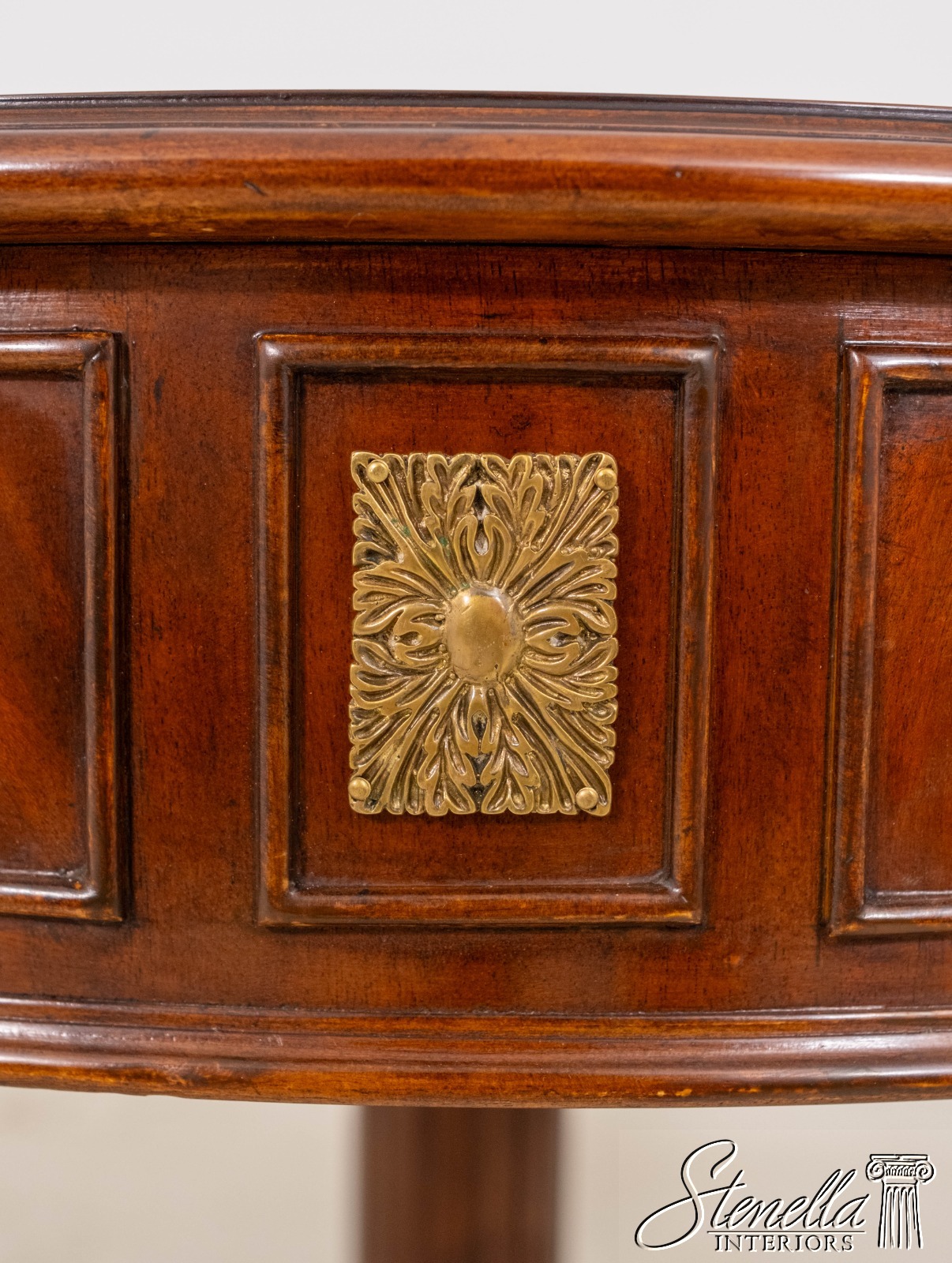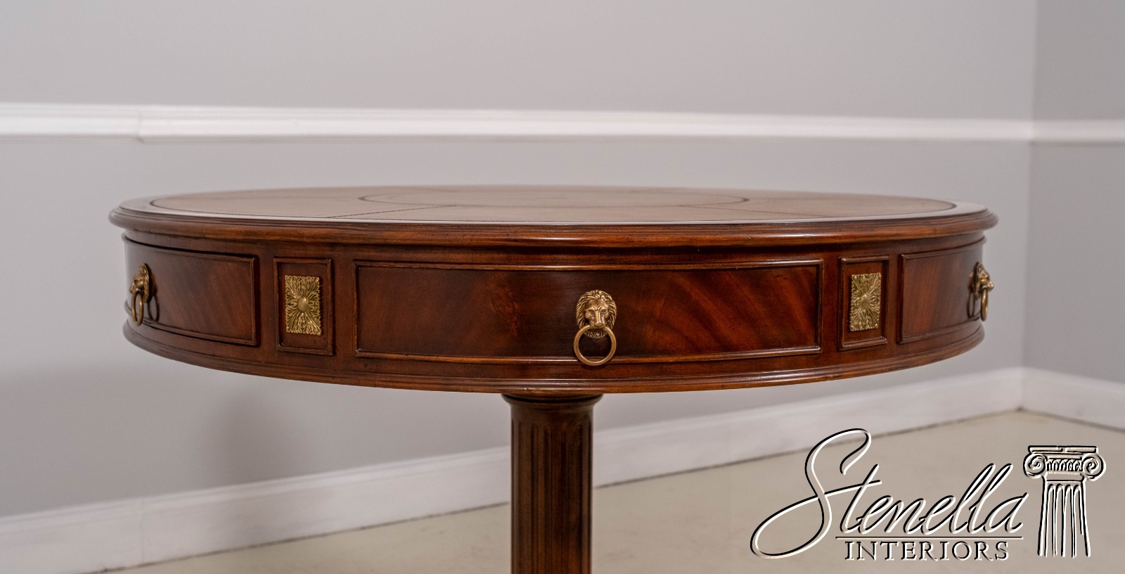 Details: 2 Drawers Platform Pedestal Base High Quality Construction Quality Tooled Leather Top Brass Lion Head Pulls Unboxed For Photography Carved Paw Feet Figural Mahogany Skirt Un-Marked As To Manufacture Offered @ Fraction Original Retail Cost