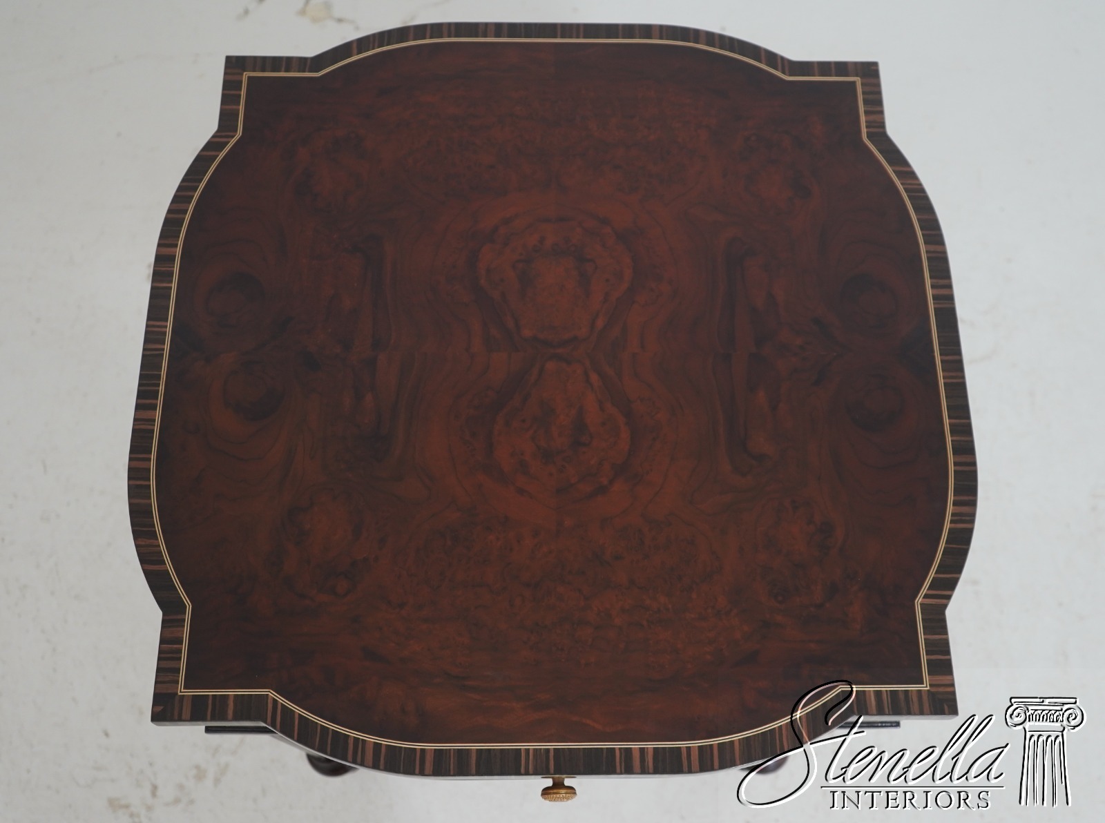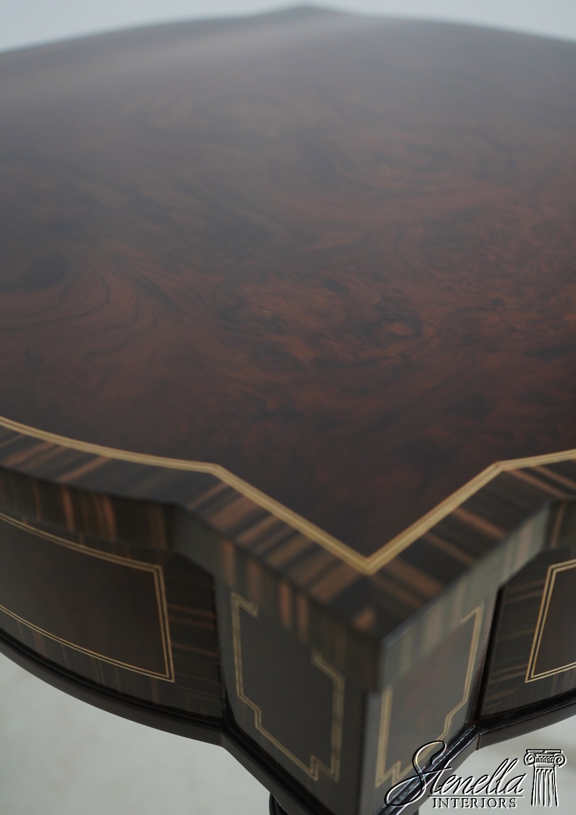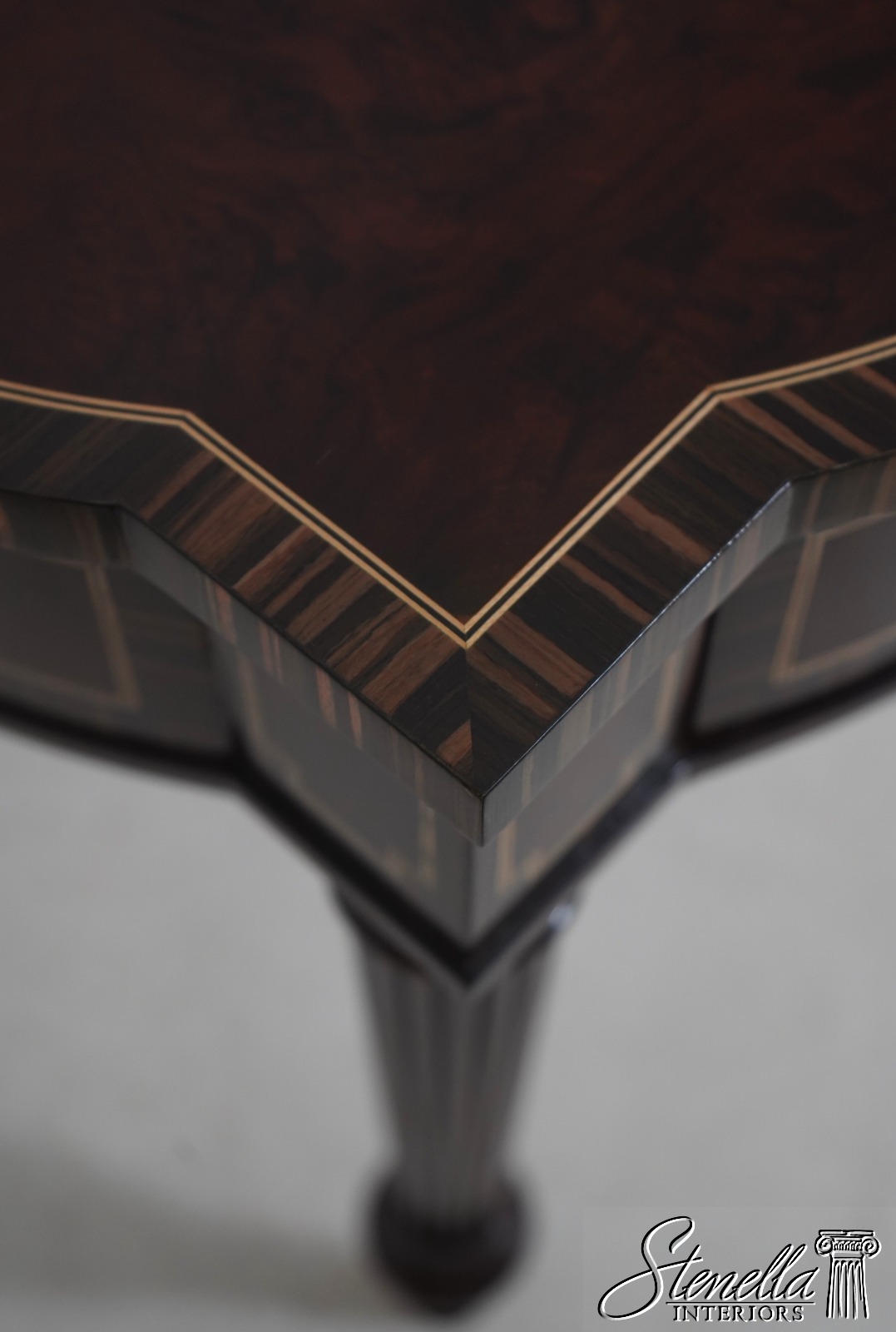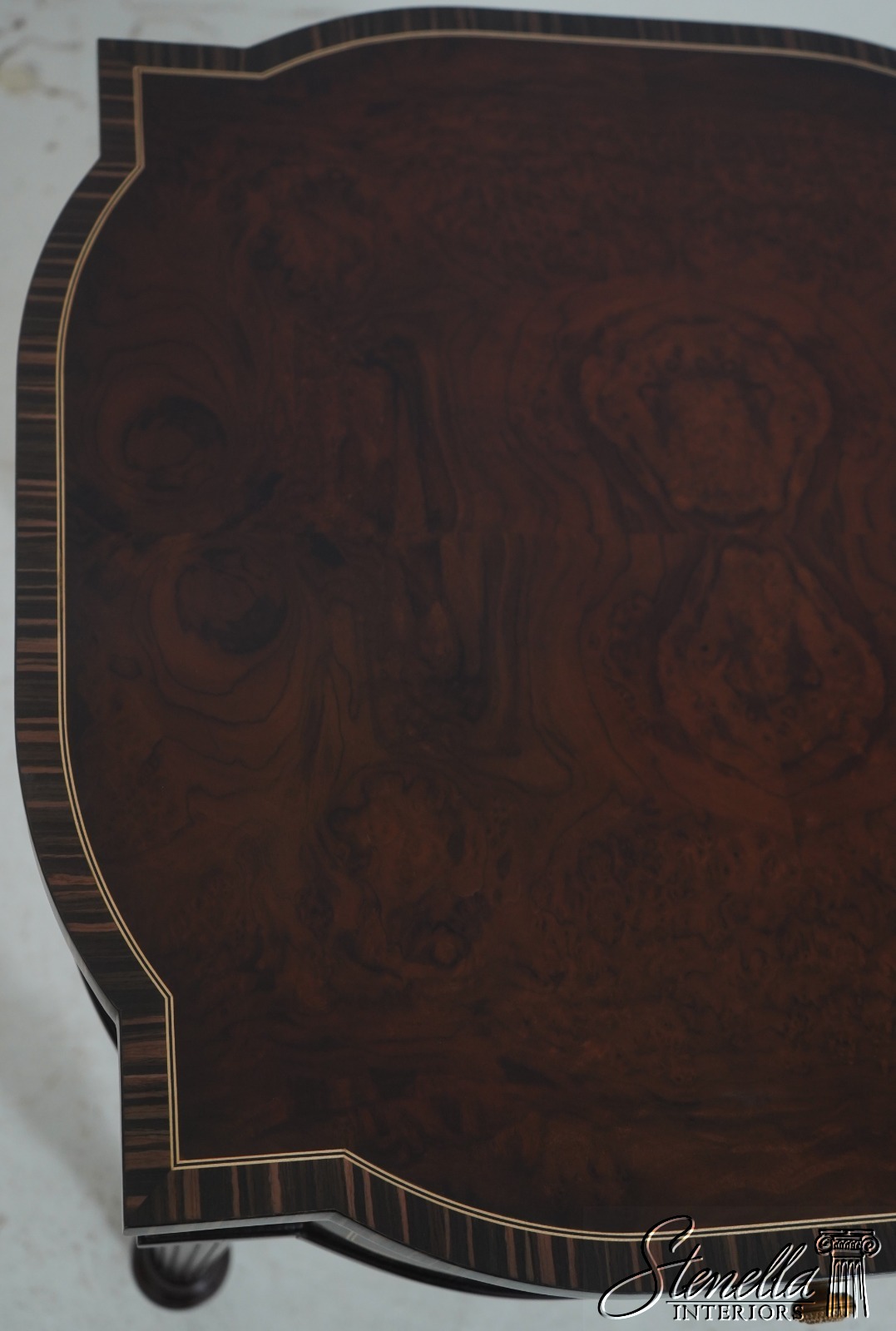 Details: Model 5006-028 High Quality Construction Nice Inlay Work Throughout French Style Gorgeous Burl Walnut Top w. Zebra Walnut Banded Borders Nice Reeded Legs Offered @ Fraction Original Retail Cost