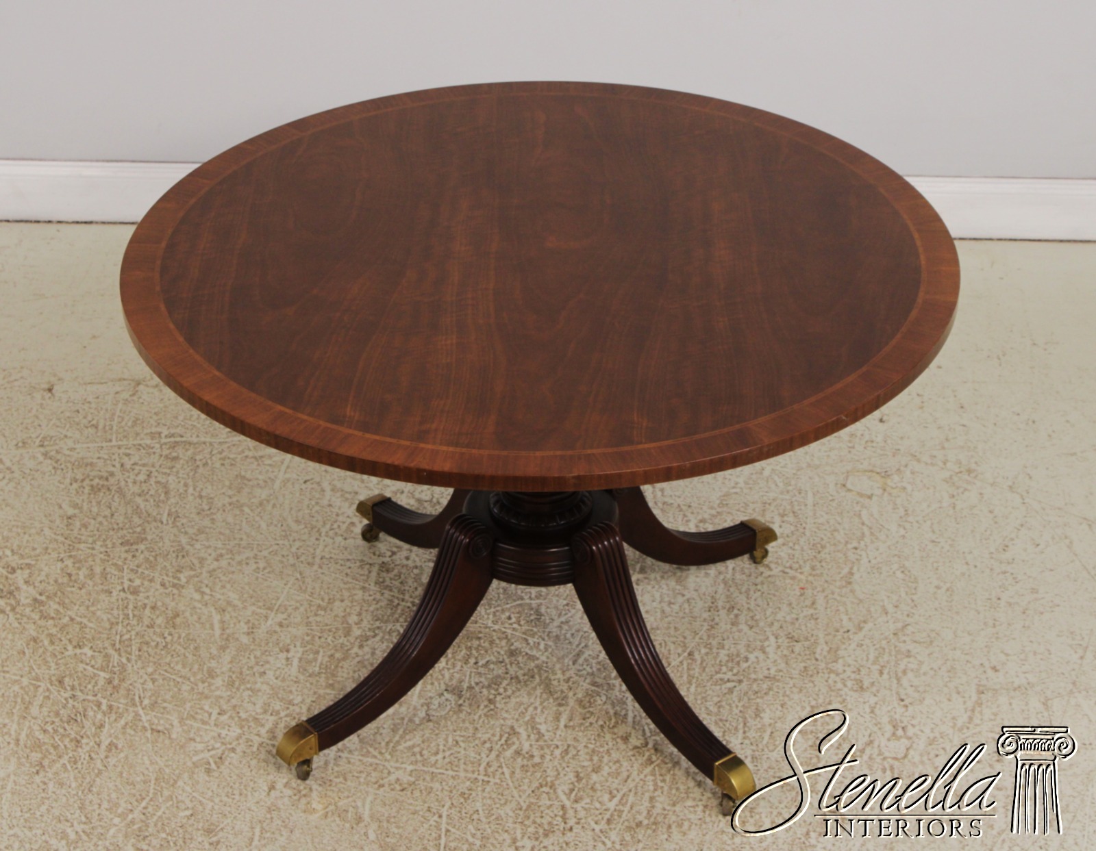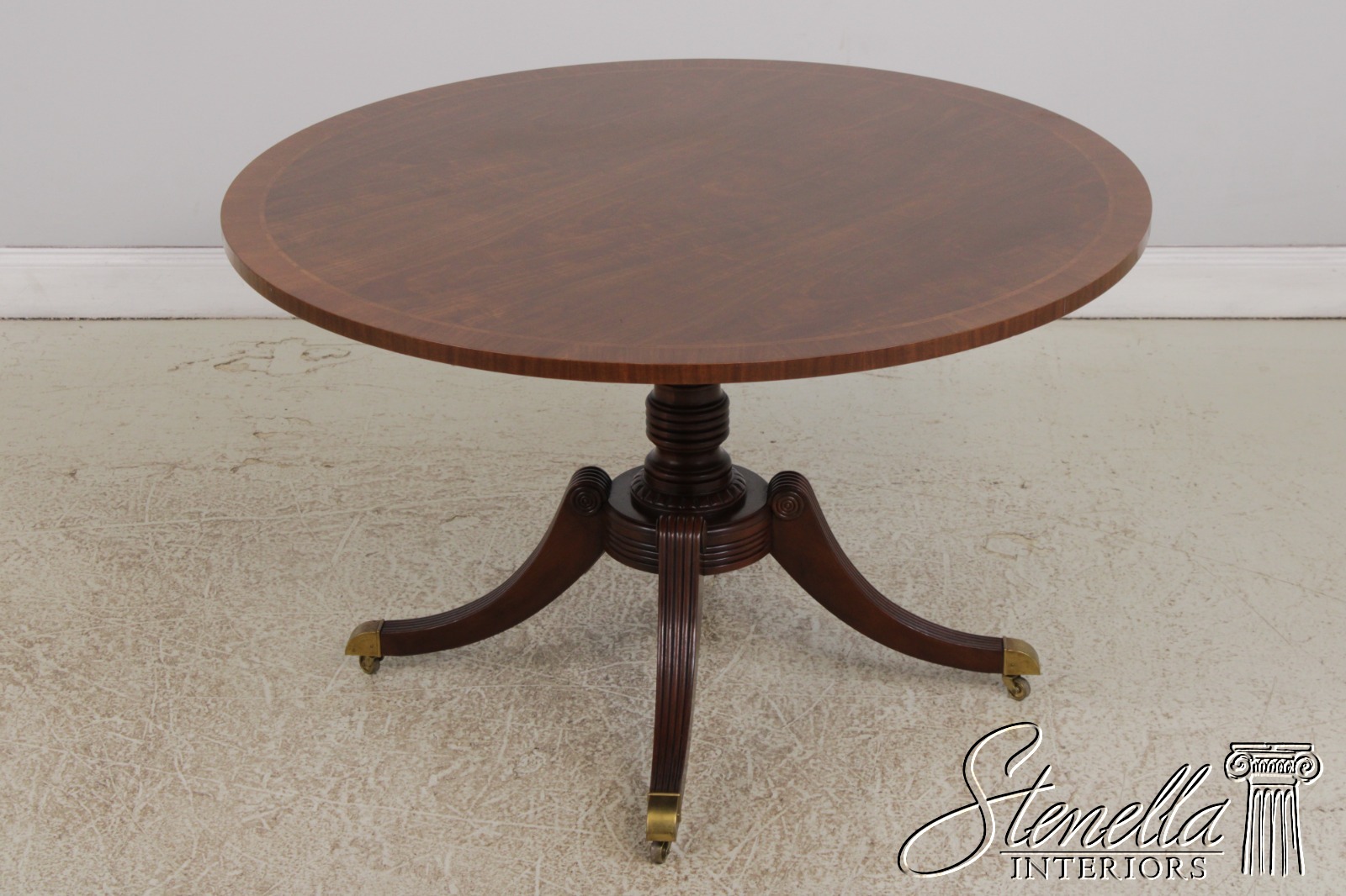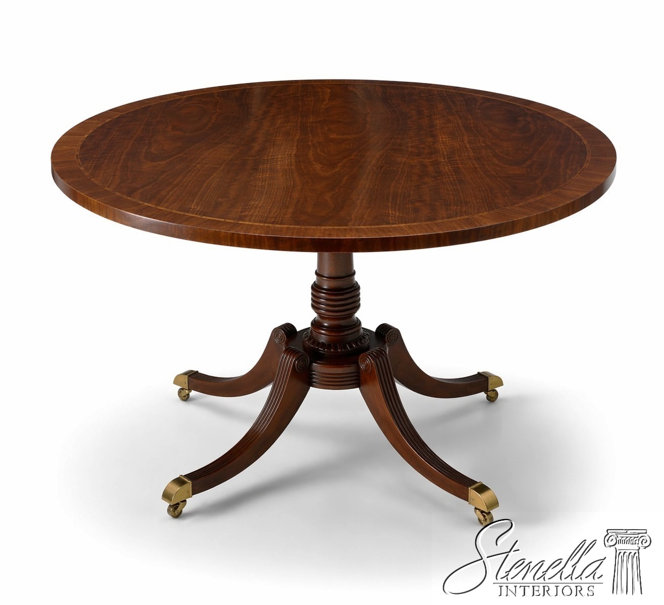 Details: Brass Capped Feed And Casters High Quality Construction Gorgeous Table Nice Inlay Work Throughout Four Leg Base Duncan Phyfe Pedestal Base Reeded Legs Walnut Top With Mahogany Pedestal Base Offered At A Fraction Of The Original Retail Cost