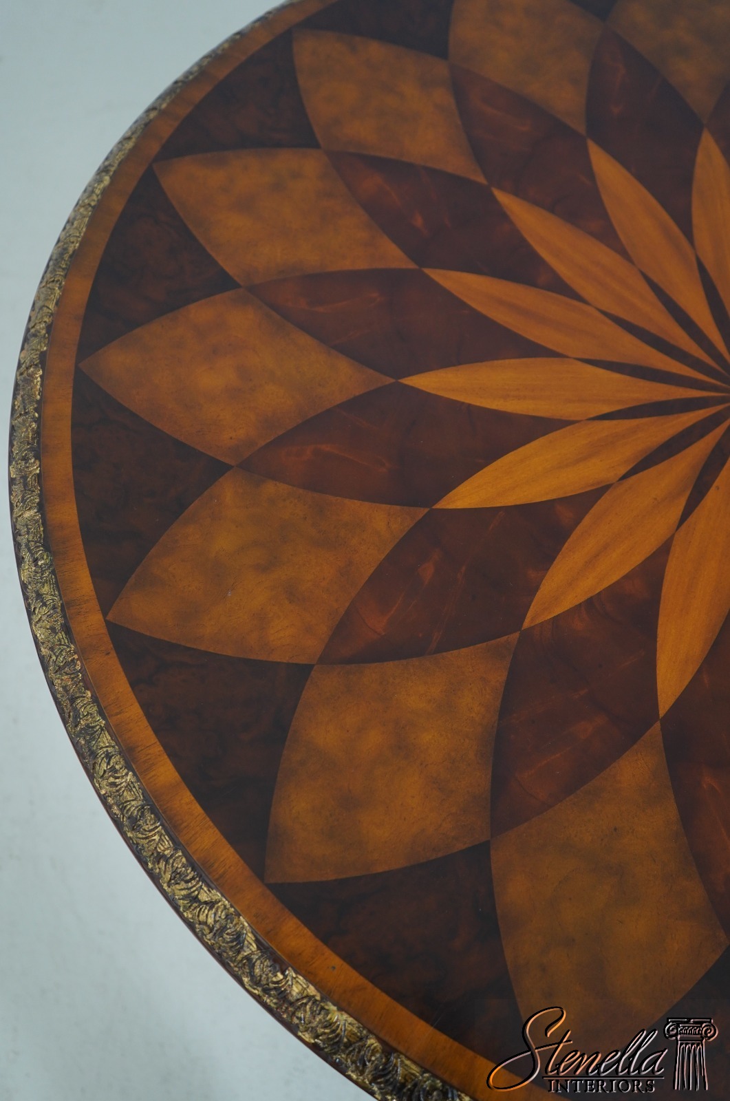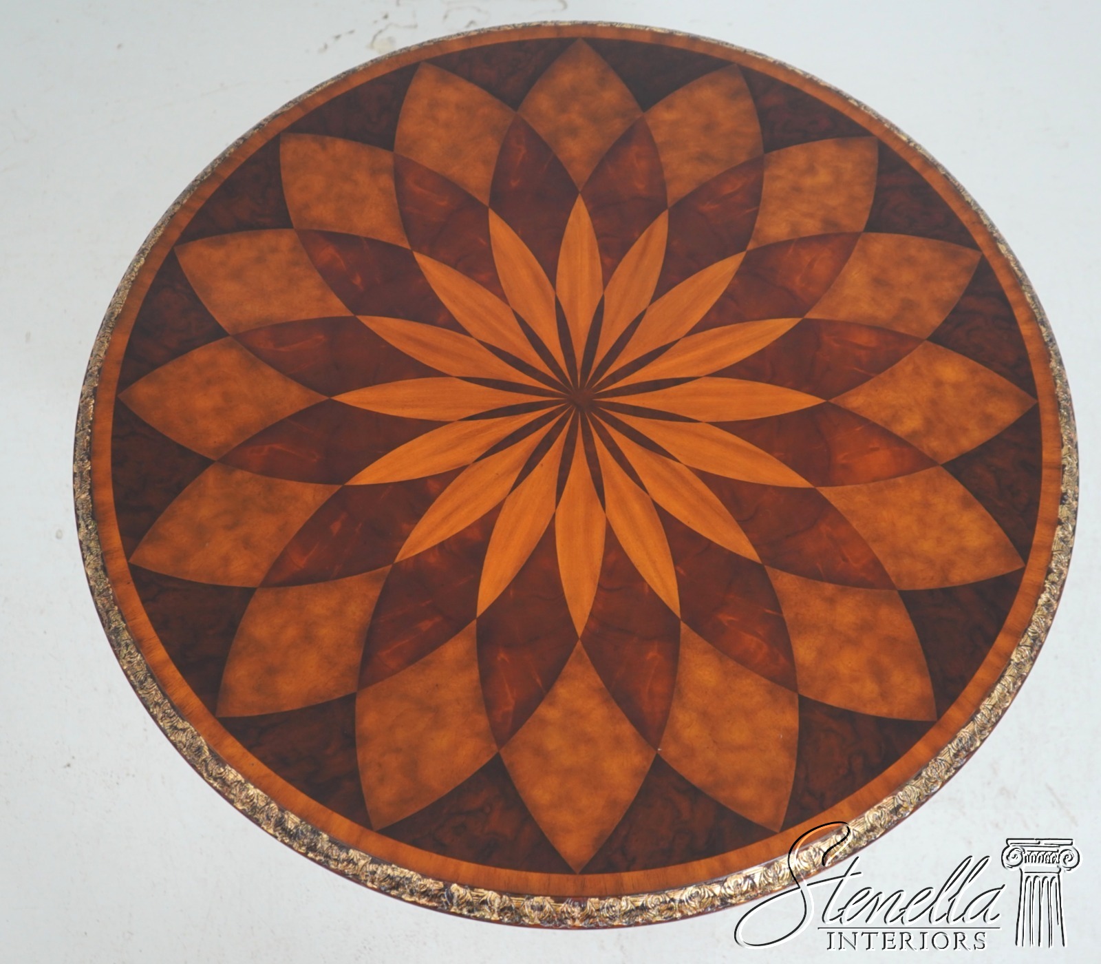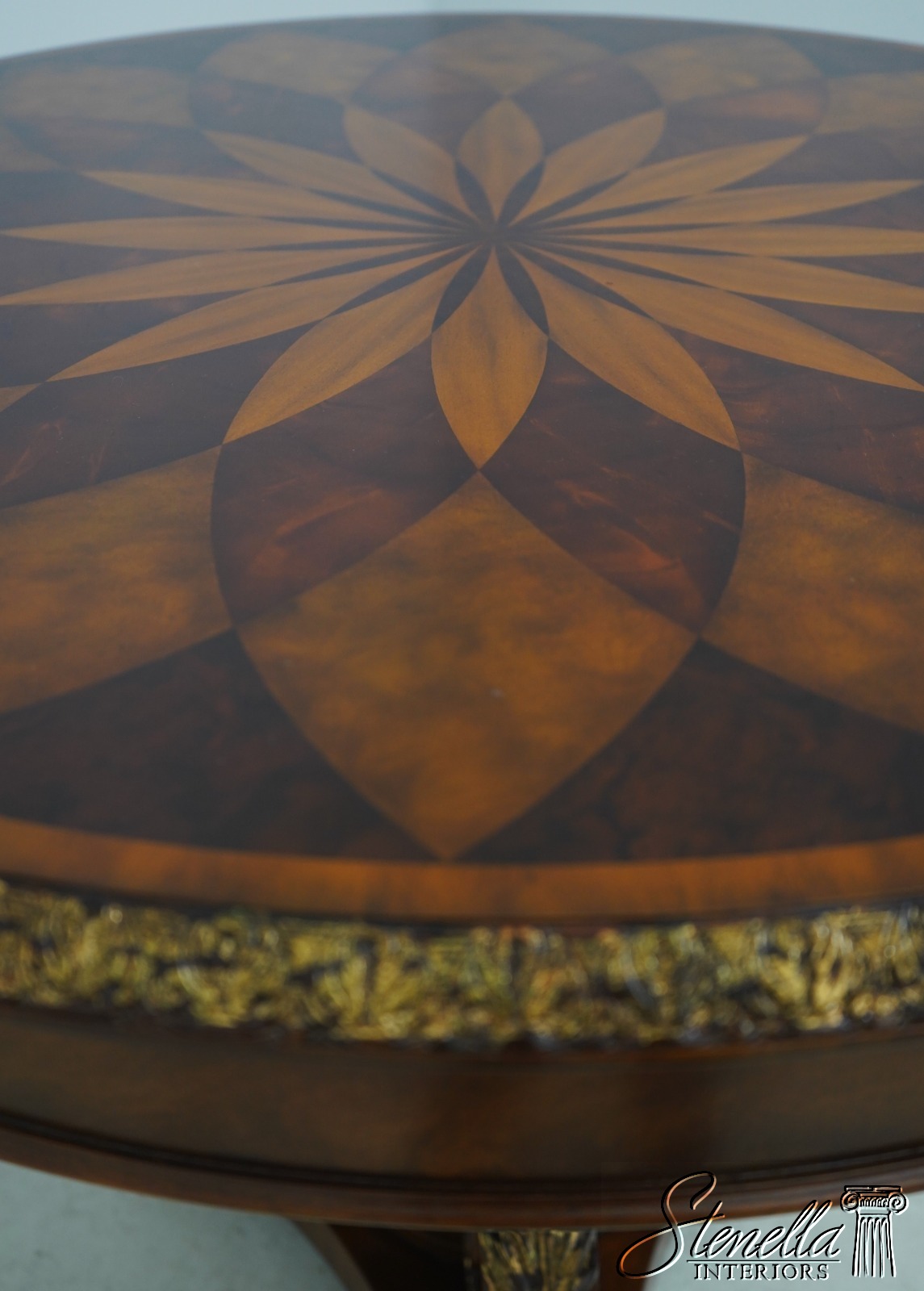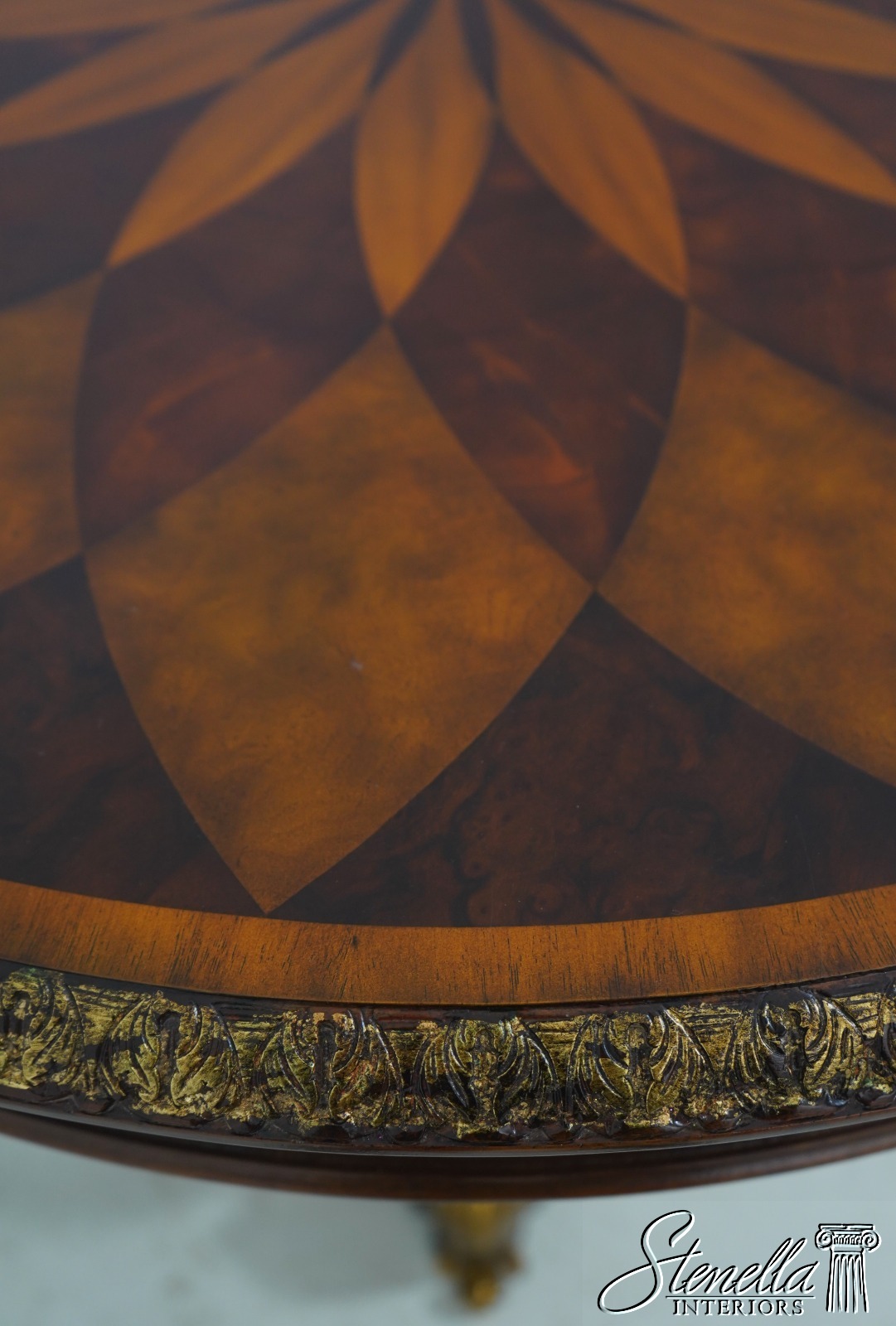 Details: Carved Edge Top w. Gold Highlights Quality Construction Ornate Base w. Brass Or Bronze Feet Burl Walnut, Mahogany & Satinwood Veneers Parquetry Inlaid Top Offered @ Fraction Original Retail Cost