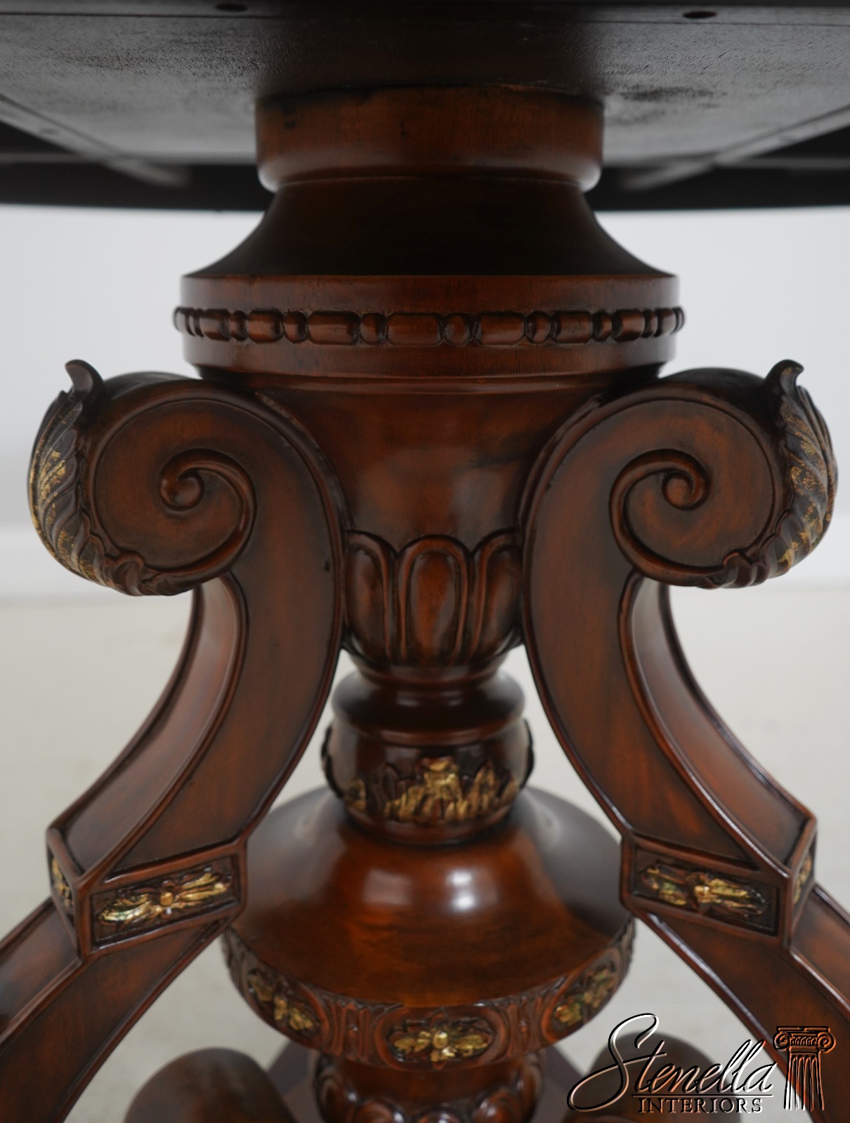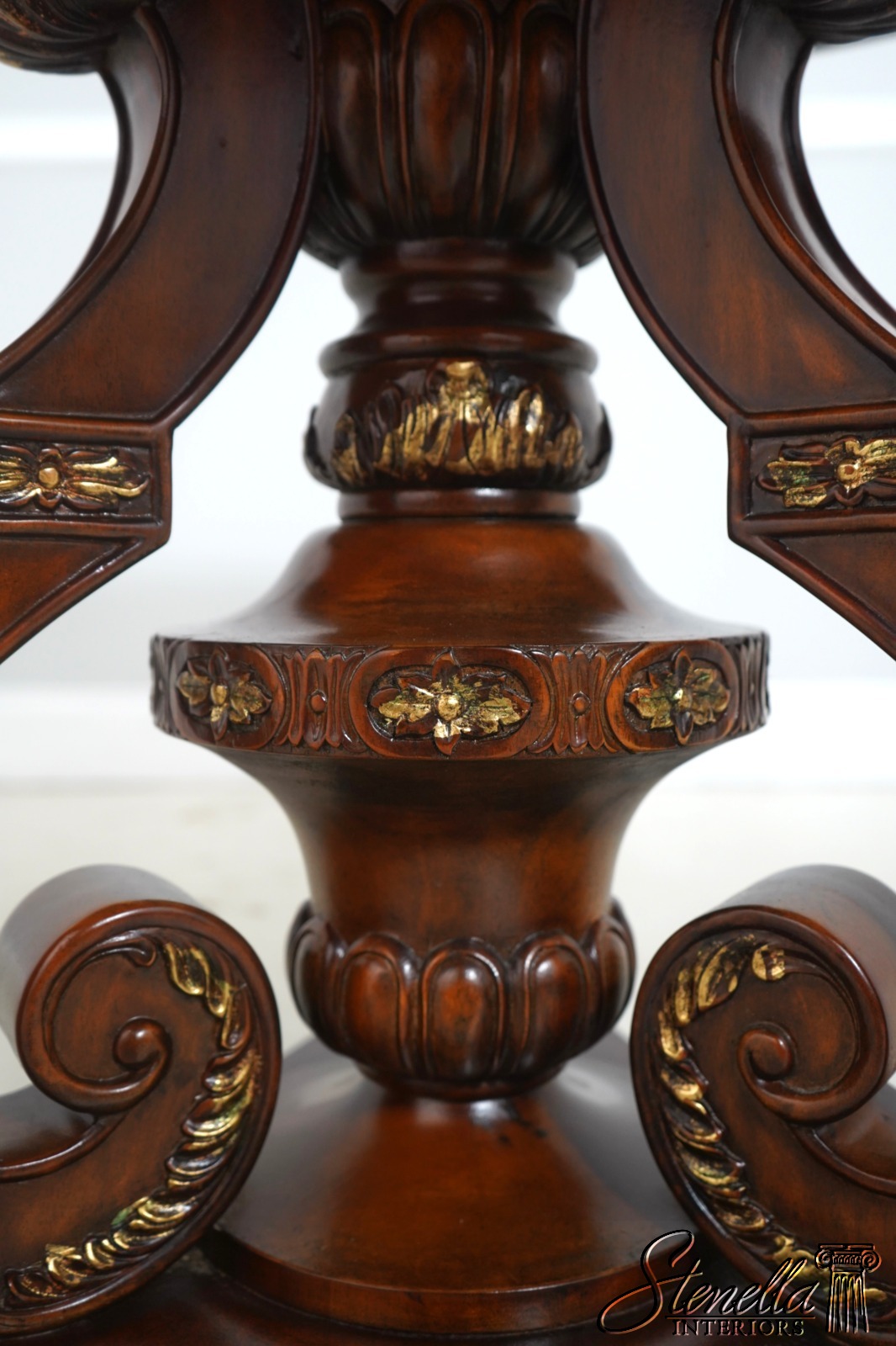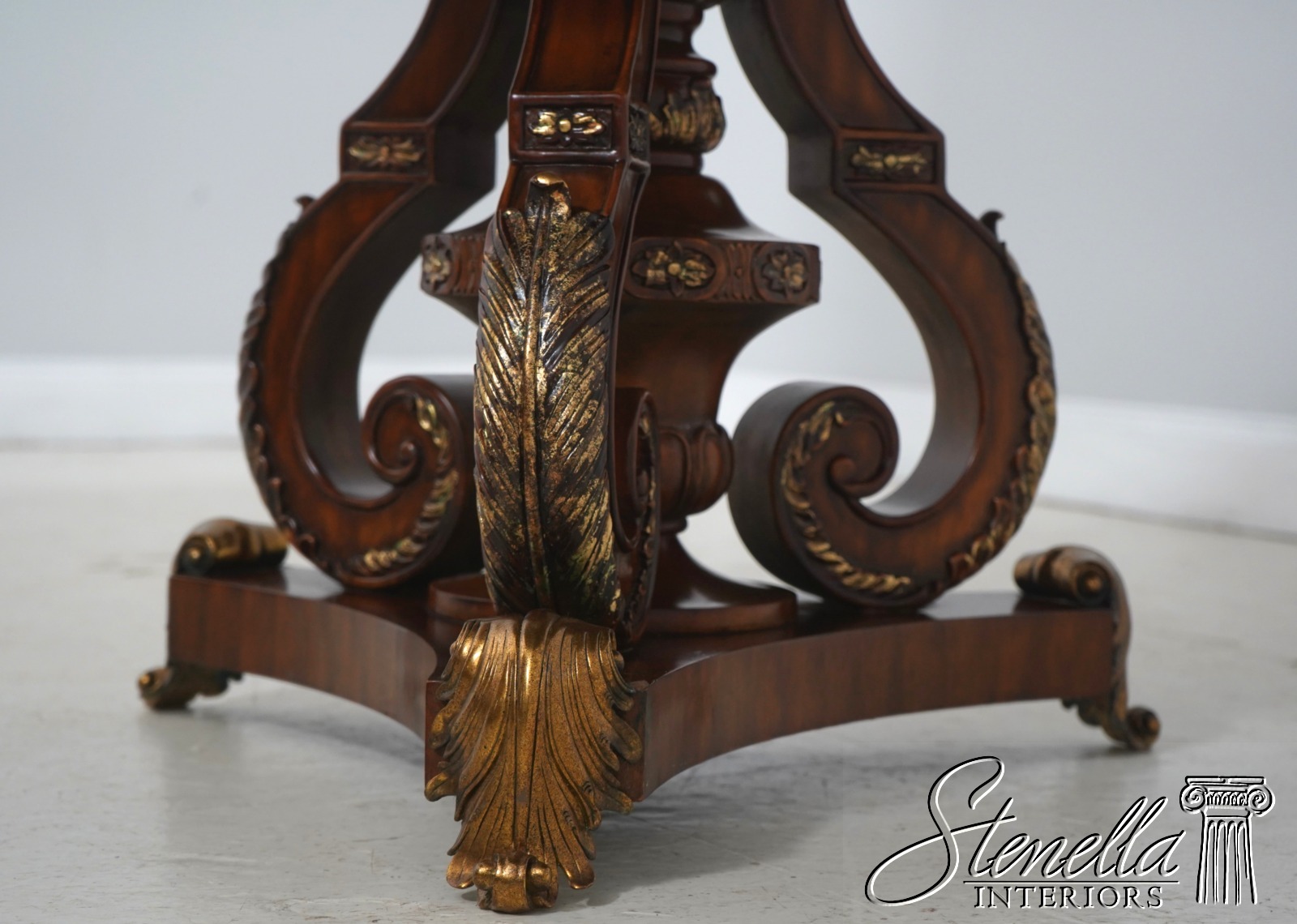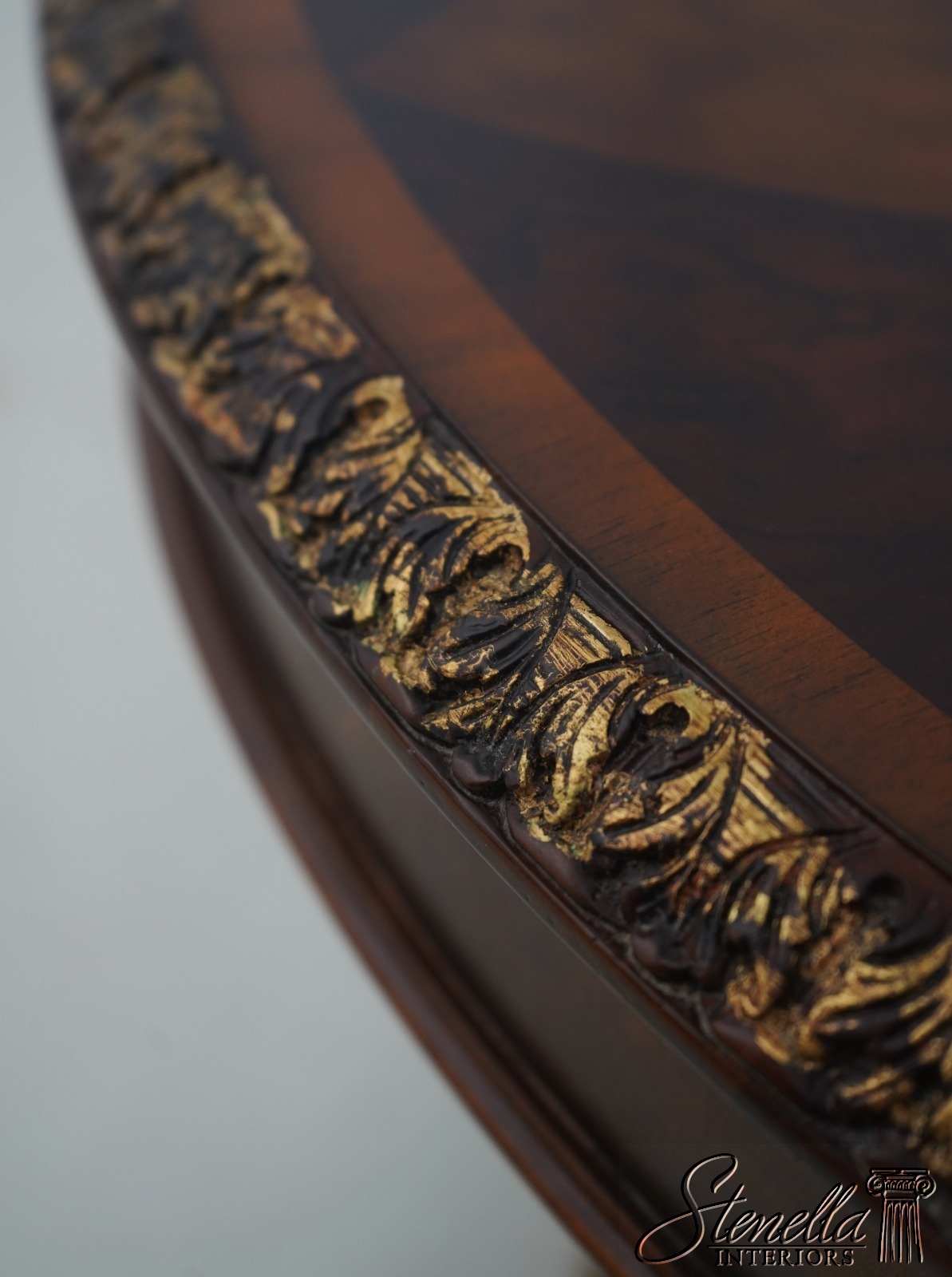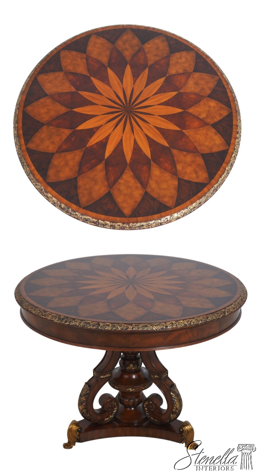 Details: Carved Edge Top w. Gold Highlights Quality Construction Ornate Base w. Brass Or Bronze Feet Burl Walnut, Mahogany & Satinwood Veneers Parquetry Inlaid Top Offered @ Fraction Original Retail Cost