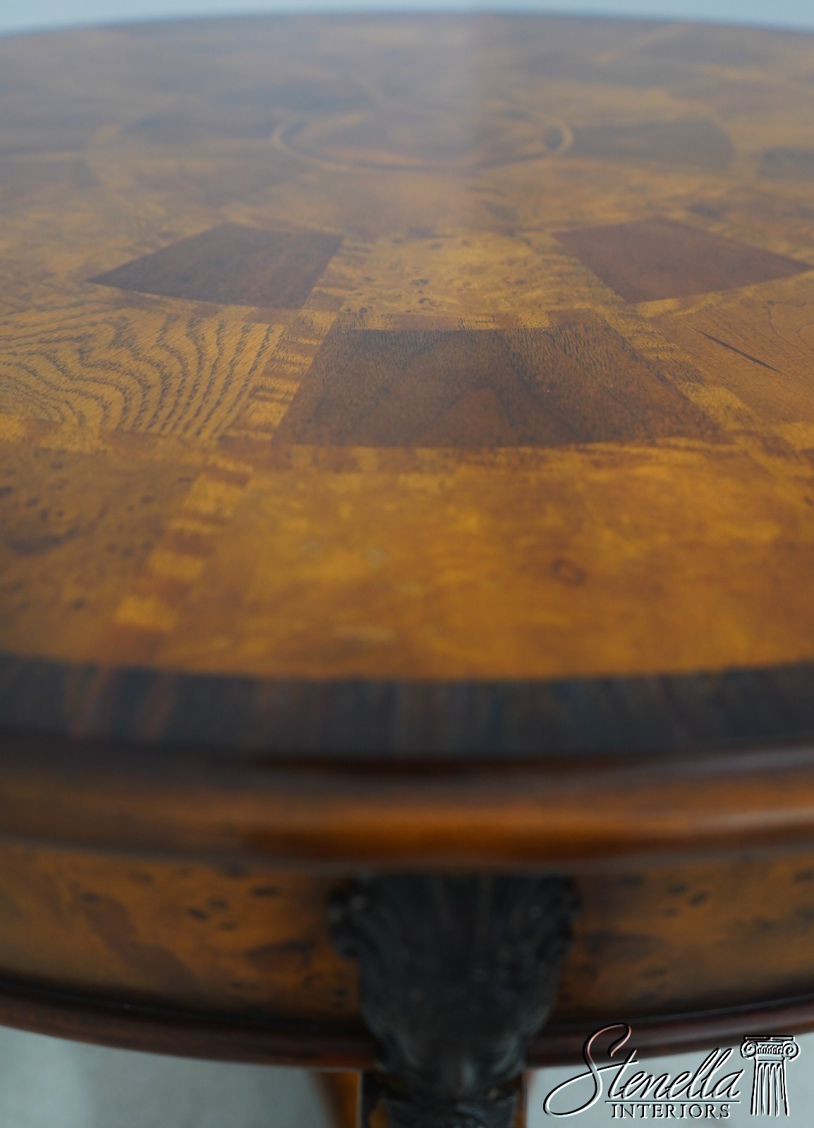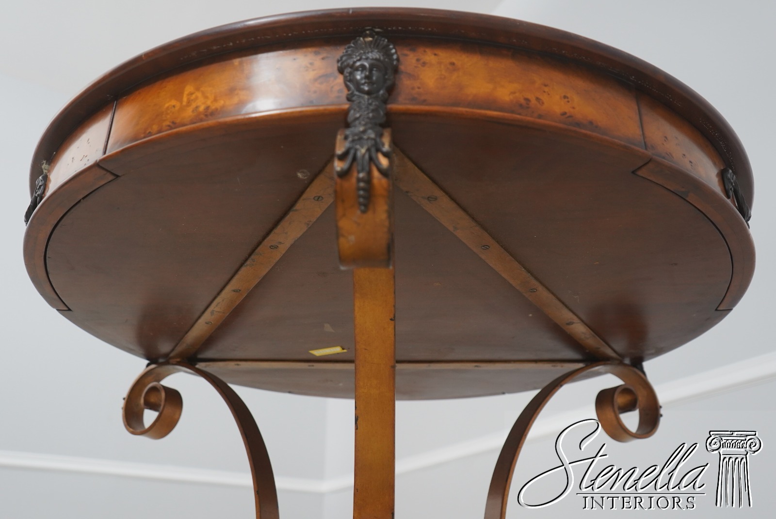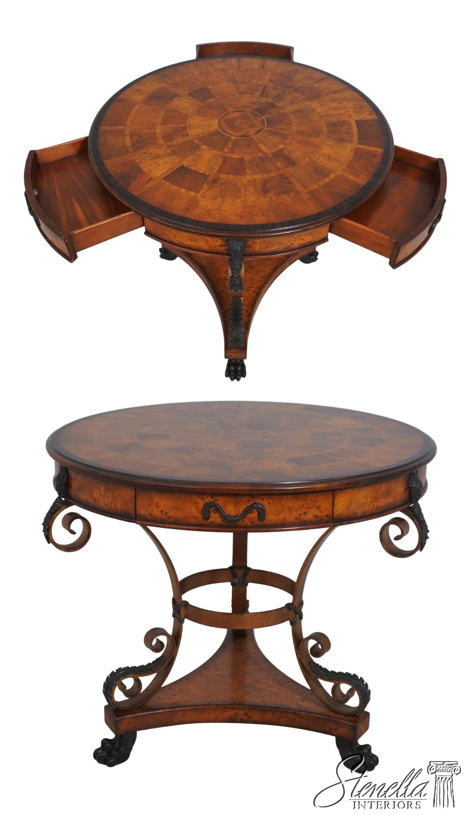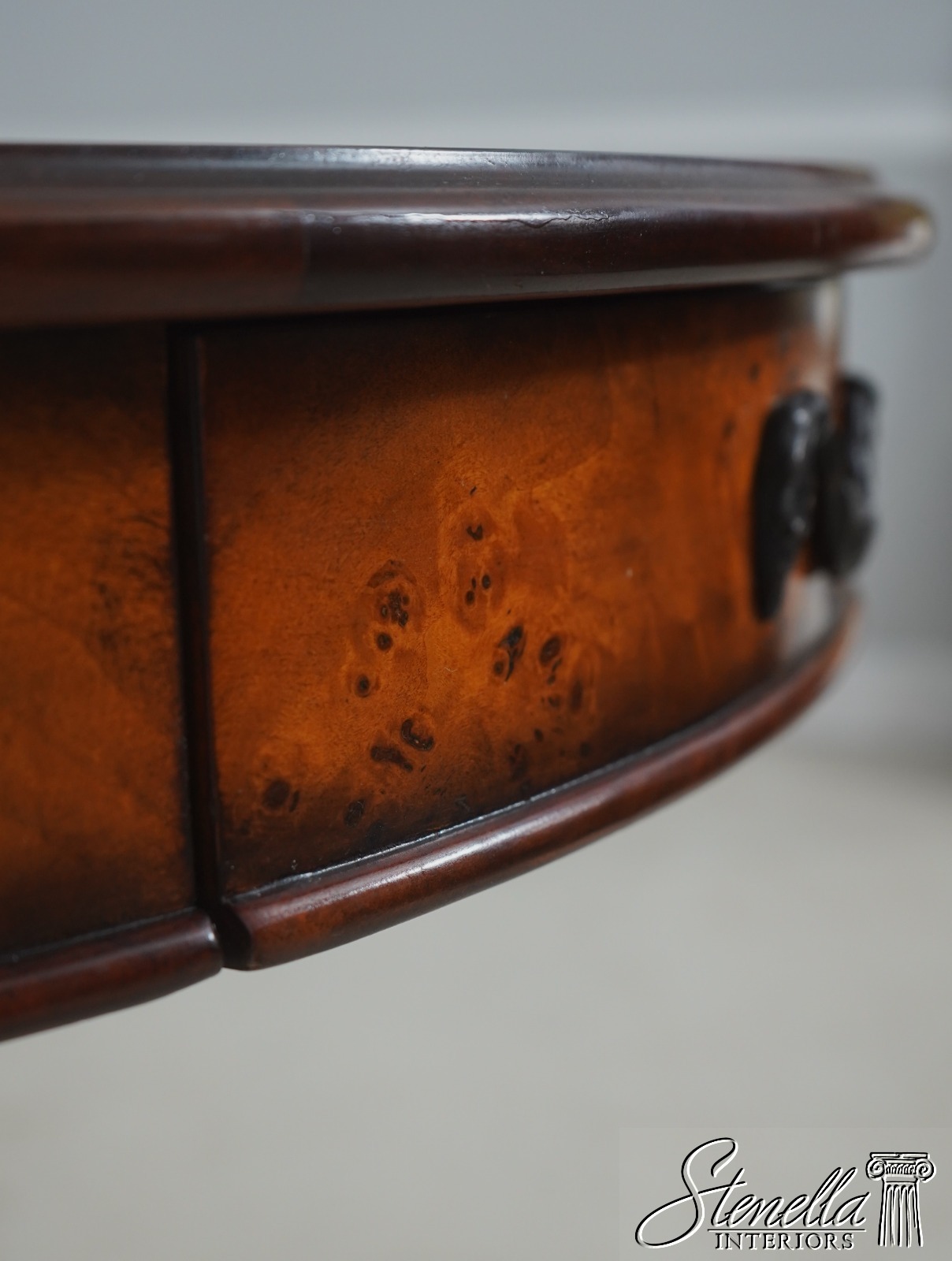- L71378: THEODORE ALEXANDER Round Iron And Burl Walnut Drum Table