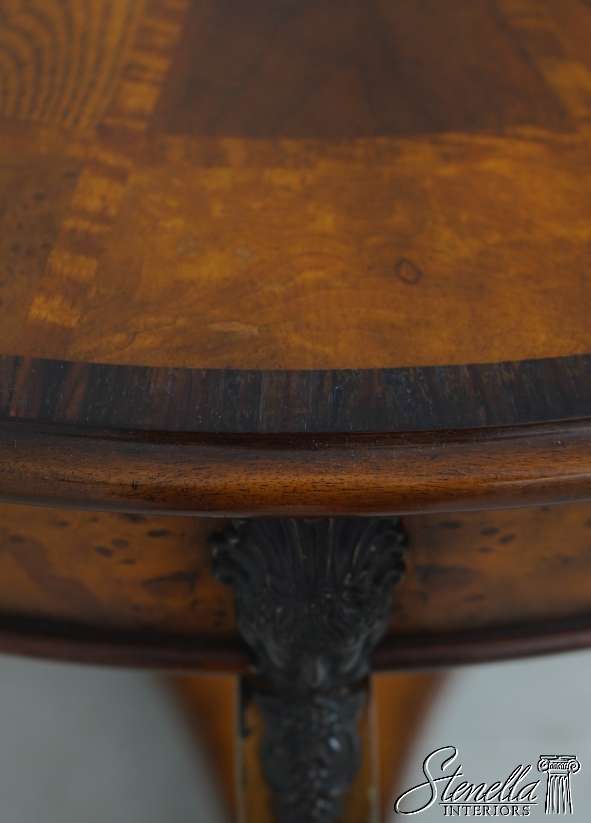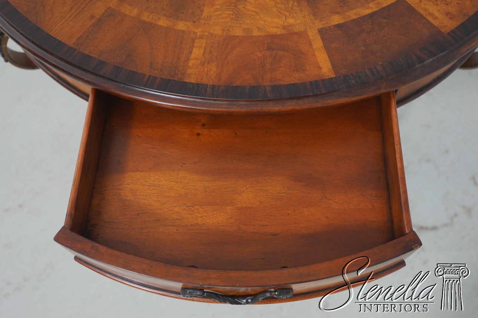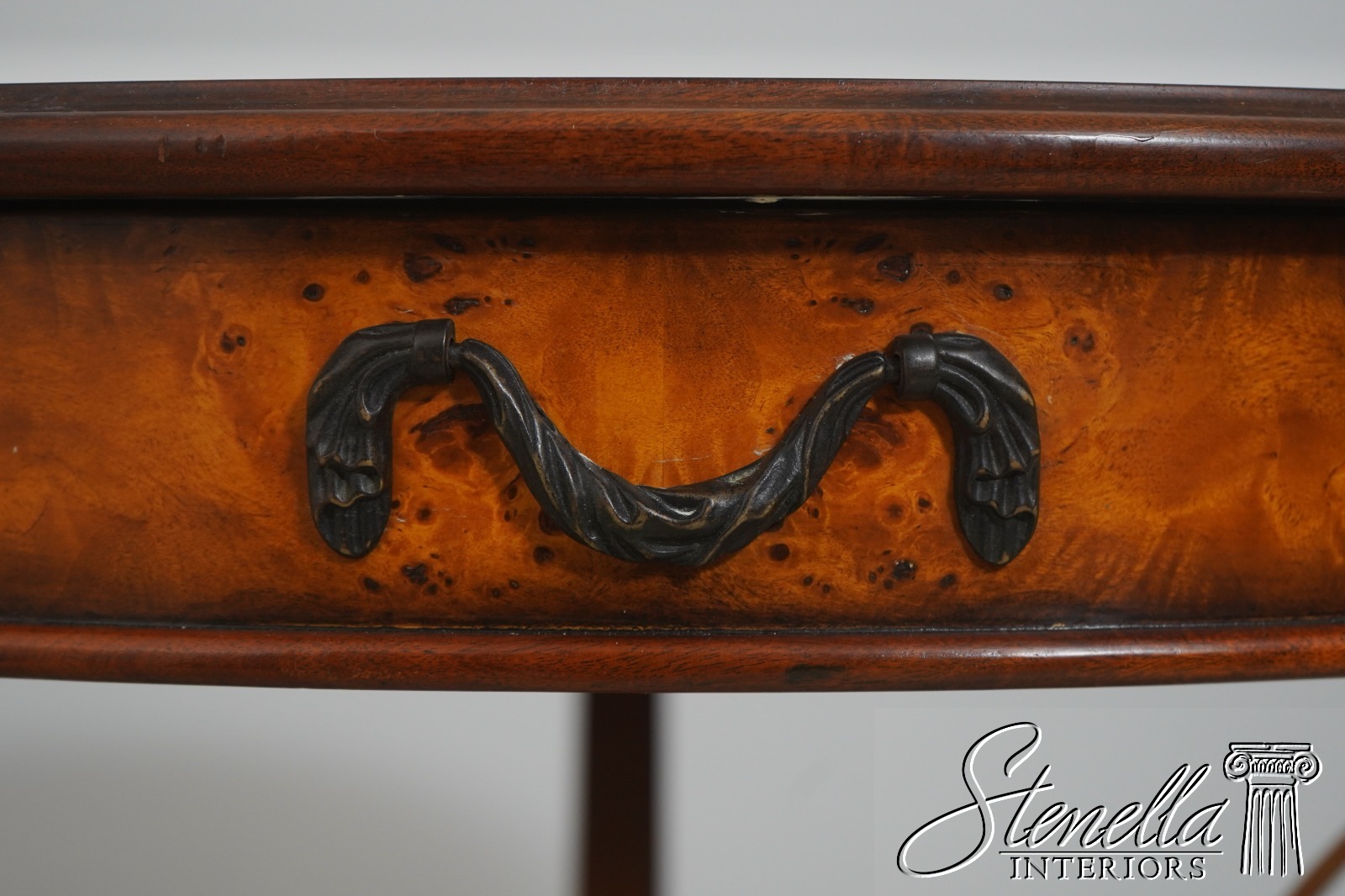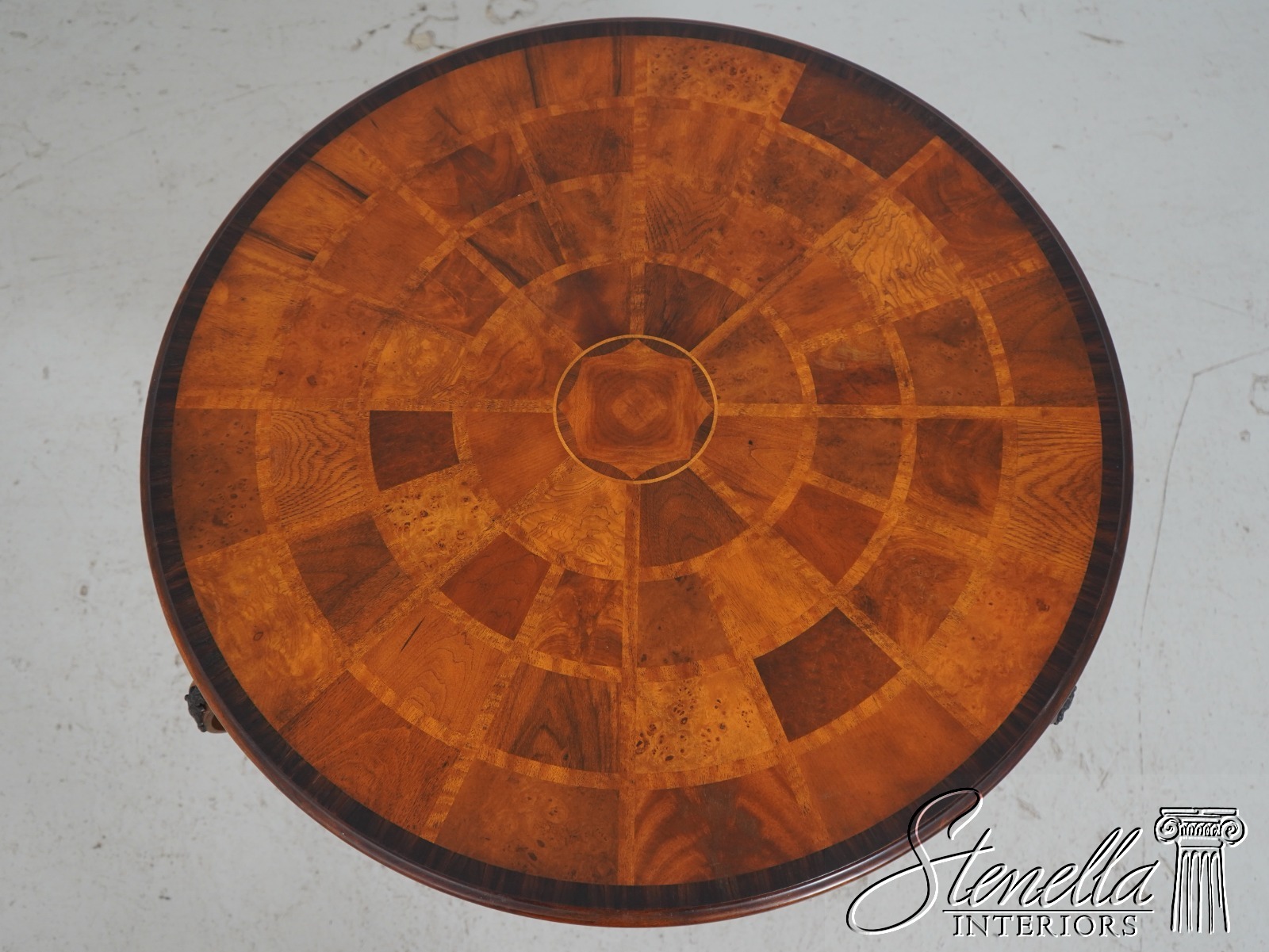 - L71378: THEODORE ALEXANDER Round Iron And Burl Walnut Drum Table
