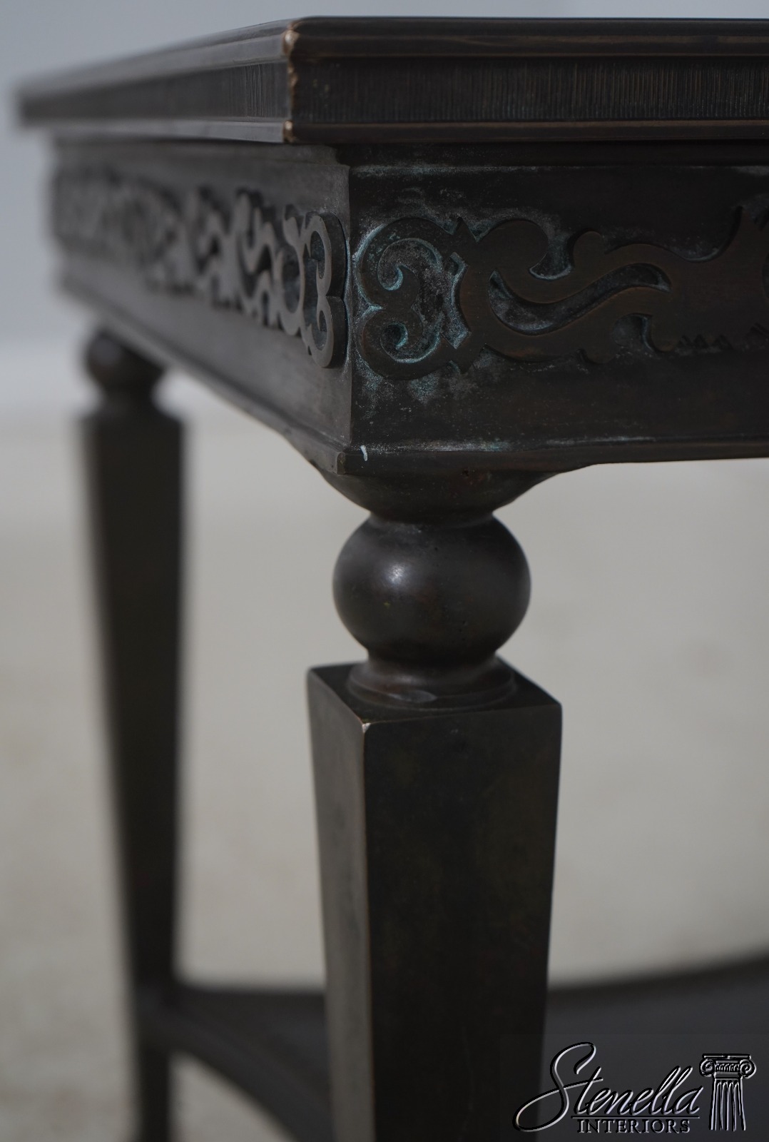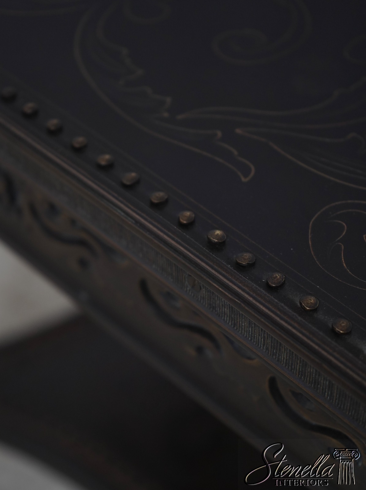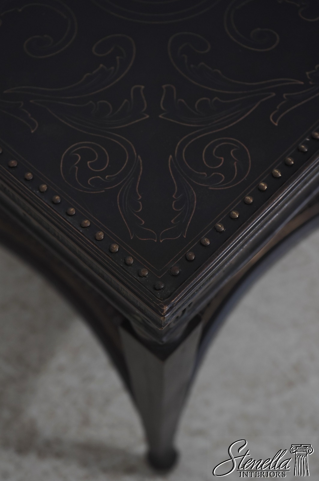 Details: Quality Construction Tack Head Trim Tapered Legs Spade Feet Nice Studded & Embossed Bronze Surface Etched Top & Shelf Un-Marked As To Manufacture Offered @ Fraction Original Retail Cost