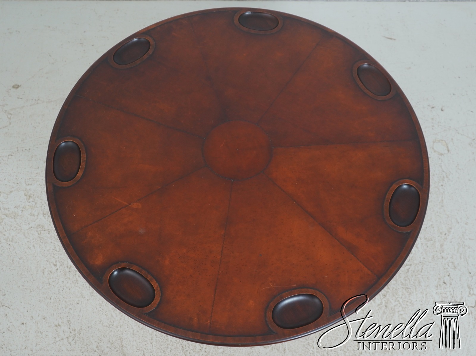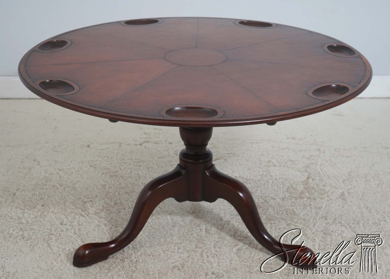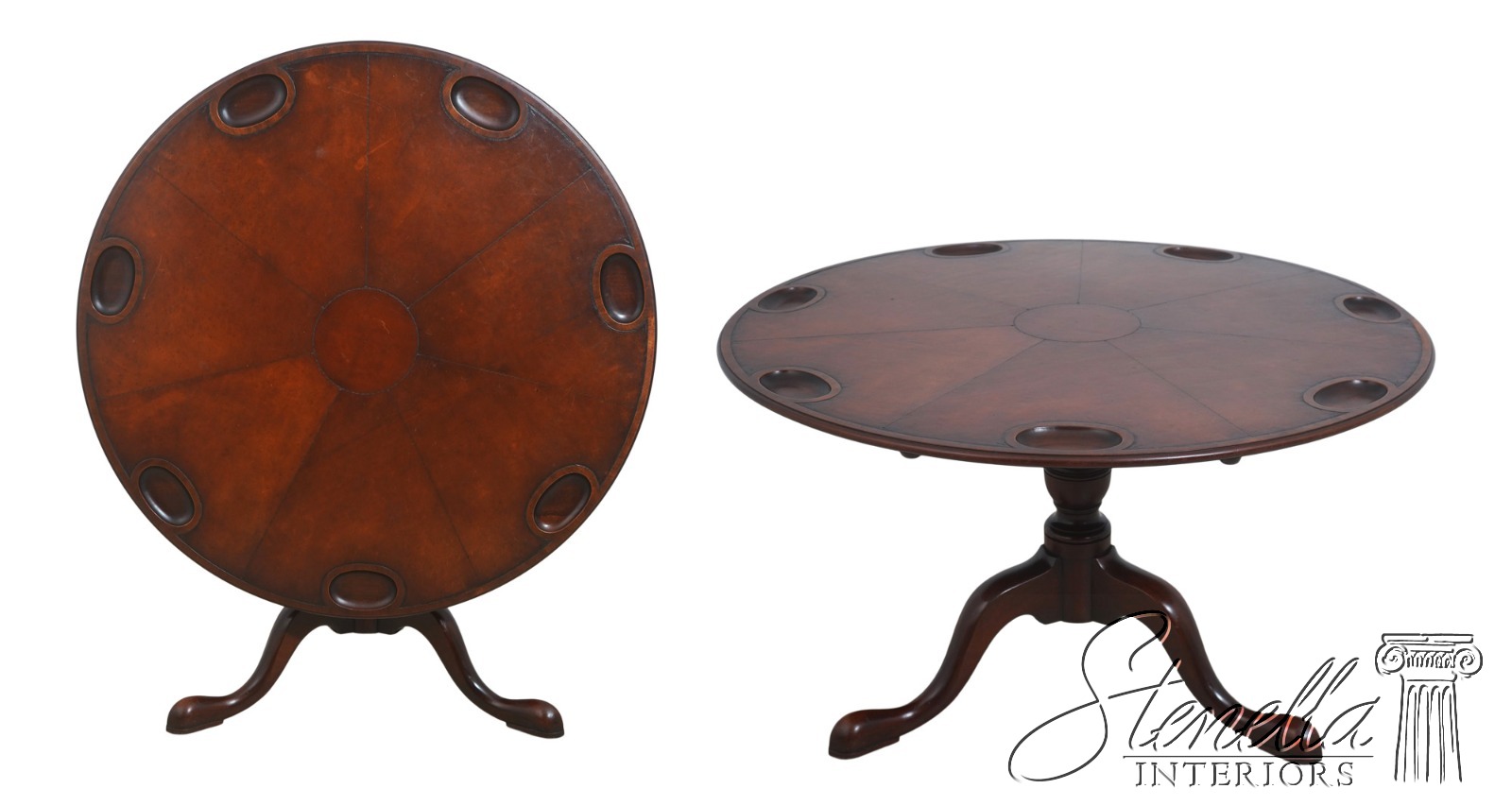 Round, embossed leather top and wide tripod base with cabriole legs and club feet