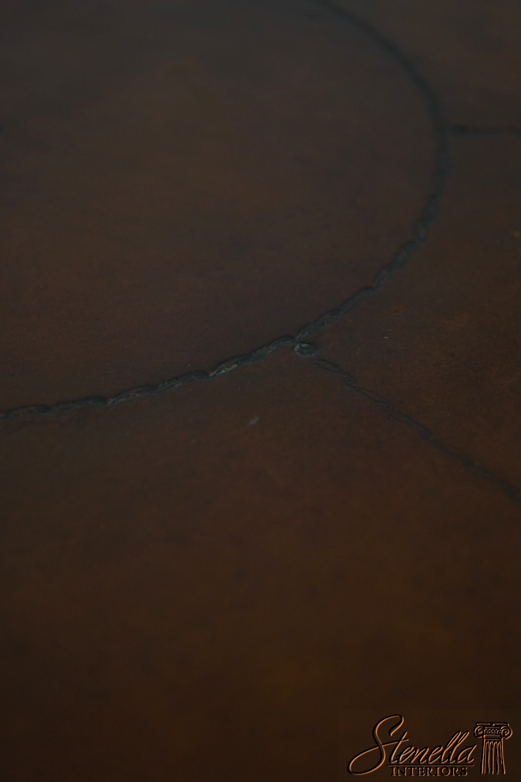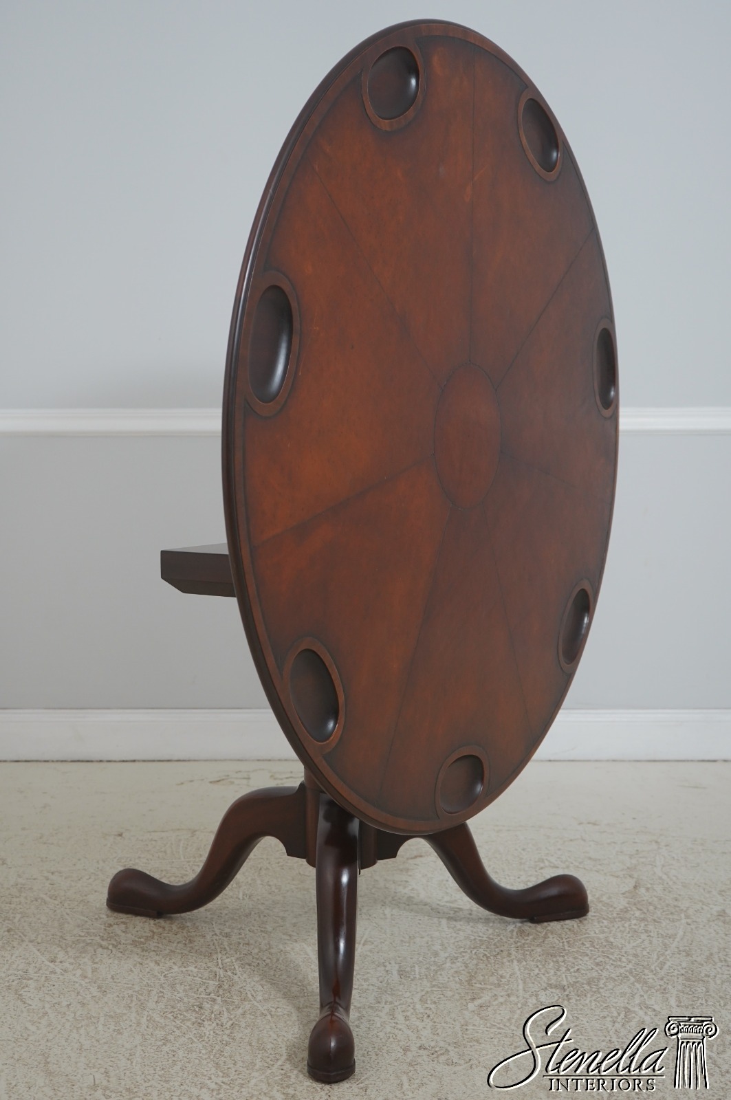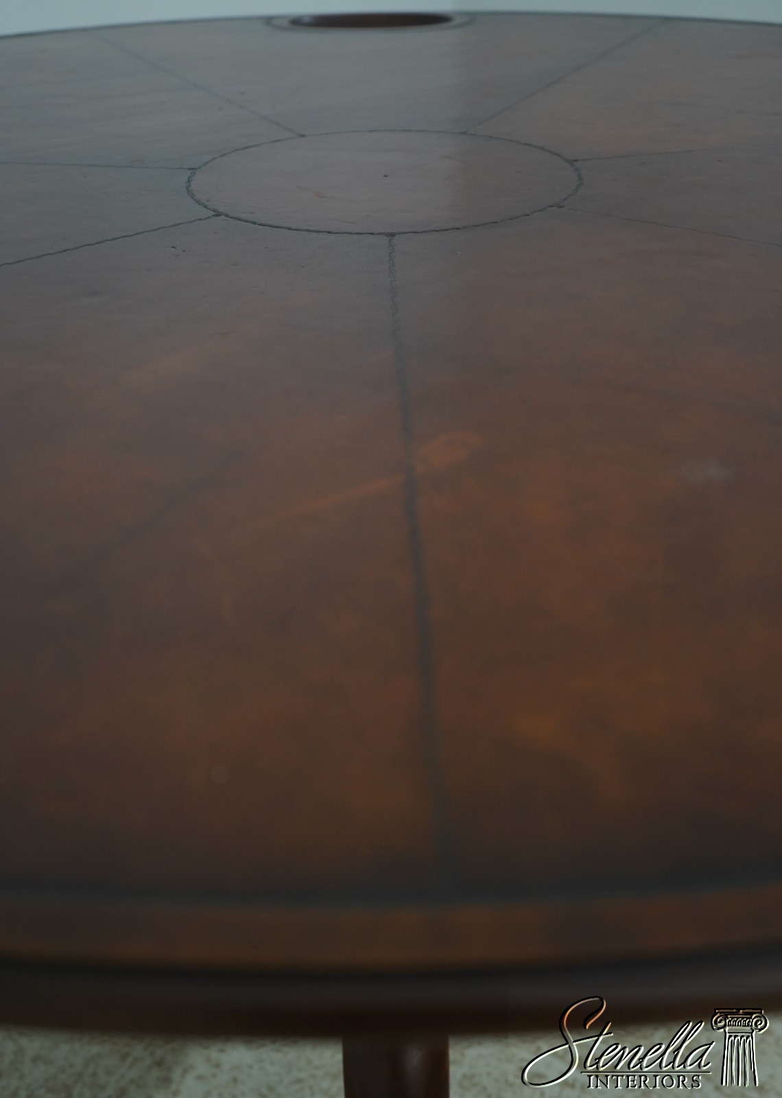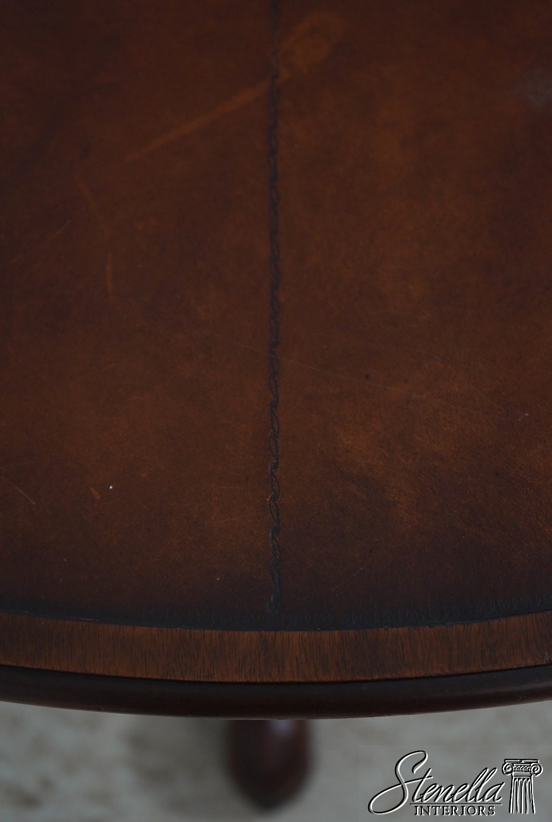 Round, embossed leather top and wide tripod base with cabriole legs and club feet