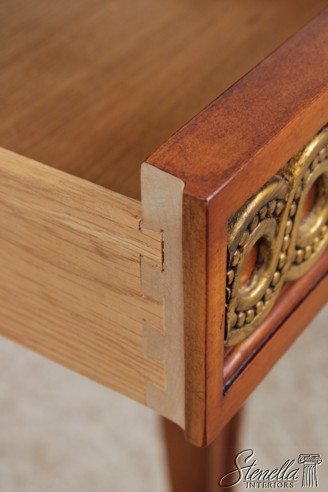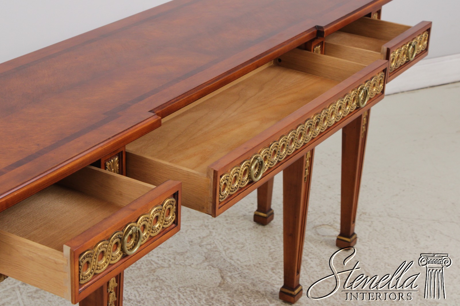 Details: Dovetailed Drawer Construction High Quality Construction Nice Inlay Work Throughout Solid Brass Hardware Italian Style Factory Distressed Offered At A Fraction Of The Original Retail Cost