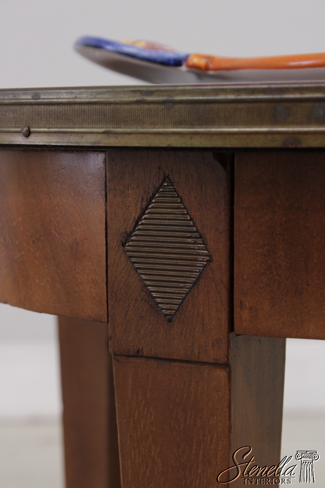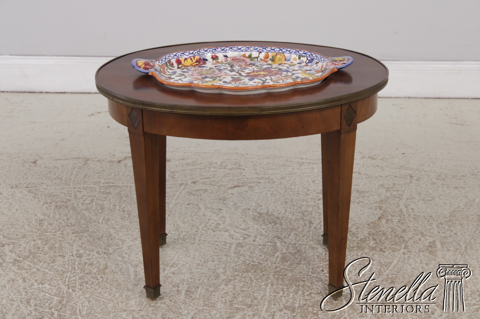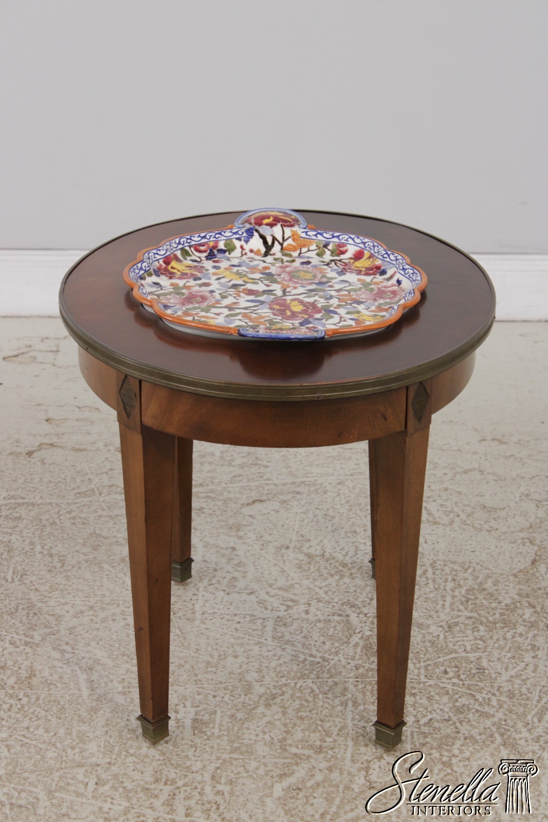 Details: Nice Vintage Table Mahogany Brass Capped Feet High Quality Construction Nice Inlay Work Throughout French Style Removable Ceramic Tray Brass Claw Edge Floral Motif Offered @ Fraction Original Retail Cost