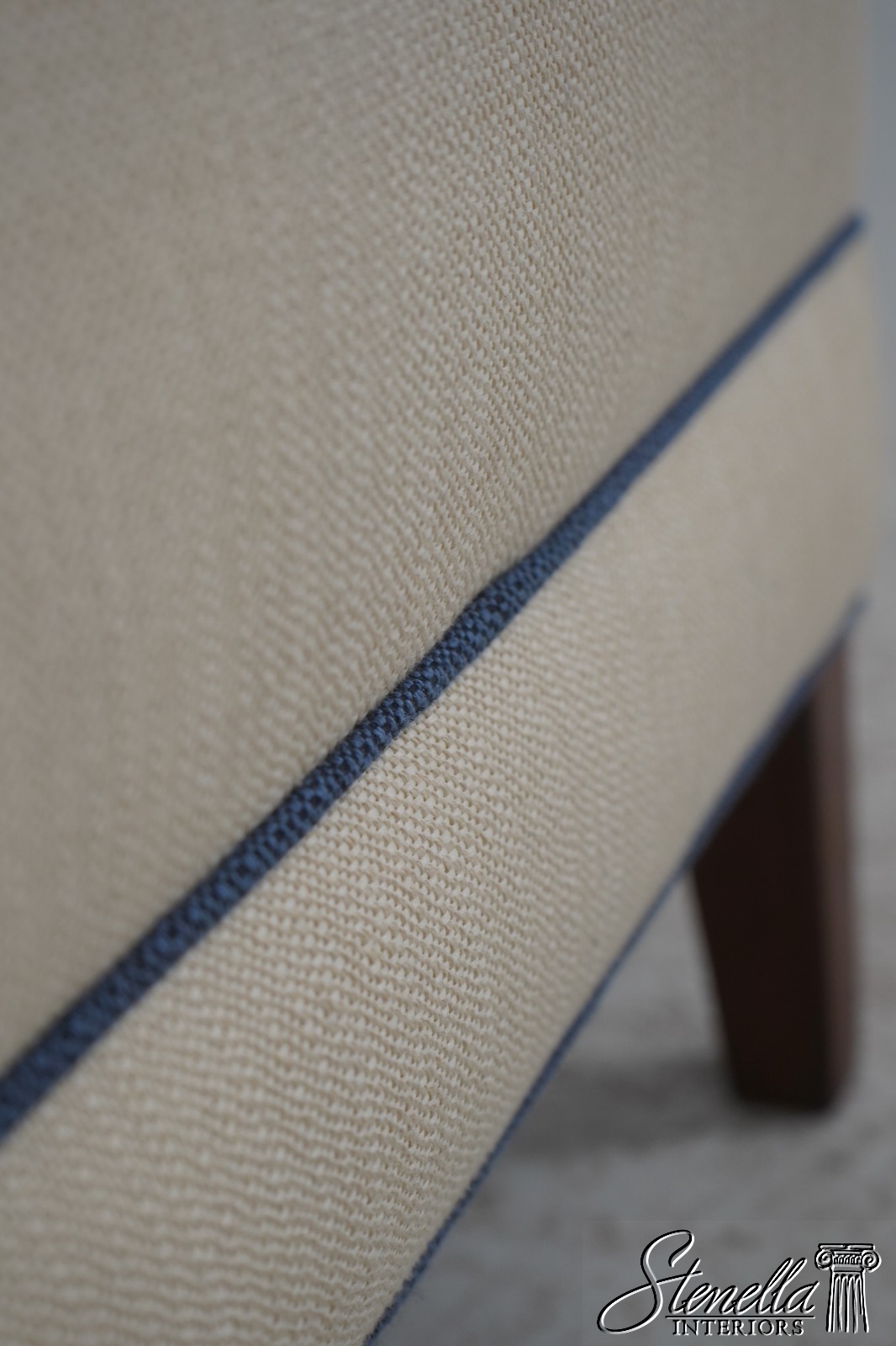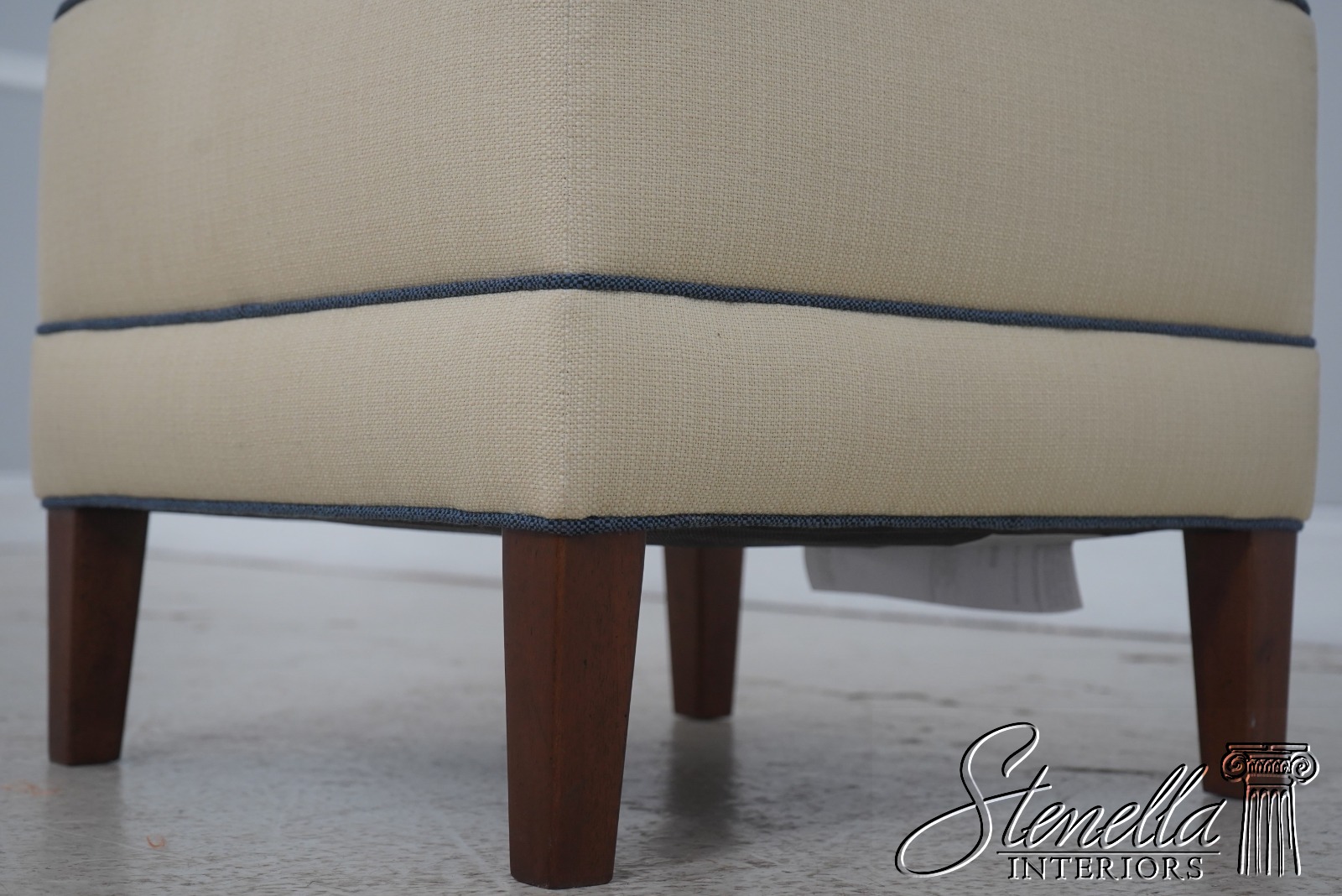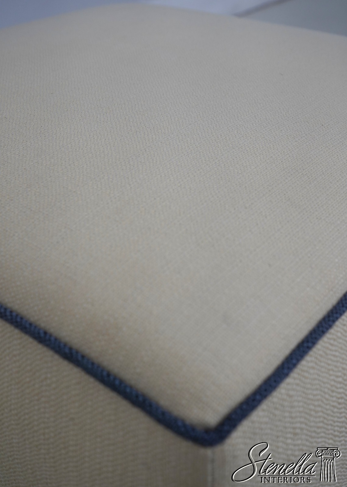 Details: Modern Design Quality Construction Covered In Quality Off White Fabric w. Blue Trim Clean Well Cared For Upholstery Buyer Could Also Add Wheels Or Casters If Desired Offered @ Fraction Original Retail Cost
