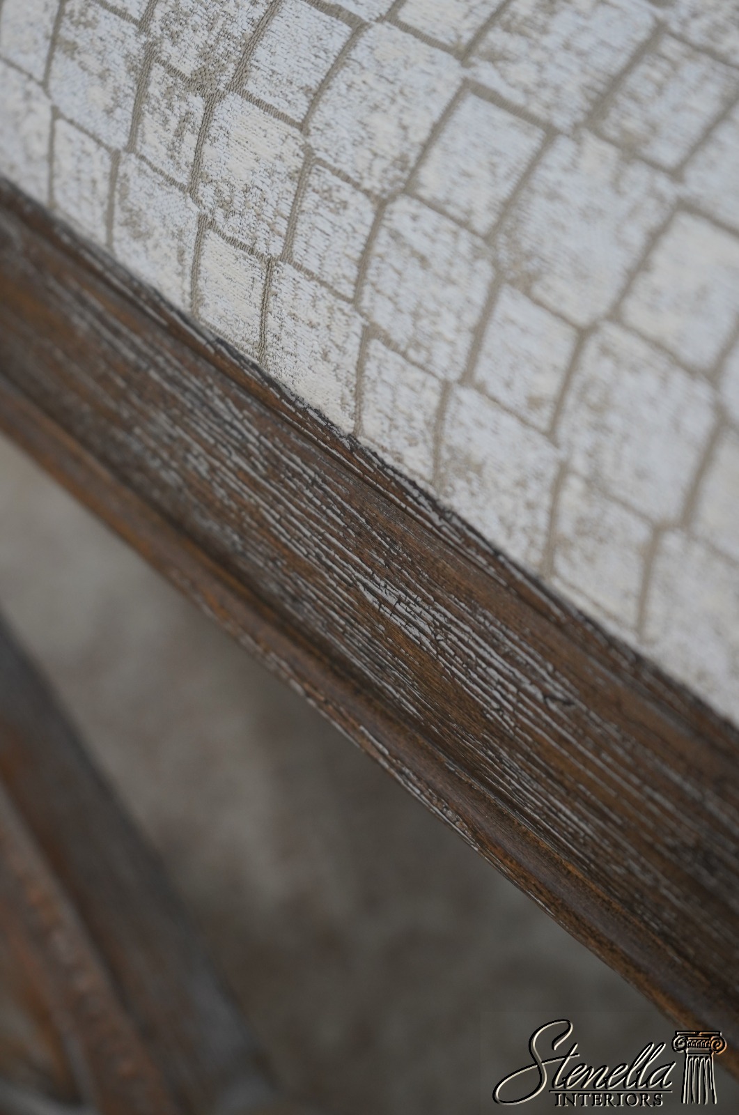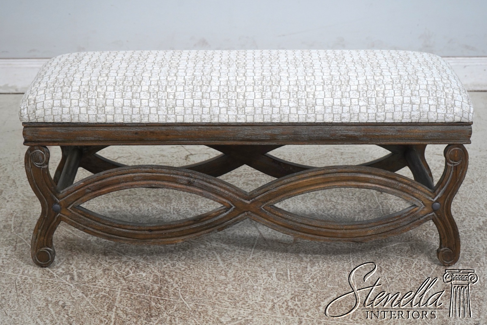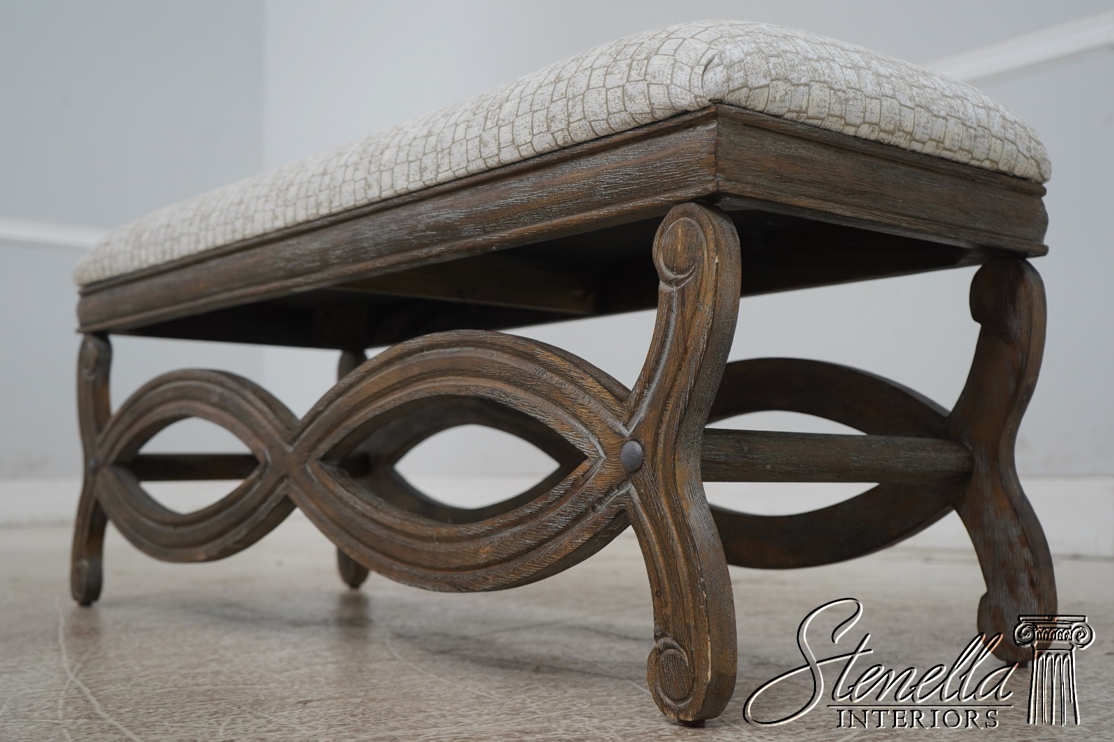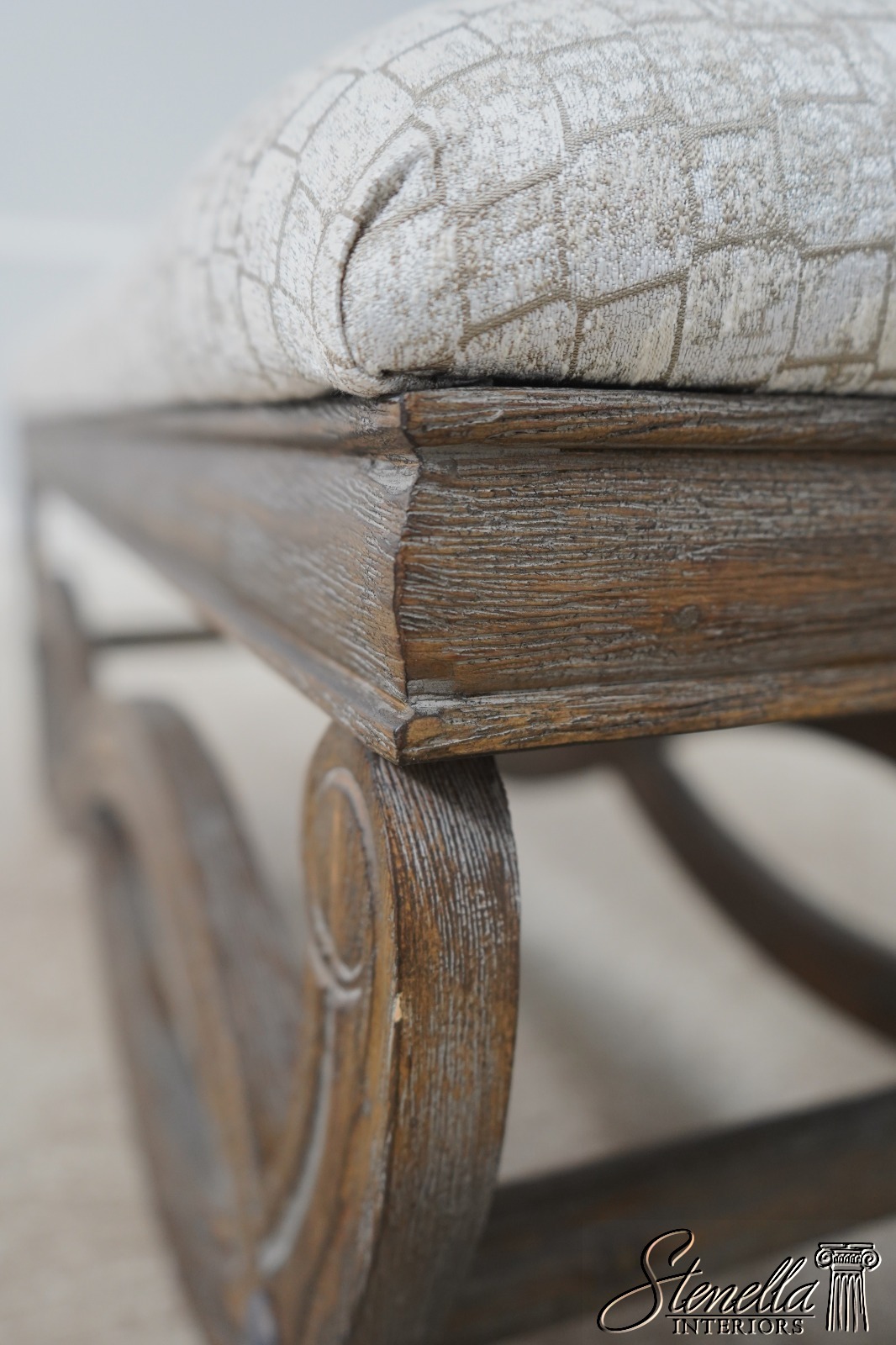 Details: Fine Carved Details High Quality Construction Traditional Style Stretcher Base Frame Un-Marked As To Manufacture - Possibly Restoration Hardware Or Similar Manufacture Brand New Upholstery Factory Weathered Wood Finish Offered @ Fraction Original Retail Cost
