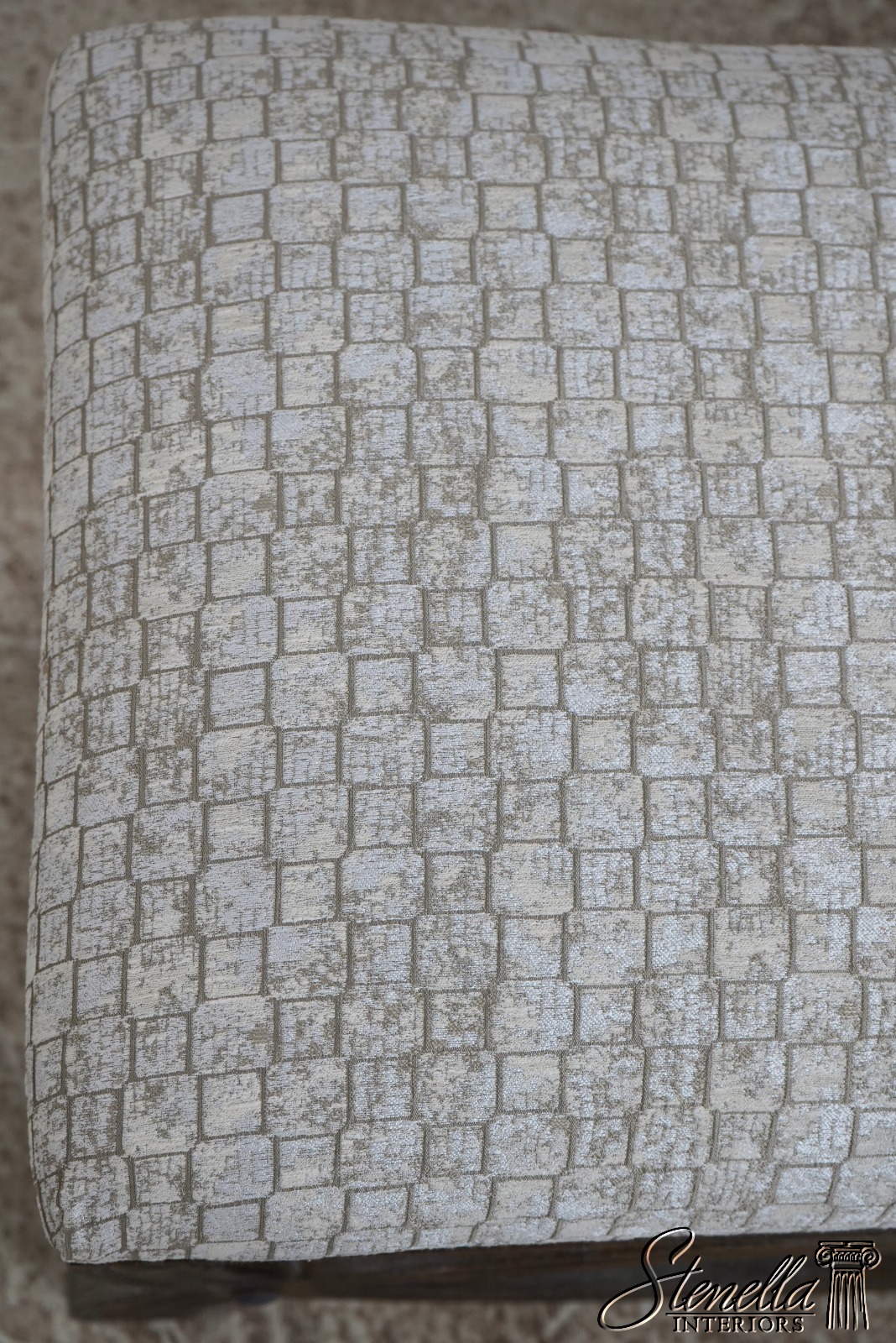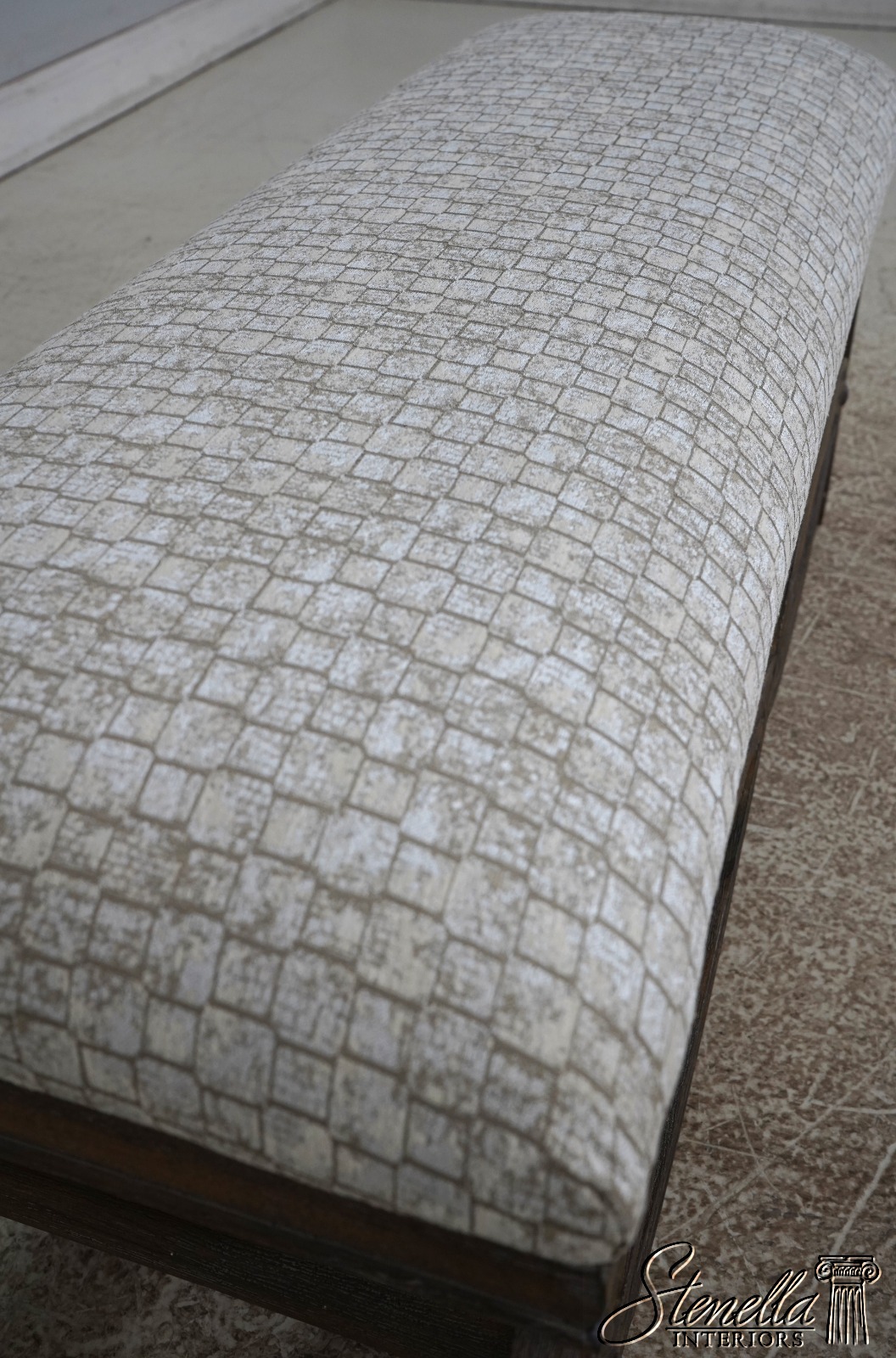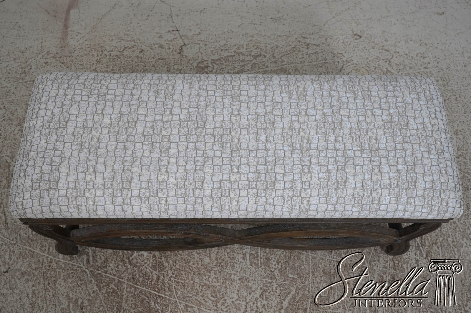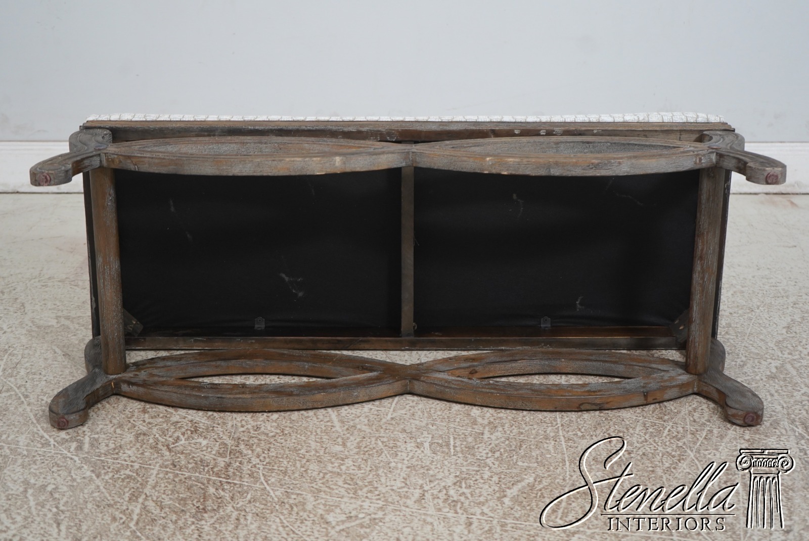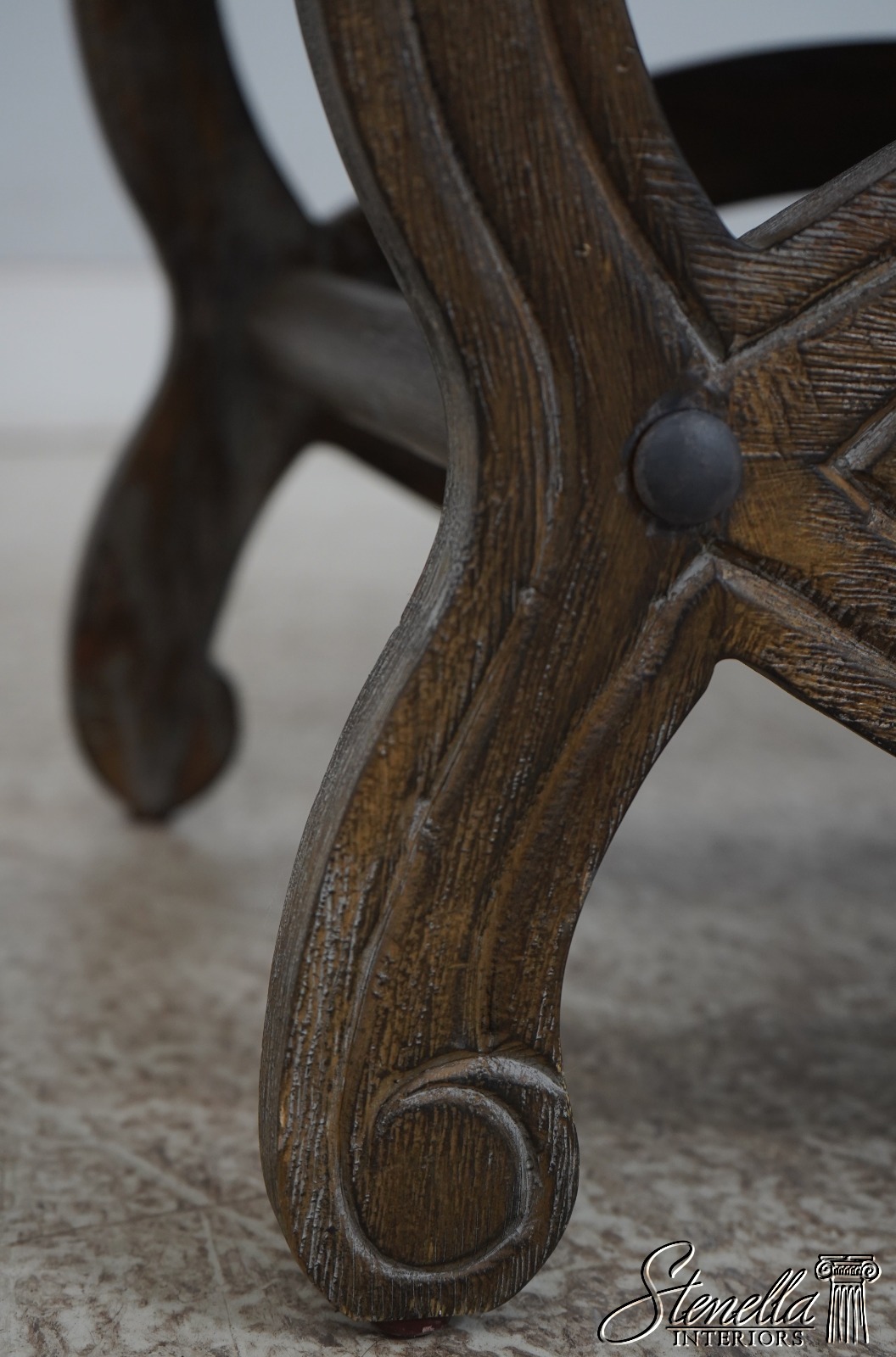 Details: Fine Carved Details High Quality Construction Traditional Style Stretcher Base Frame Un-Marked As To Manufacture - Possibly Restoration Hardware Or Similar Manufacture Brand New Upholstery Factory Weathered Wood Finish Offered @ Fraction Original Retail Cost