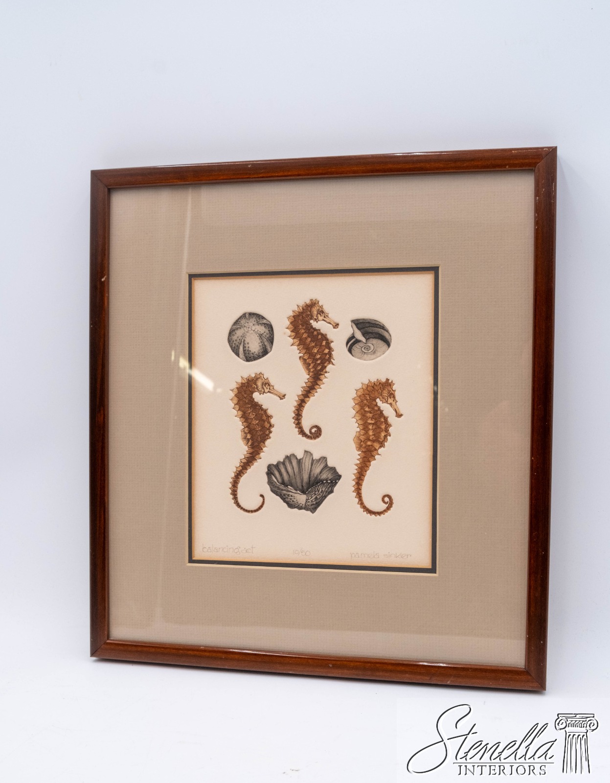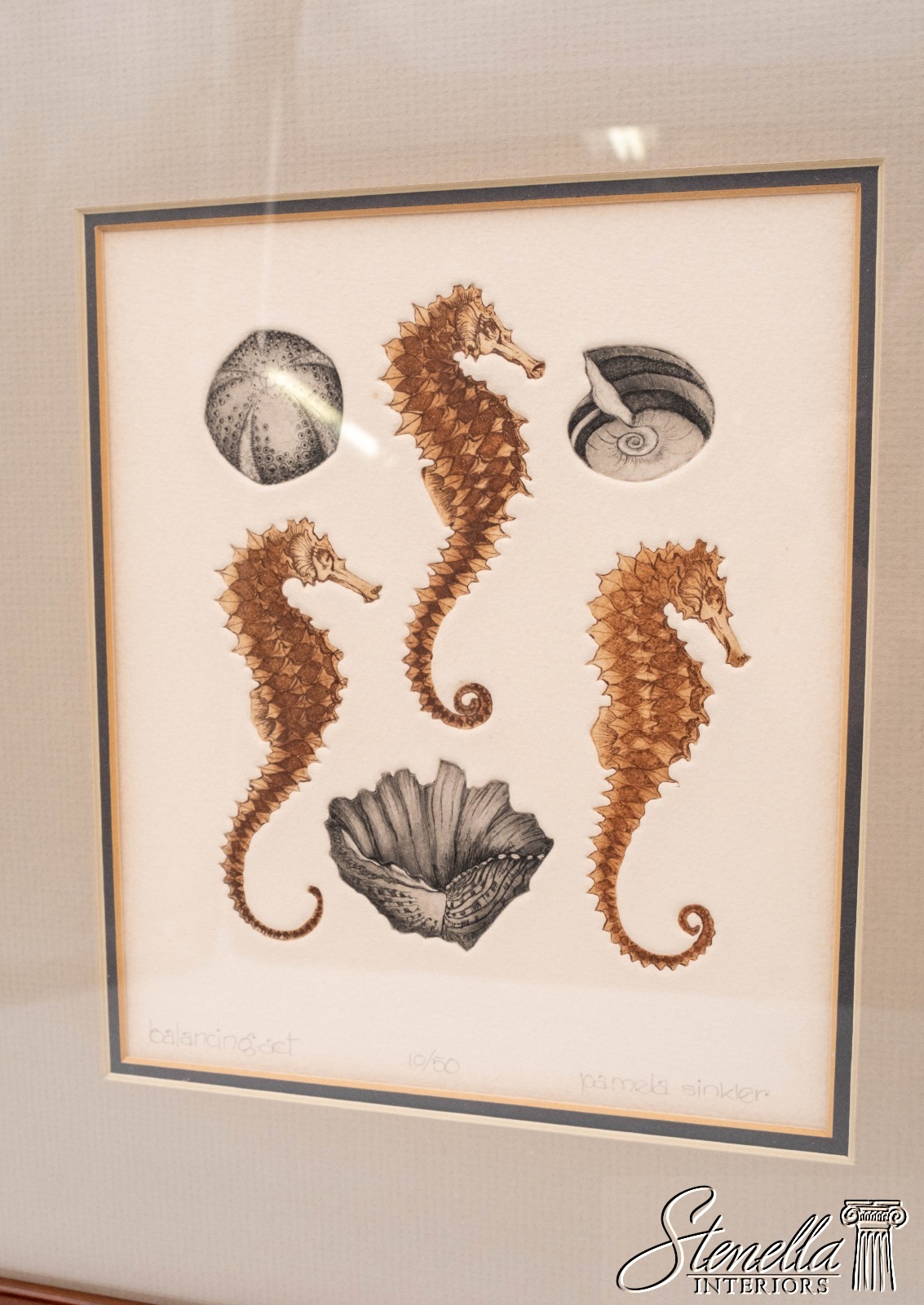 Details: Artwork depicting seahorses, mollusk shell, sea snail shell and sea urchin. Signed and numbered (10/50). Pamela Sinkler (1938-) has been a working artist living in the Philadelphia area since the 1970s. She has worked in intaglio etching, watercolor, pastels, pencil and oil, and has won prizes at juried and invitational shows.