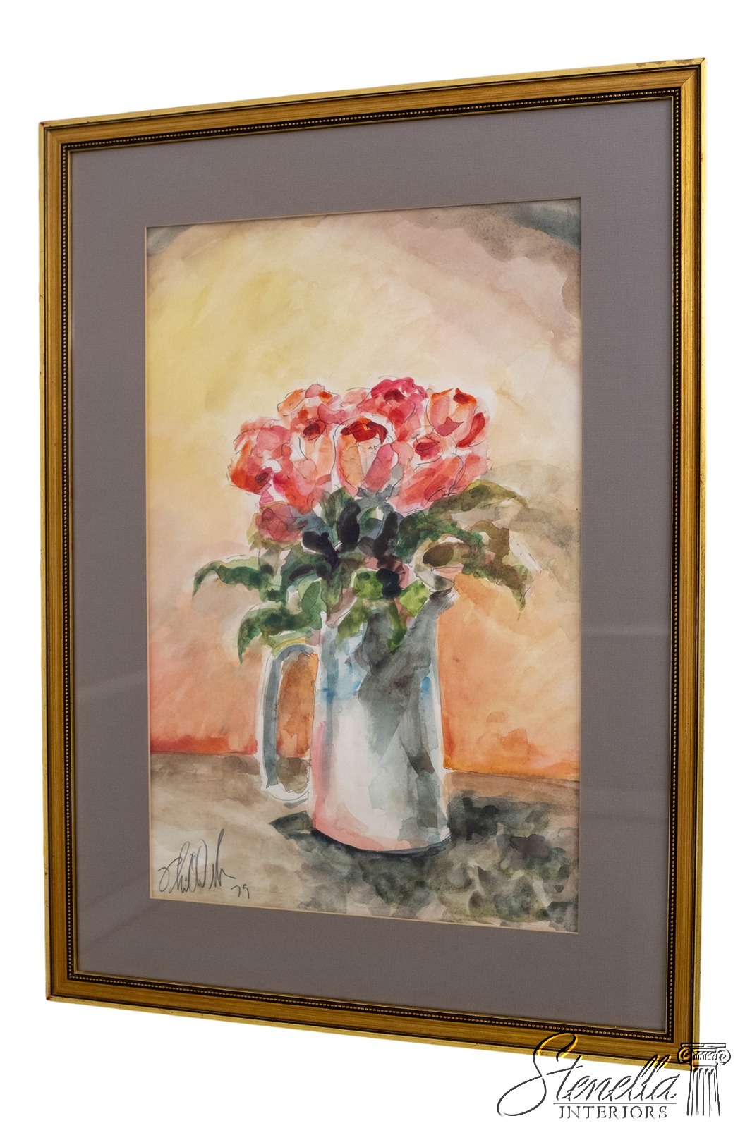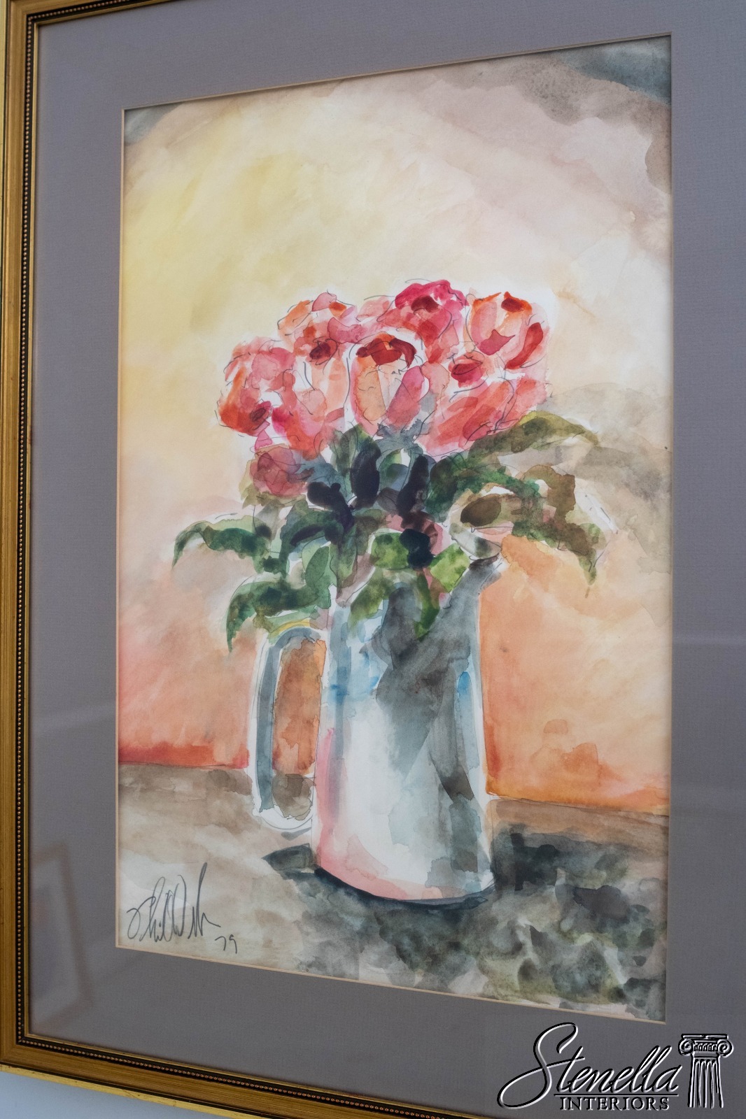 F69234: Abstract Red Roses In Pitcher Watercolor Painting Signed