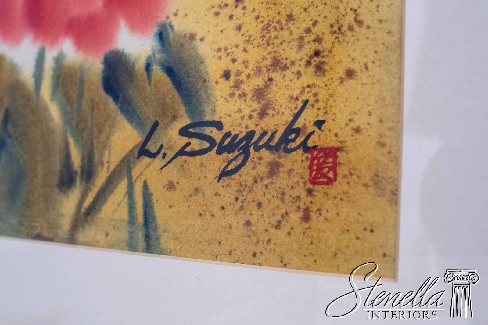 Details: Bold colors and deft strokes depicting a tall bunch of flowers with a gold tone frame. Professionally framed and matted. Signed L. Suzuki. Iwao Lewis Suzuki (1920-2016) was a Japanese-American artist known for his watercolors, particularly cityscapes, seascapes, rural scenes, and still life florals, often executed in the "wet-into-wet" style.