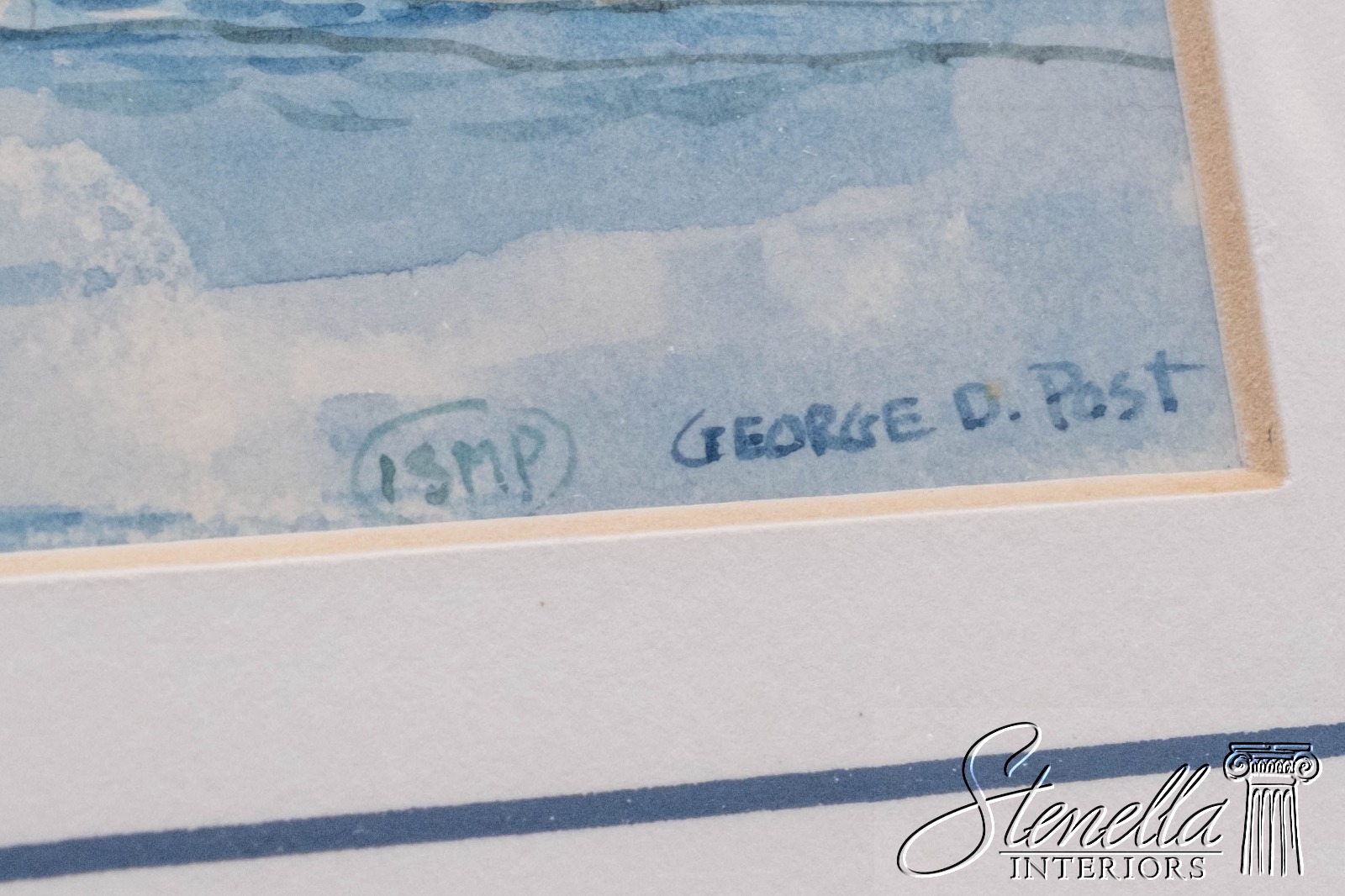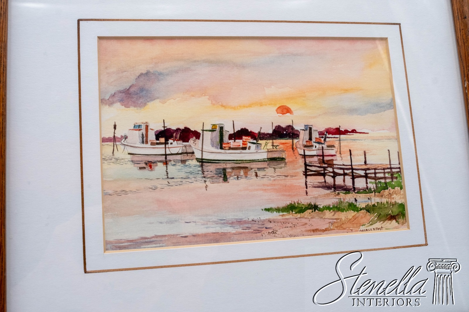 Details: Moored fishing boats at sunset and boat heading out to sea. George D. Post (1906-1997), also known as George Booth Post, was an American watercolorist and art educator known for his contributions to the California School of Watercolor. Other painting 11 x 1 x 7.5
