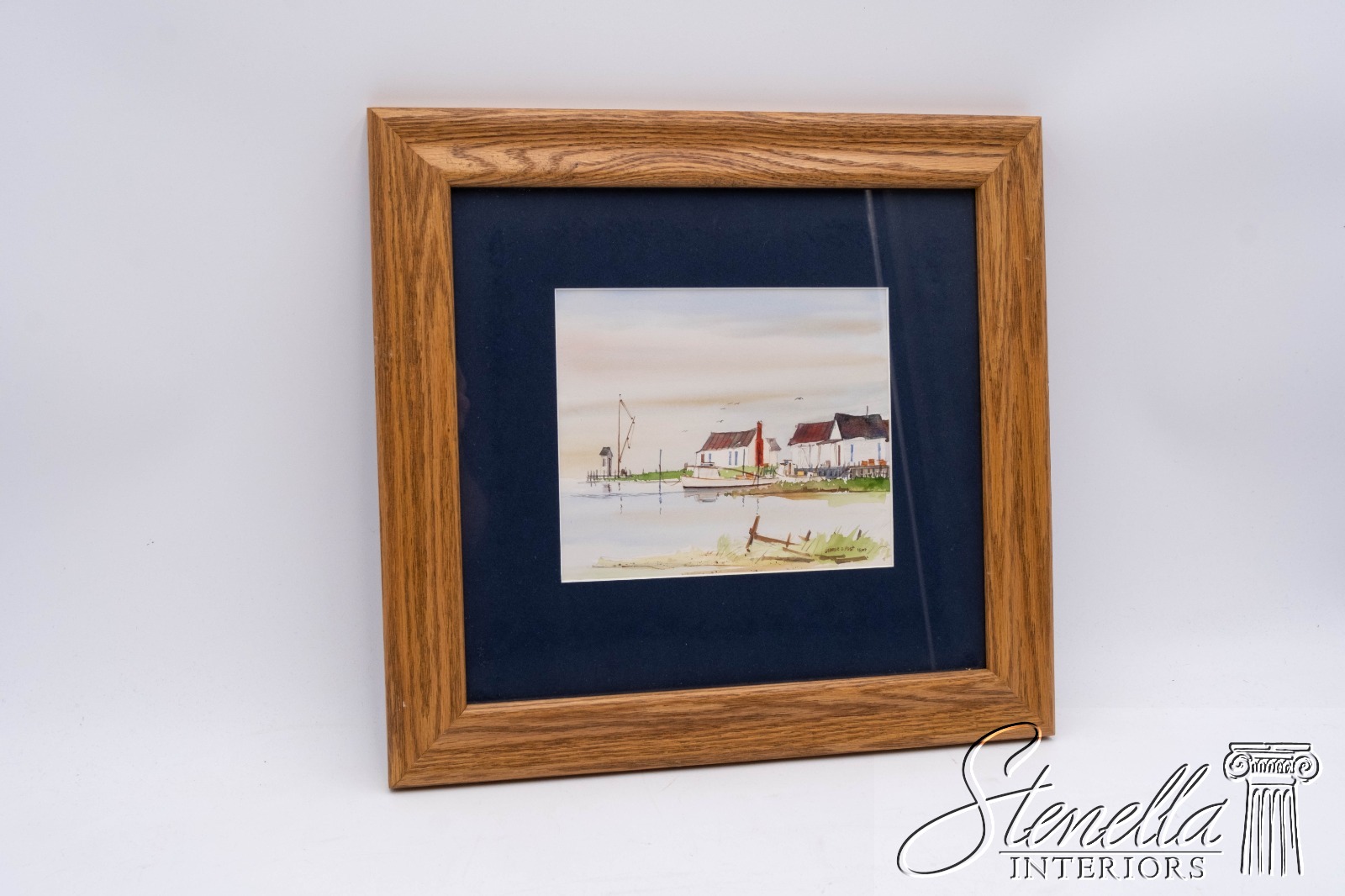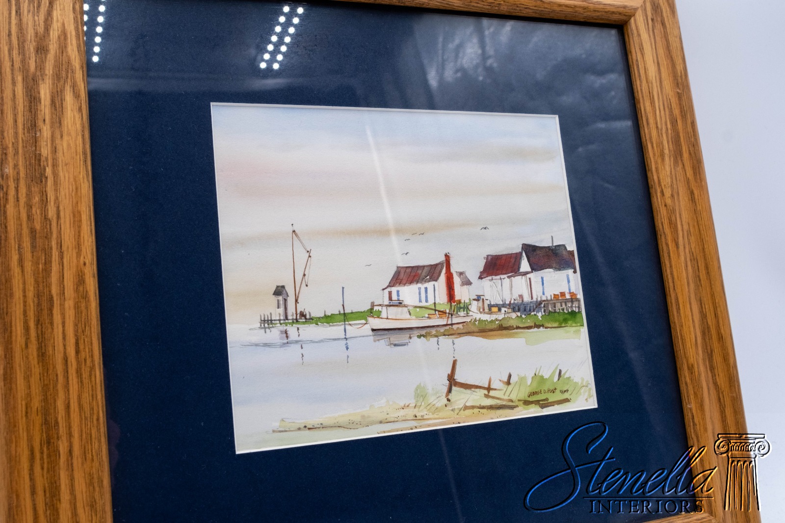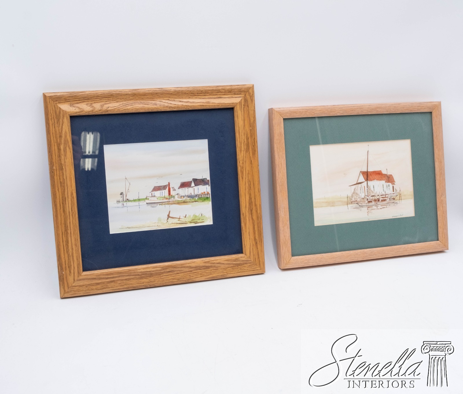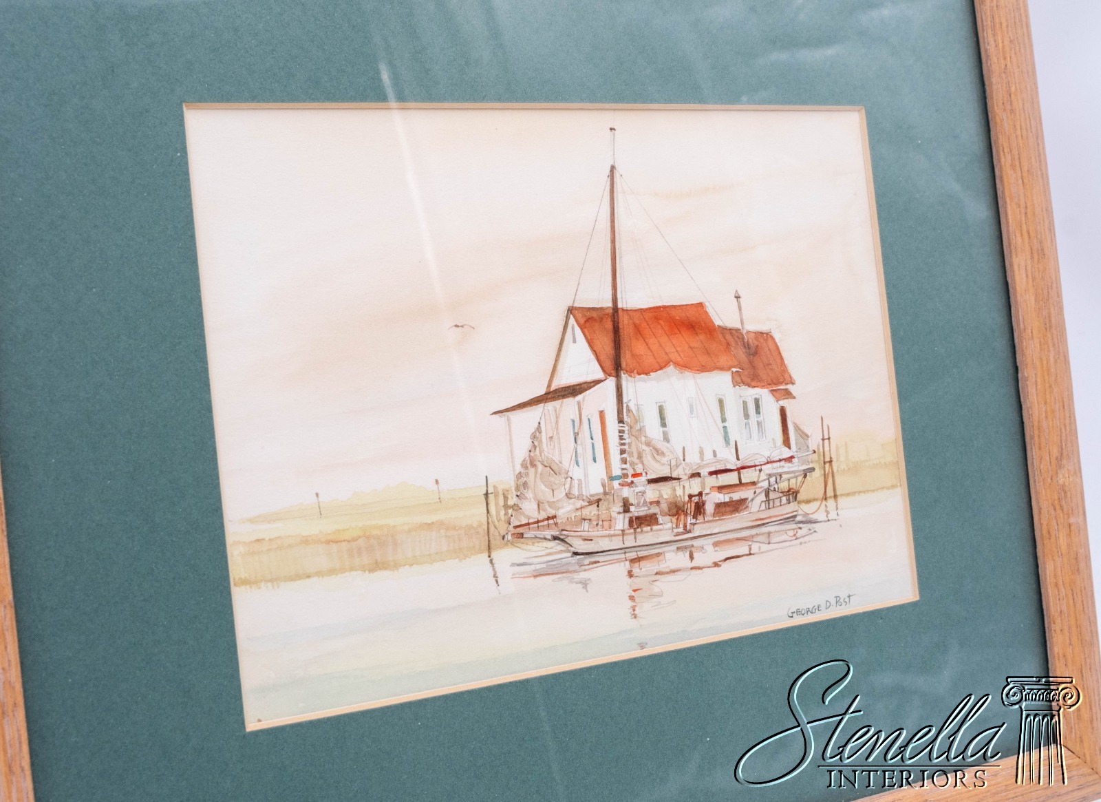 F69314: Pair of Nautical Watercolor Stilt Homes Sailboats Paintings Signed George D Post